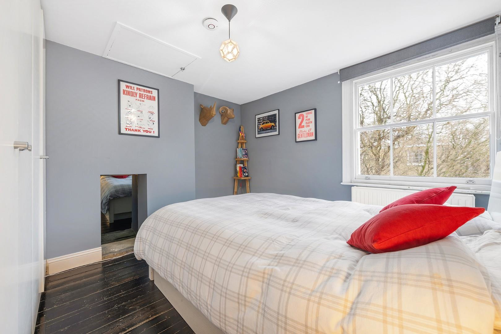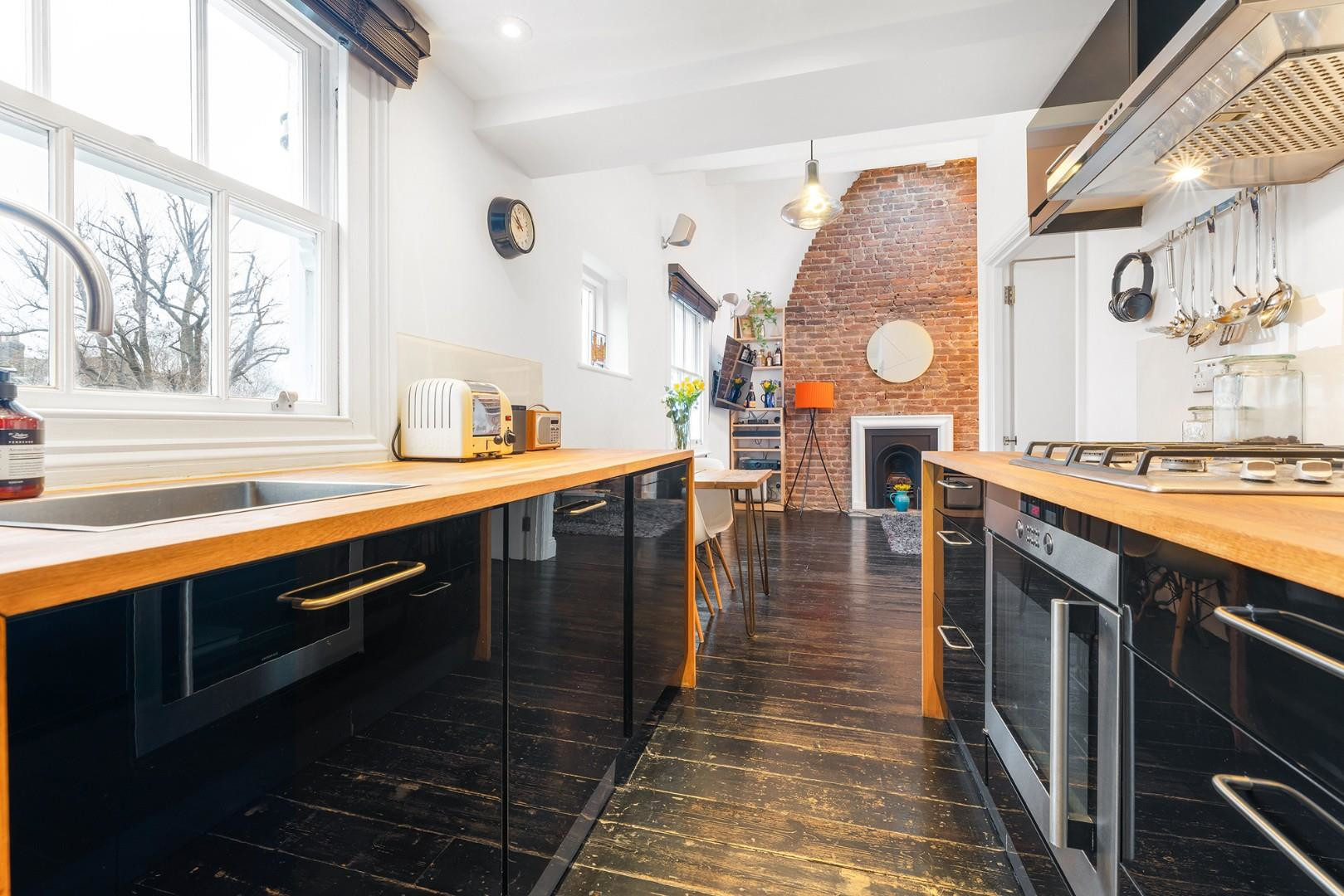 The heart of the home is the open-plan reception, full of character, featuring exposed brickwork from the original top-floor fireplace, which creates a beautiful feature wall. A charming alcove with shelving provides space for books. The room is enhanced by a feature fireplace and a high vaulted ceiling, complete with a remote-controlled skylight that floods the space with natural light. A brand-new column radiator adds both warmth and contemporary appeal, complementing the room’s stylish aesthetic. There is ample space to relax or entertain, as well as a designated area for dining, making this a versatile and inviting living space.