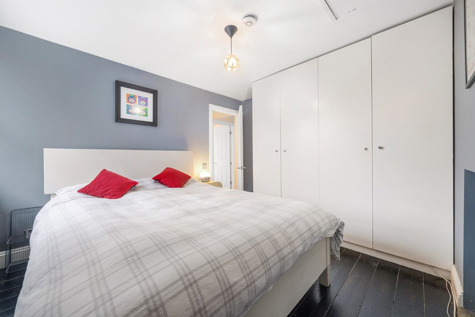 The principal bedroom, painted in a calming blue tone, offers a serene retreat. Built-in wardrobes provide generous storage, while a sash window frames leafy views, bringing a touch of nature indoors. Loft access is conveniently located via a hatch, revealing a large space perfect for additional storage. The second bedroom also benefits from fitted wardrobes and abundant natural light, offering a flexible space for guests, or a home office.