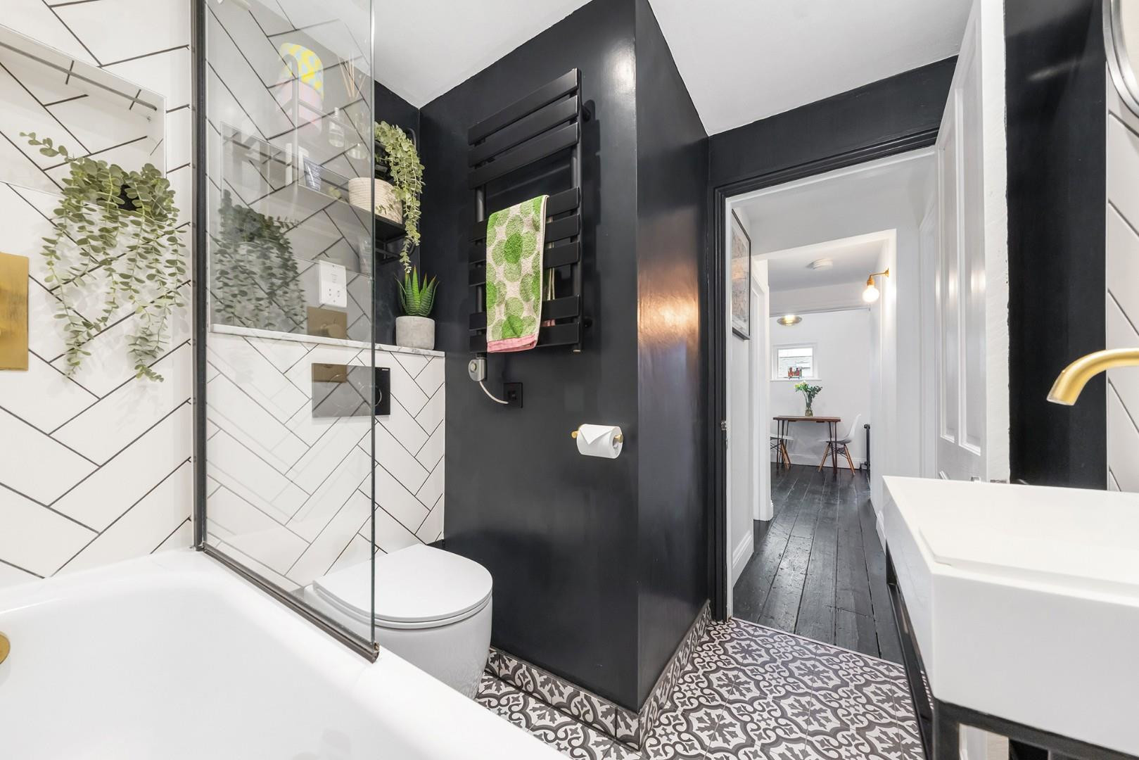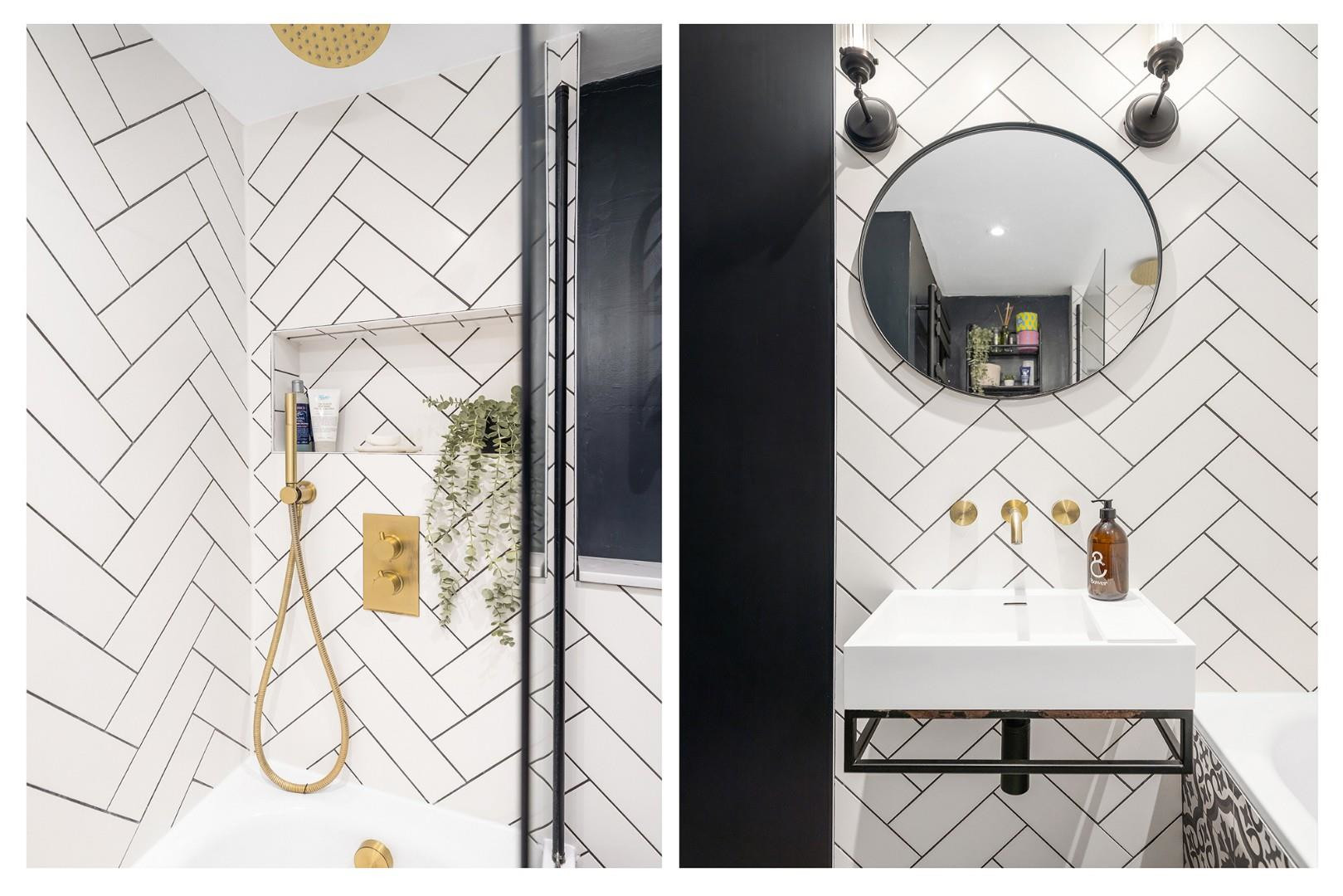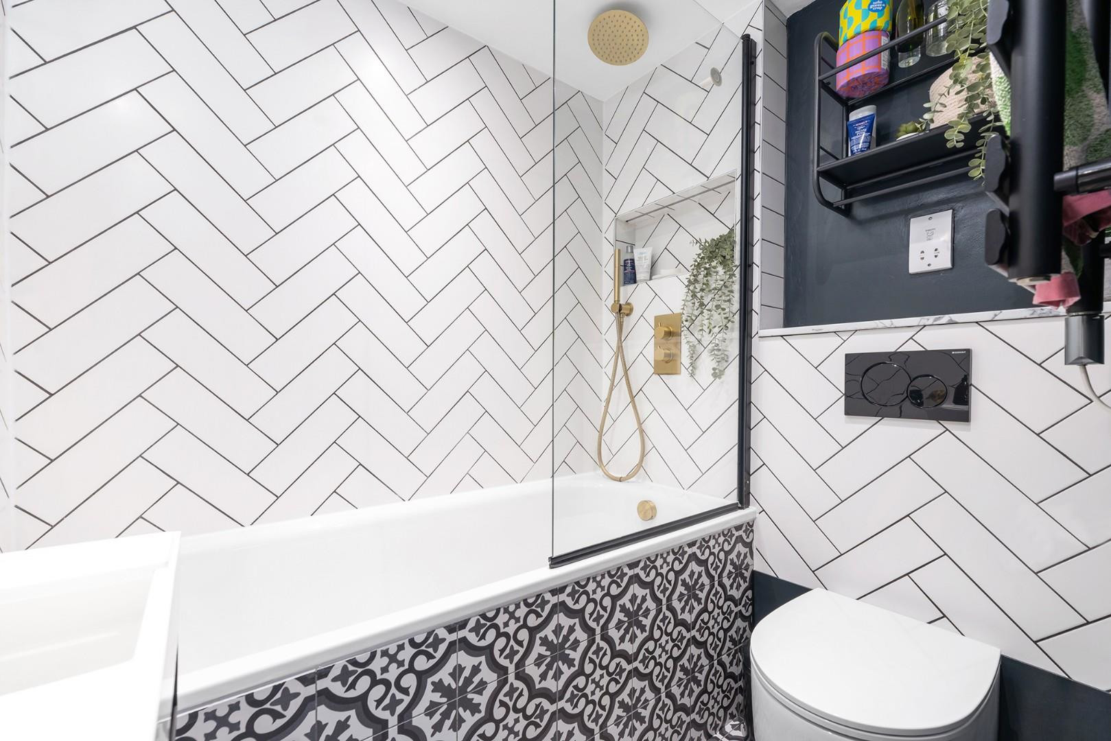 The bathroom is a statement of modern elegance, recently renovated with white herringbone tiles contrasted by geometric designs. Underfloor heating keeps the room warm and comfortable, while gold-coloured fixtures, including a rainfall shower over the bath and a hand-held shower, create a luxurious feel. A matte black heated towel rail completes the sophisticated look.