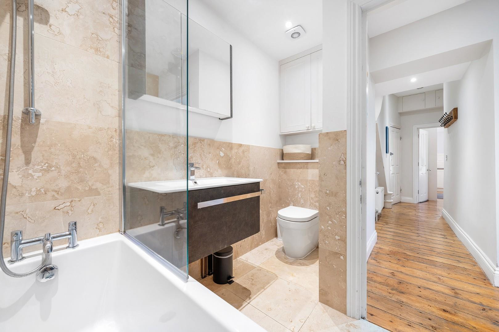 The stylish family bathroom is finished with large marbled tiles, fitted storage and a shower over the bathtub, combining elegance with everyday functionality.