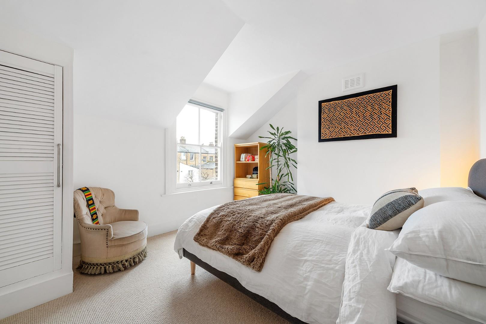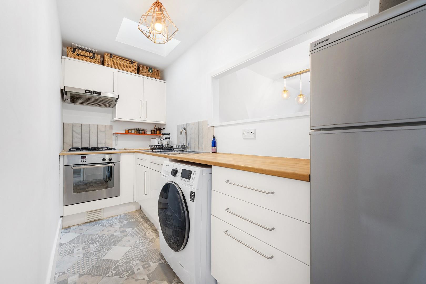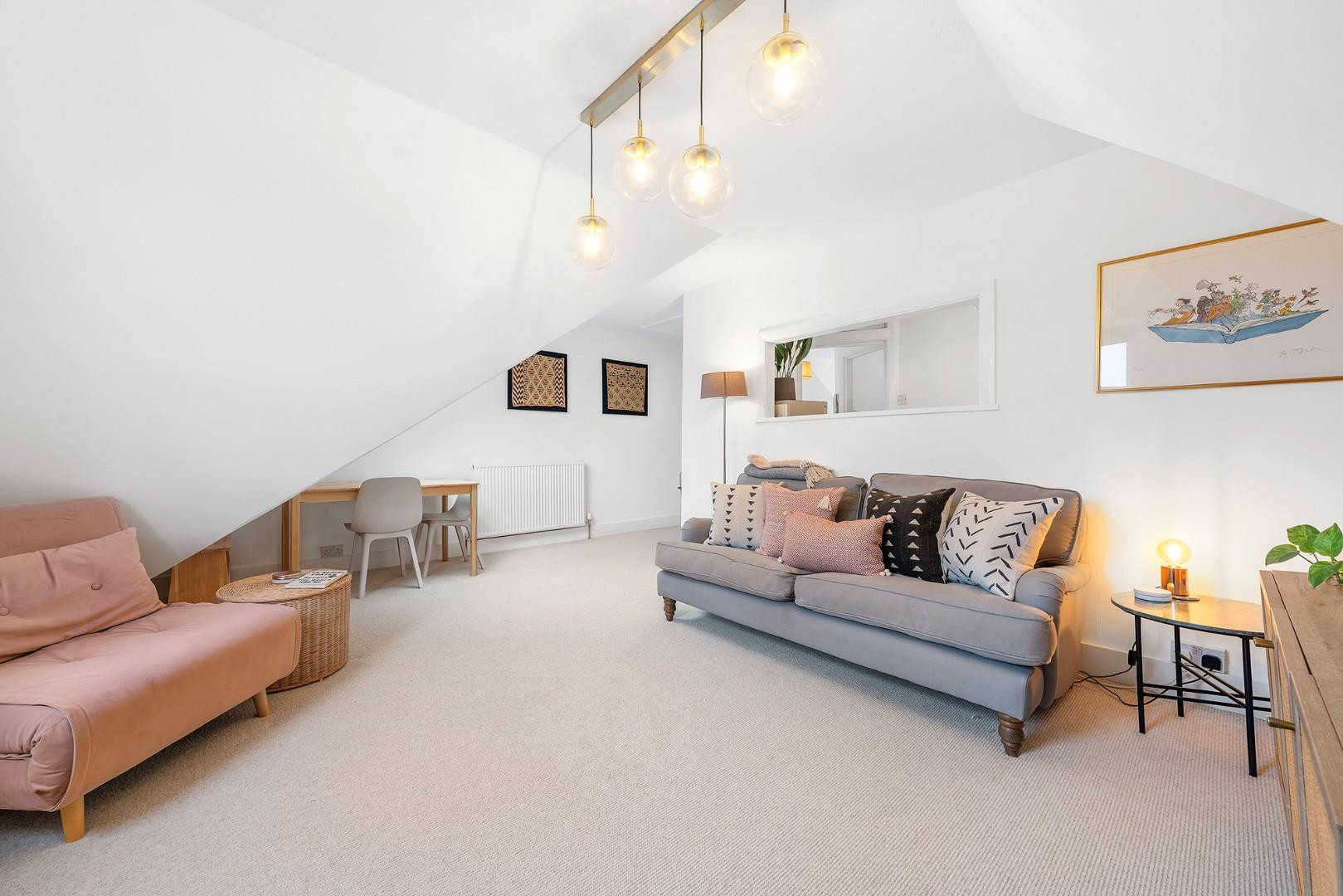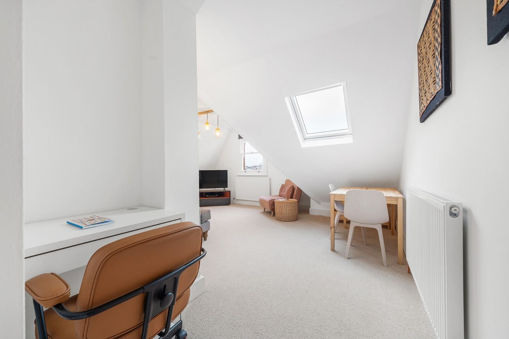 Set on the top floor, the apartment enjoys a bright and private aspect. The reception room is an inviting space with charming lofted ceilings and generous proportions, easily accommodating both lounging and dining. A handy nook by the entrance provides an ideal study area, while the neutral décor is enhanced by a row of contemporary pendant lights running through the centre of the room. The kitchen sits adjacent beneath a skylight. A large serving hatch opens into the reception room, creating a sociable environment while keeping the practicalities neatly separate. Neutral cabinetry offers ample storage, paired with wooden worktops and softly toned feature flooring.