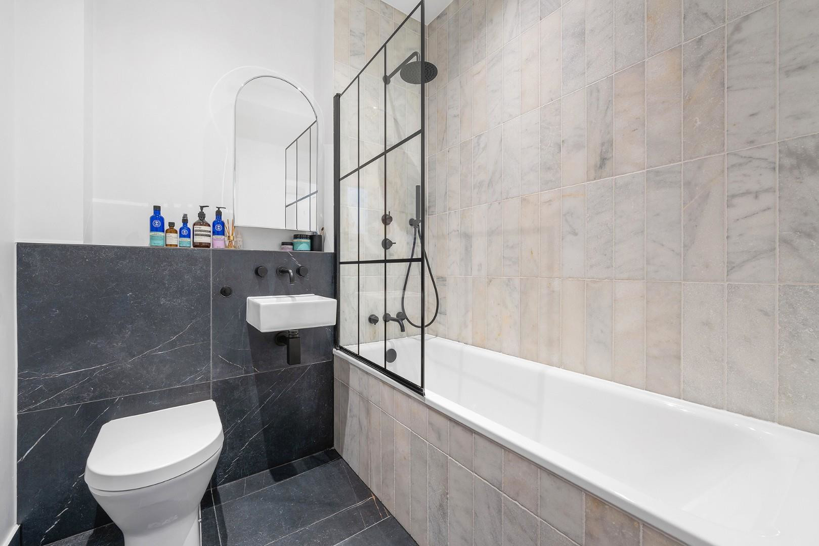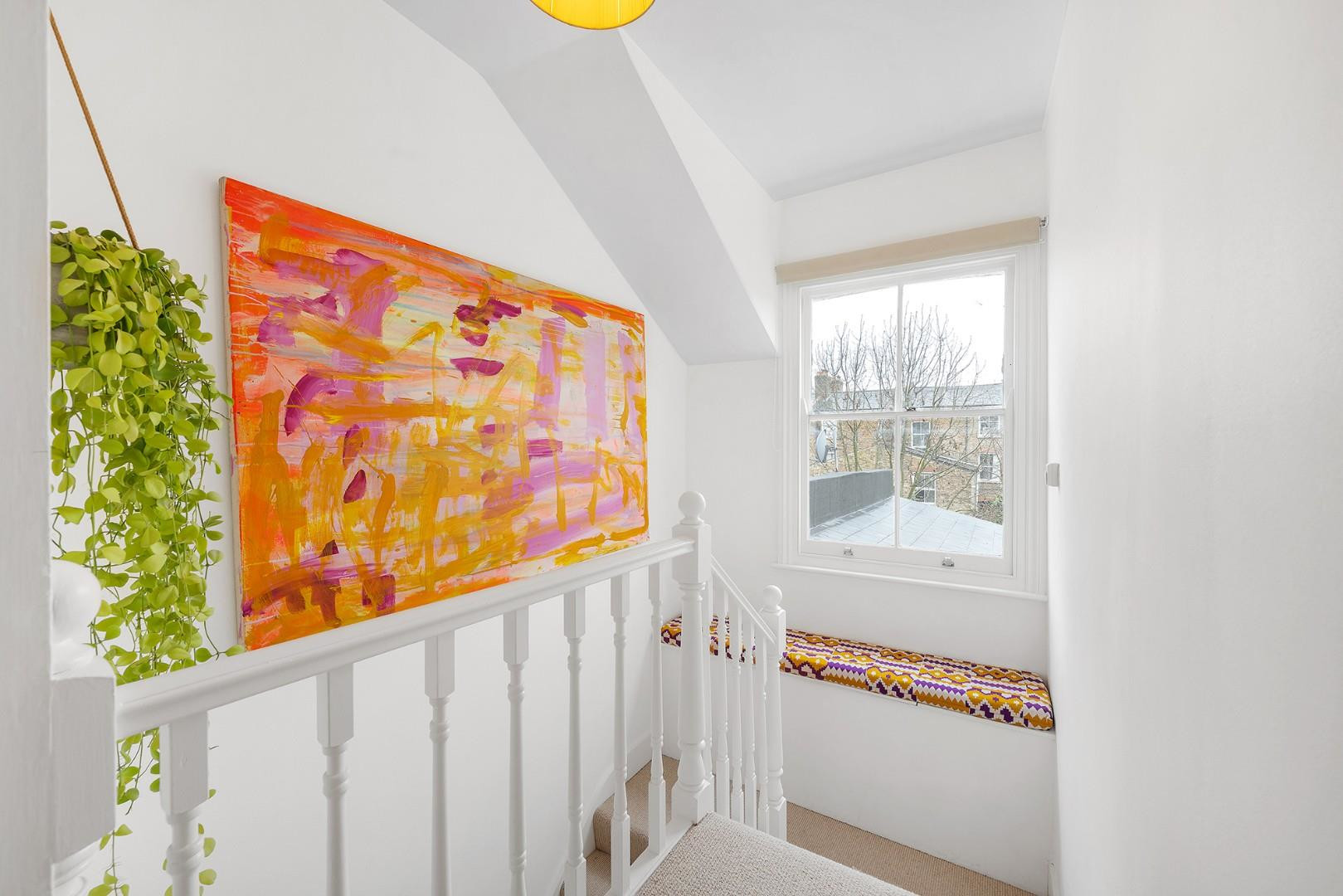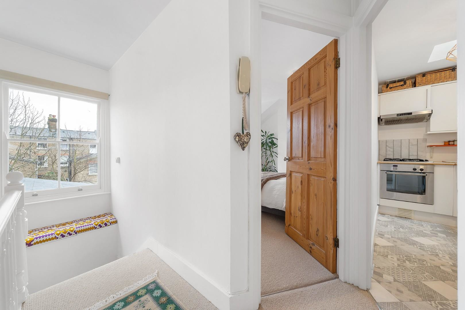 The bedroom is peacefully nestled to the rear of the property, promoting a tranquil night’s sleep away from the already quiet street. Leafy views, elegant wool carpets and a fitted wardrobe complete this calm and comfortable retreat. A charming spindle staircase leads to the landing, where a large window creates a bright and airy transition space, complete with a delightful window seat perfect for reading. The bathroom is tastefully finished with large slate-grey tiles contrasted by soft neutrals, featuring a bathtub with overhead shower, Crittall-style shower screen and sleek black fittings.