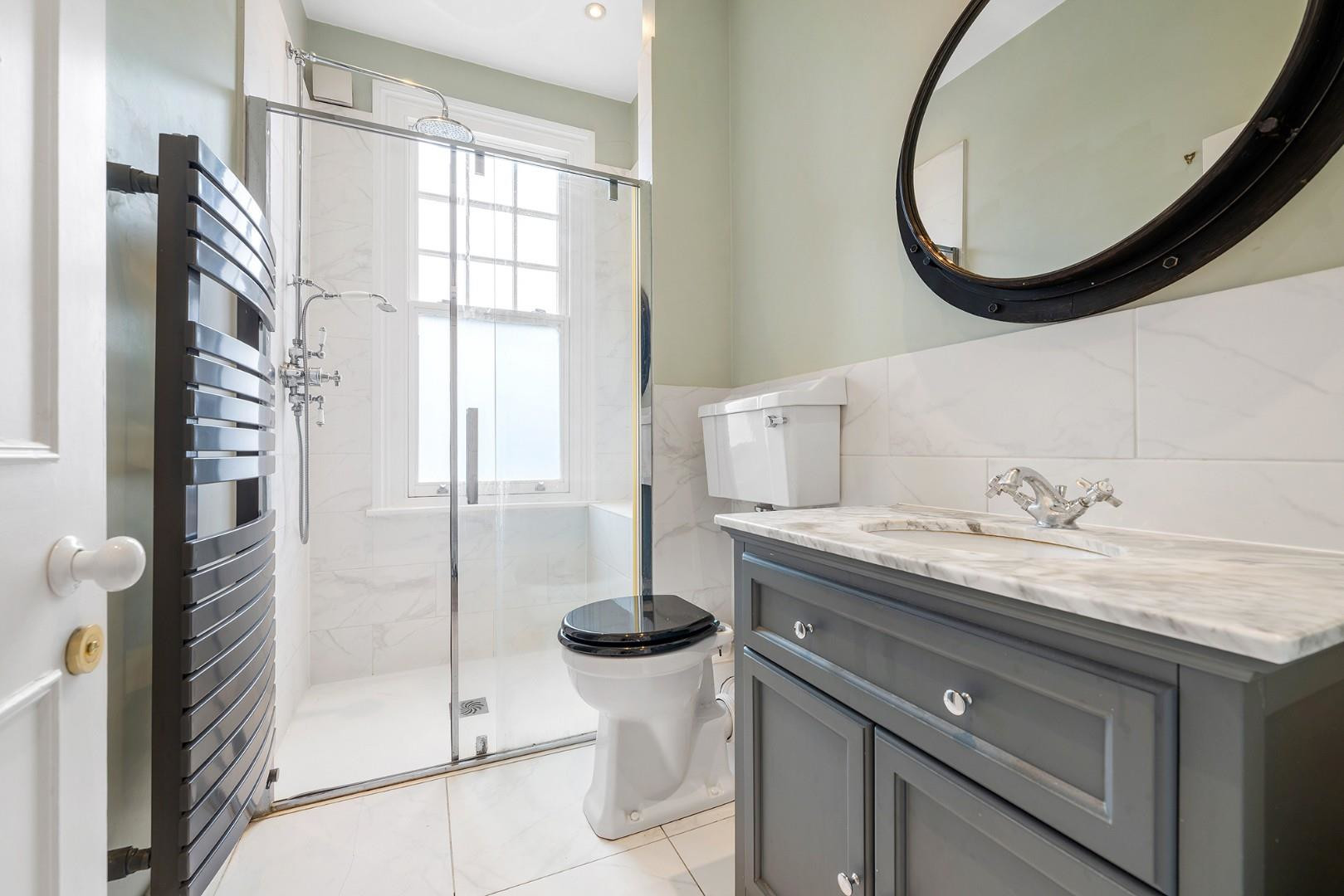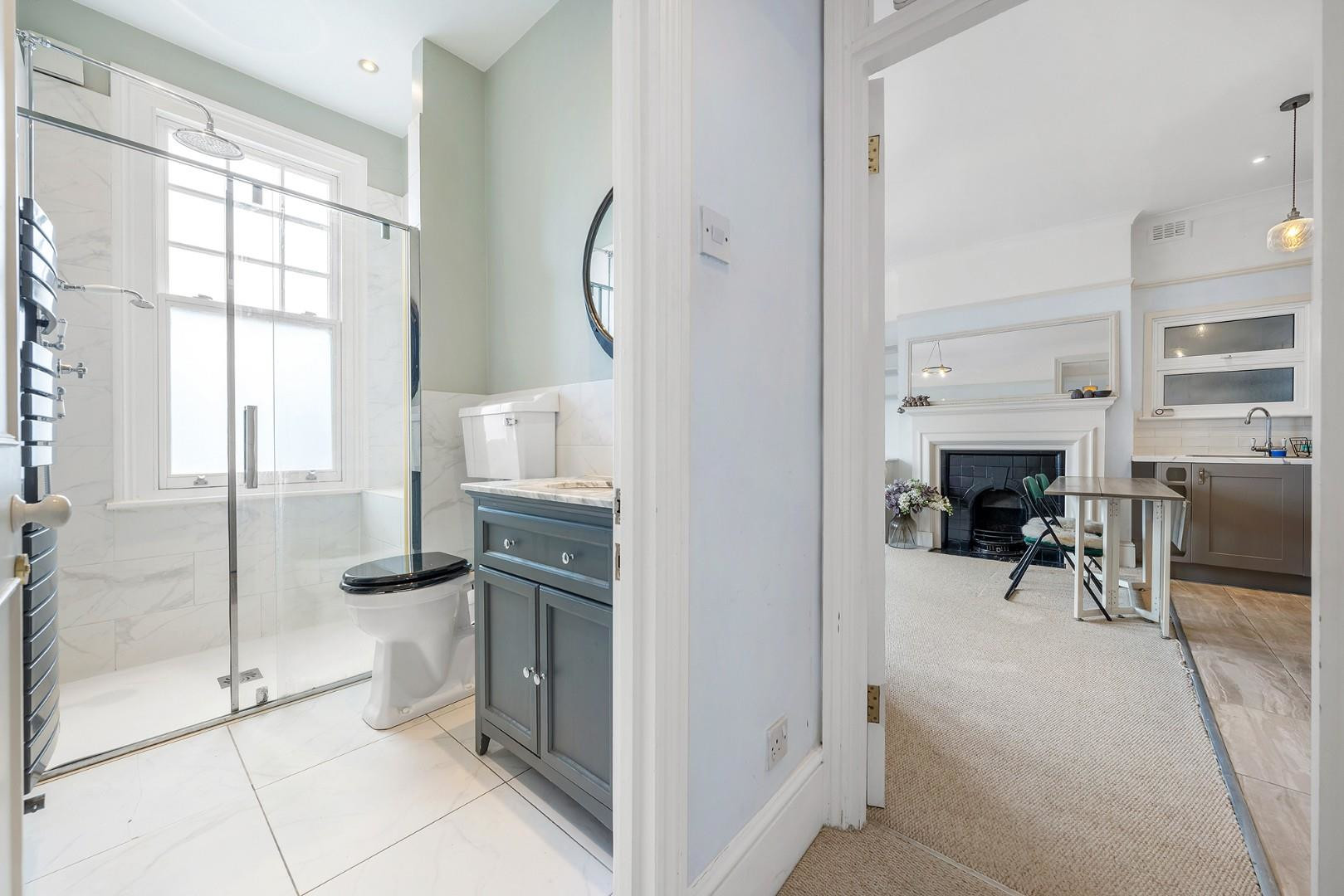 The double bedroom is generously proportioned, enjoying two sash windows and extensive fitted storage cleverly framing the bed. Centrally located within the home, the bathroom is smartly finished with a contemporary walk-in shower. The layout has been carefully considered to maximise space, with minimal corridors and an excellent sense of flow.