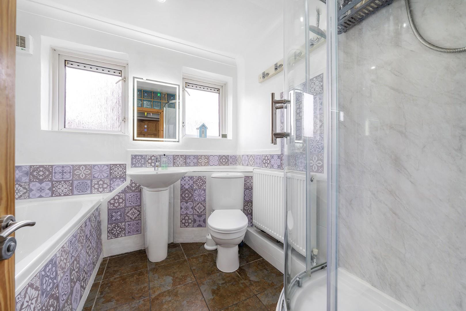 The three bedrooms are positioned to the opposing side of the home, offering a sense of privacy and separation from the entertaining space. The principal bedroom is particularly spacious, enjoying a Southerly aspect and large windows that enhance the bright and airy atmosphere. There is ample room for traditional bedroom furnishings, with space remaining for a desk or dressing table if desired. The second bedroom is a comfortable double, complete with fitted storage. The third bedroom is versatile and currently arranged as an additional bedroom, though it could easily be repurposed as a home office or space to suit individual needs. A generous family bathroom serves the apartment, equipped with a bathtub and separate shower, and finished in charming purple tiling.