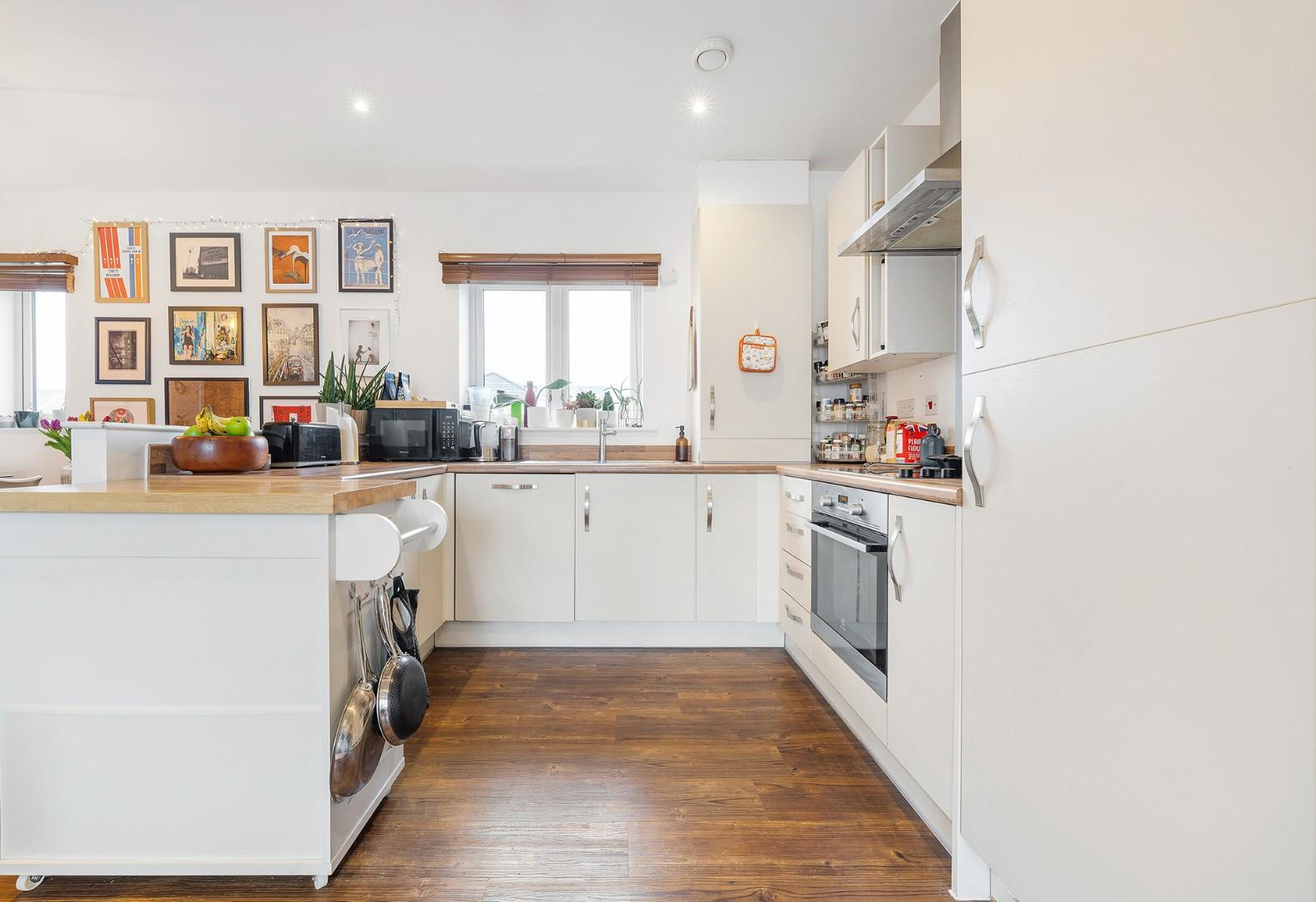 The kitchen is neatly arranged in a practical U-shape with generous worktop space. Integrated appliances are seamlessly incorporated within sleek cabinetry, and thoughtful storage solutions make excellent use of the layout. A window above the sink allows additional light to pour in, further enhancing the bright and airy feel of the room.