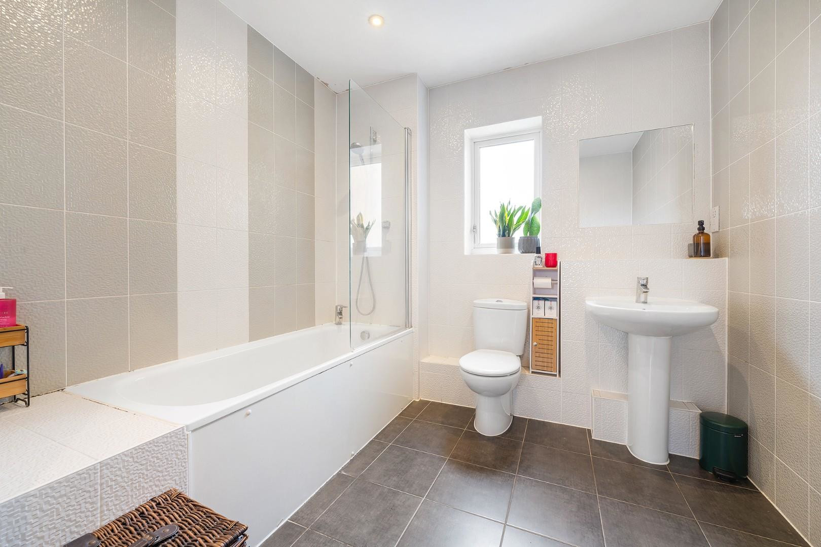 The bathroom features a full-sized bath with an overhead shower and glass screen, complemented by contemporary tiling and modern sanitaryware.