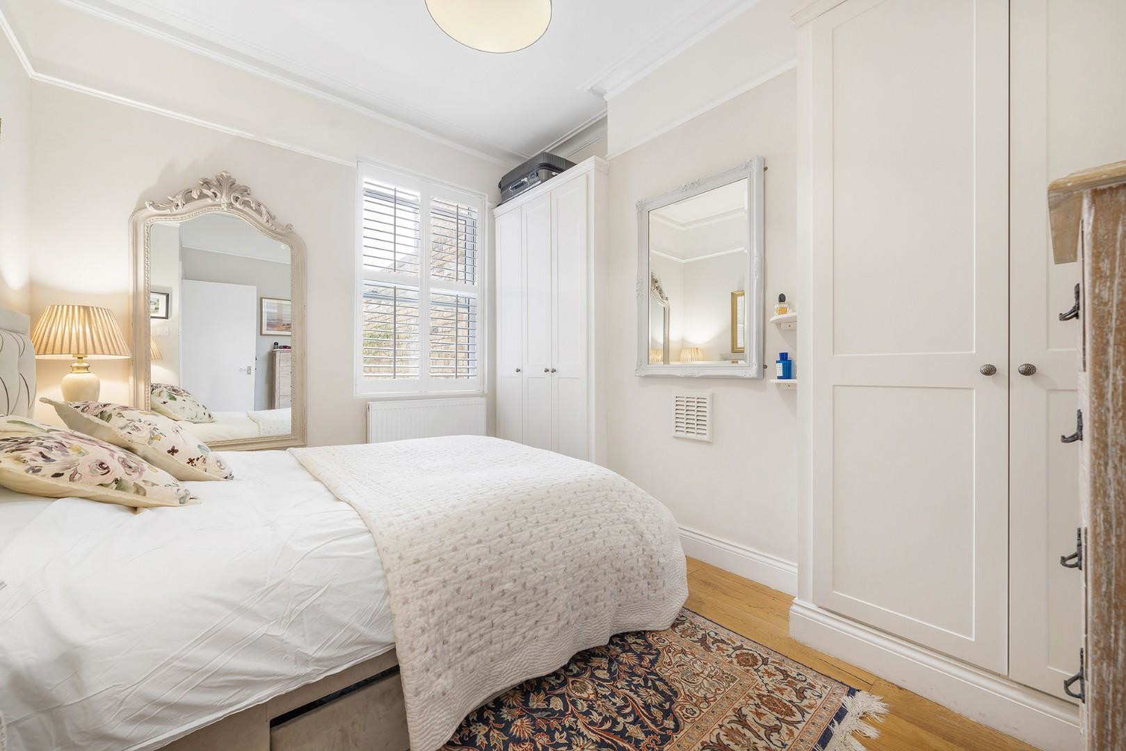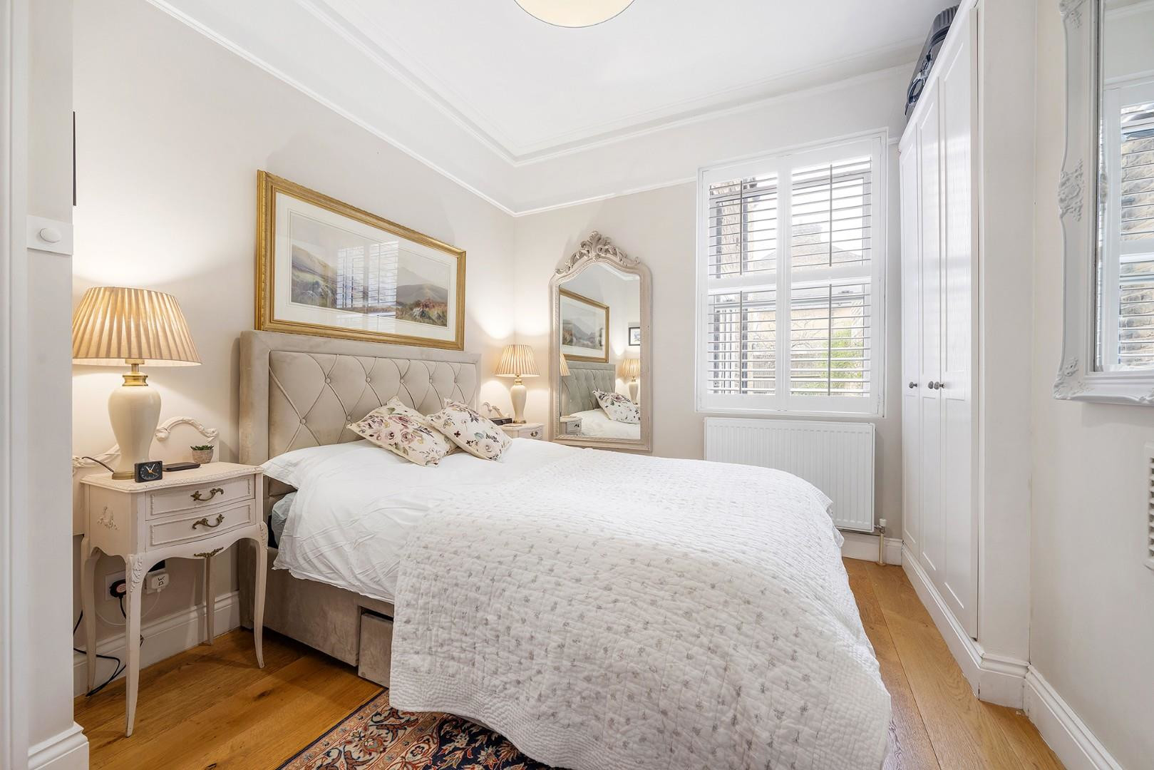 The spacious reception room is flooded with natural light thanks to the shuttered bay windows and high, corniced ceilings. A fitted cupboard provides storage, a desk creates a stylish home office setting, whilst the cosy window seat is the perfect place to relax and enjoy a good book whilst watching the world go by outside.