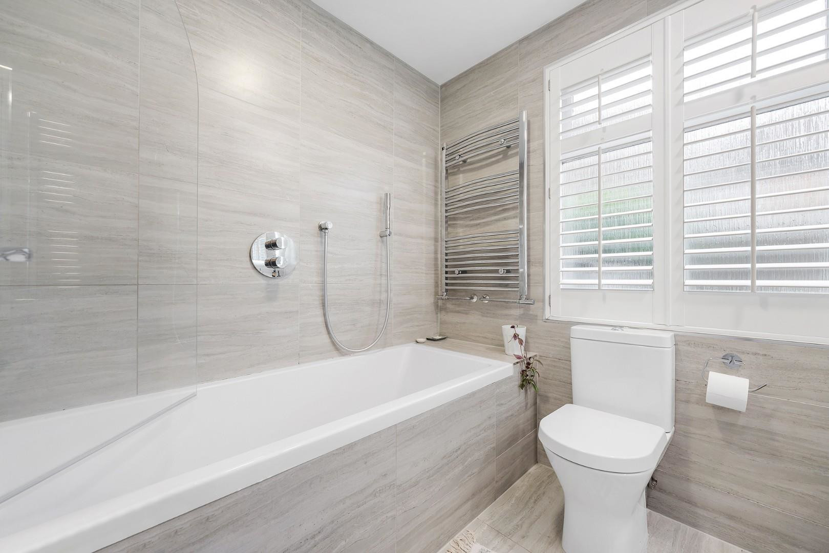 Beautifully presented like the rest of the home, the neutral double bedroom is nestled away from the street with views over the garden, a charmingly peaceful room with fitted wardrobes. Of further benefit, additional storage is also neatly built-in to the hallway ideal for coats and those essential items not used on a daily basis. Completing the interior of this appealing home, the modern bathroom is equipped with a bathtub with overhead shower, perfect for relaxing after a long day and finished with heated towel rail, under sink storage and light-up mirror.