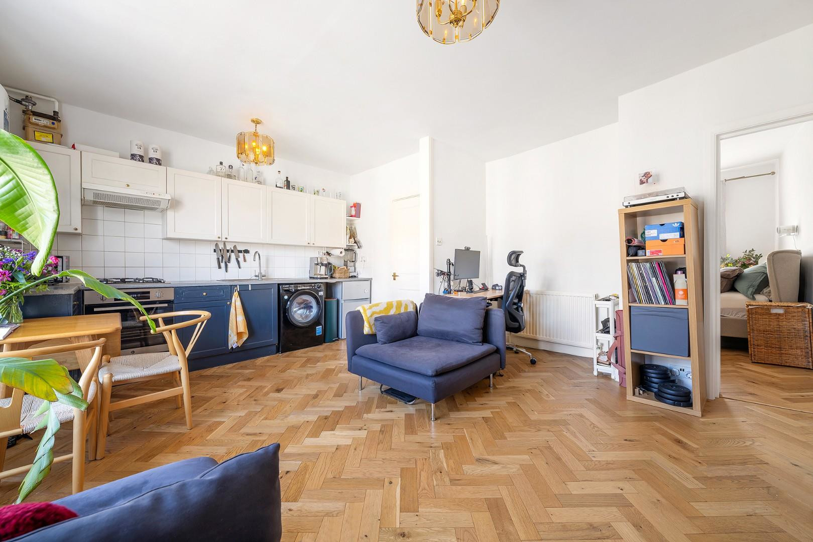 Once upstairs, the flat opens into a beautifully proportioned open-plan reception room to the front of the building. High ceilings and bright sash windows flood the space with natural light, while the thoughtful layout offers ample room for both comfortable seating and dining. The insulated herringbone wooden flooring adds warmth underfoot and contributes to the home’s inviting atmosphere, making this an ideal setting for relaxing or entertaining. The kitchen is neatly tucked to one side of the reception, offering shaker-style cabinetry in contrasting blue and white tones, creating a striking design statement that remains tasteful and elegant.