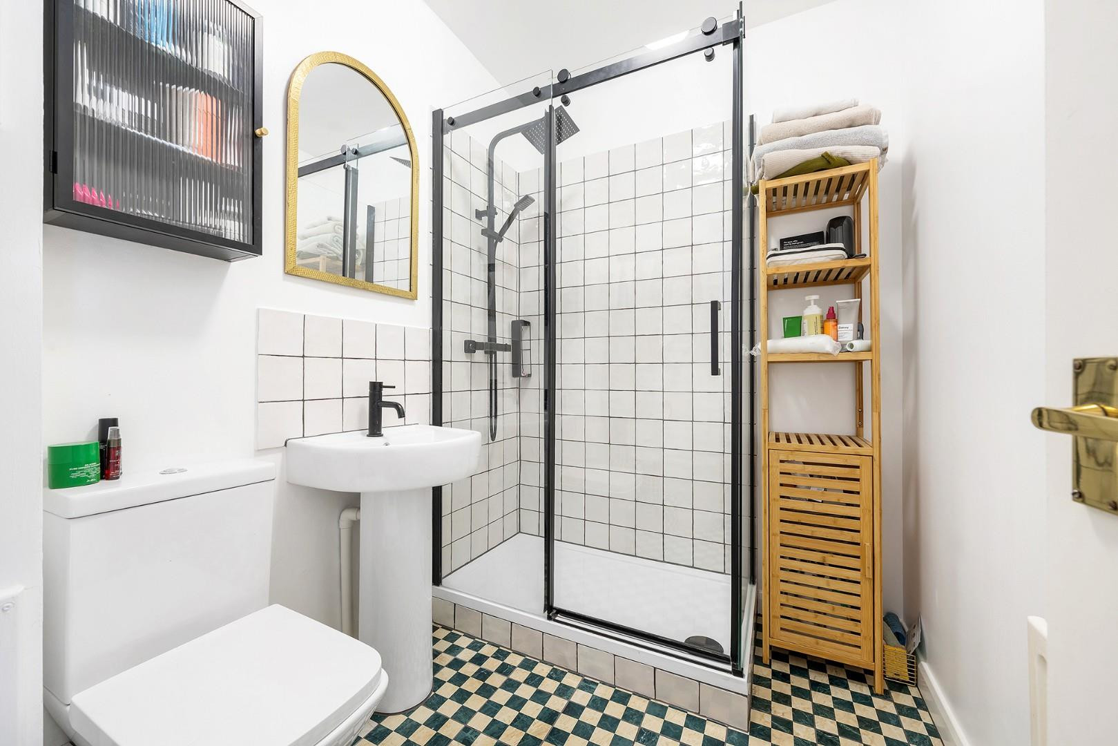 Serving the home is a spacious bathroom, fully renovated in November 2025 to a high standard. The room features a walk-in shower with stylish black fittings alongside a striking checkerboard feature floor, combining contemporary design with classic charm to create a fresh and elegant space ready for immediate enjoyment.