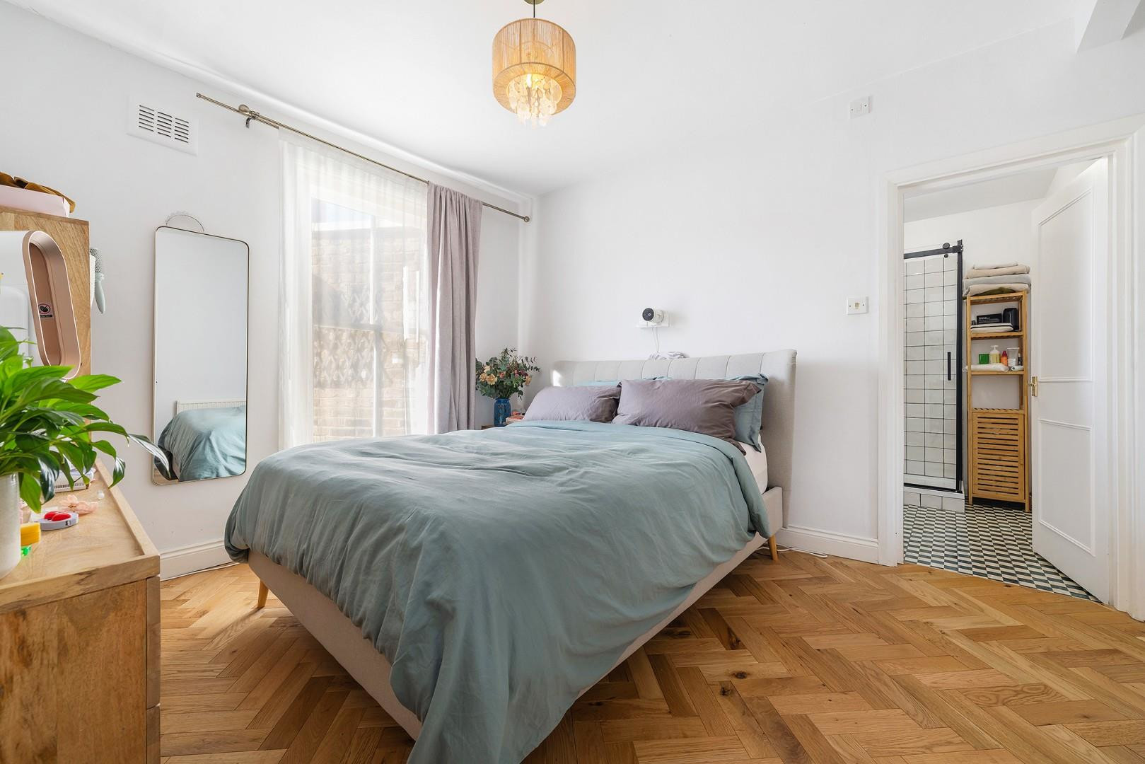 The double bedroom is quietly tucked away to the rear of the property, away from the exciting buzz of the surrounding area. Fitted with wooden sash windows incorporating modern double glazing, the room promotes a restful night’s sleep and offers generous proportions for wardrobes and additional furnishings. The bedroom also benefits from the same characterful herringbone wooden flooring, creating a cohesive and stylish finish throughout the home.