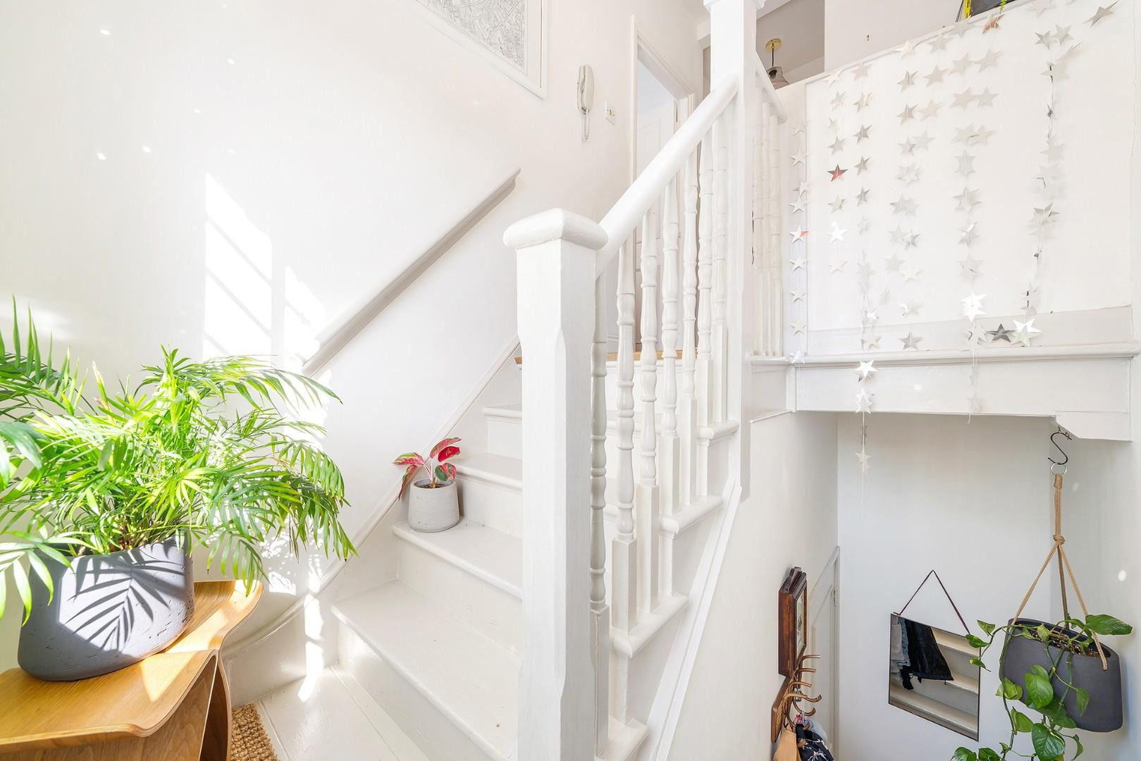This attractive home enjoys an airy ambience, enhanced by its elevated position above street level, creating a bright and welcoming retreat. Upon entry, a charming wooden stairwell leads up into the home, with a large window cascading natural light into the space and creating an inviting first impression as you ascend into the apartment.
