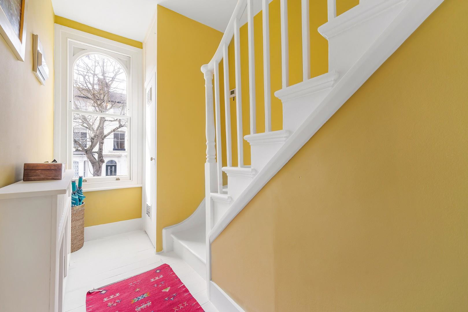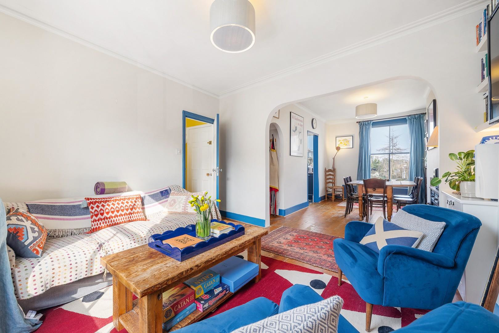 Entering on the first floor, stairs lead up to a bright landing and through to a generously proportioned dual-aspect reception and dining room. Wooden flooring runs underfoot while high ceilings and sash windows enhance the sense of space and light. This inviting room offers ample space for both relaxing and entertaining, comfortably accommodating a large dining table. A charming archway frames a useful storage area, ideal for coats and everyday essentials.