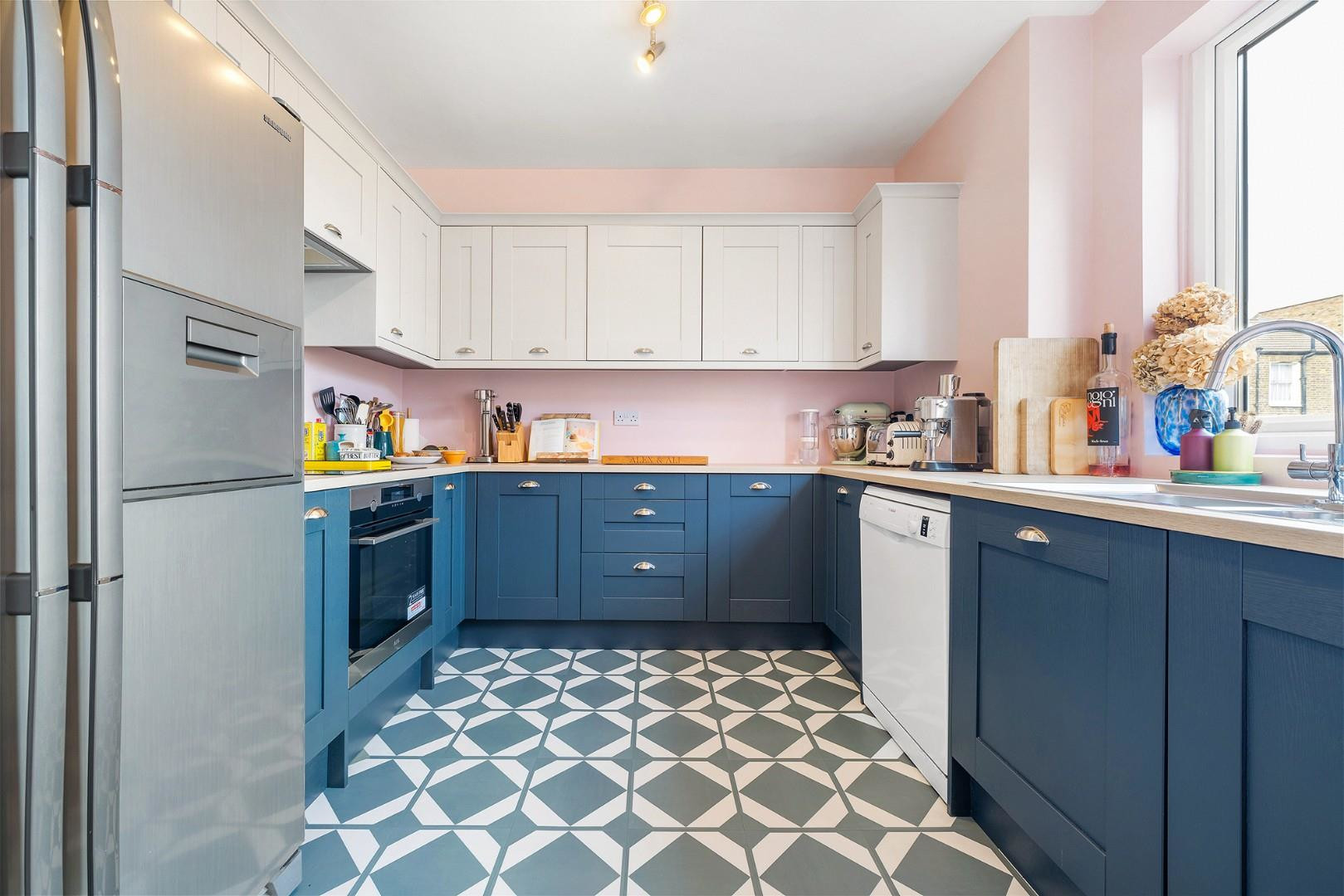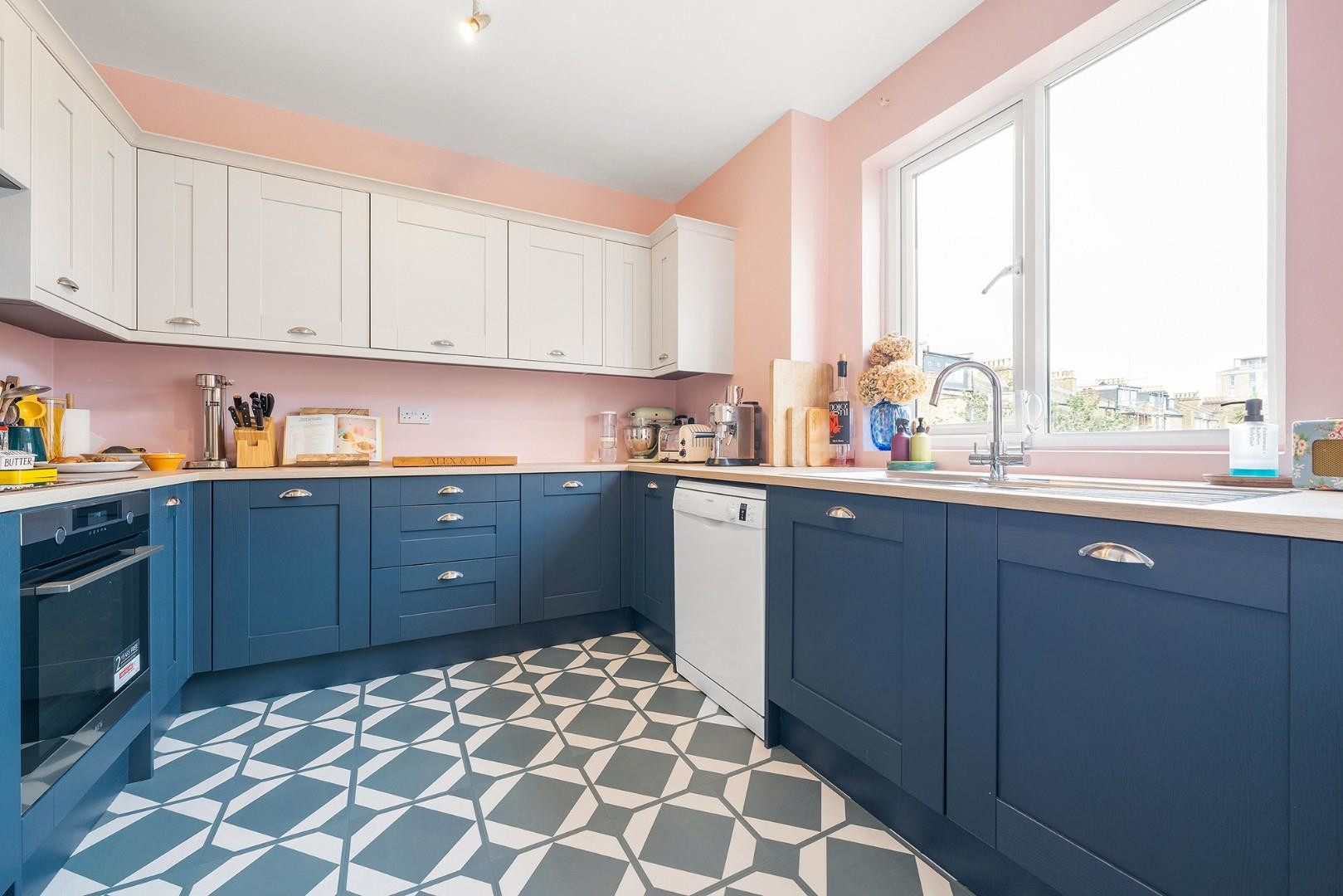 Just off the dining space sits a modern semi-open plan kitchen, thoughtfully designed with shaker-style cabinetry in stylish blue tones, complemented by contrasting white wall cupboards. Installed just a couple of years ago, the cabinets are arranged in a horseshoe-shaped layout which provides generous wooden worktops and excellent storage, with a large window above the sink allowing in plenty of natural light.