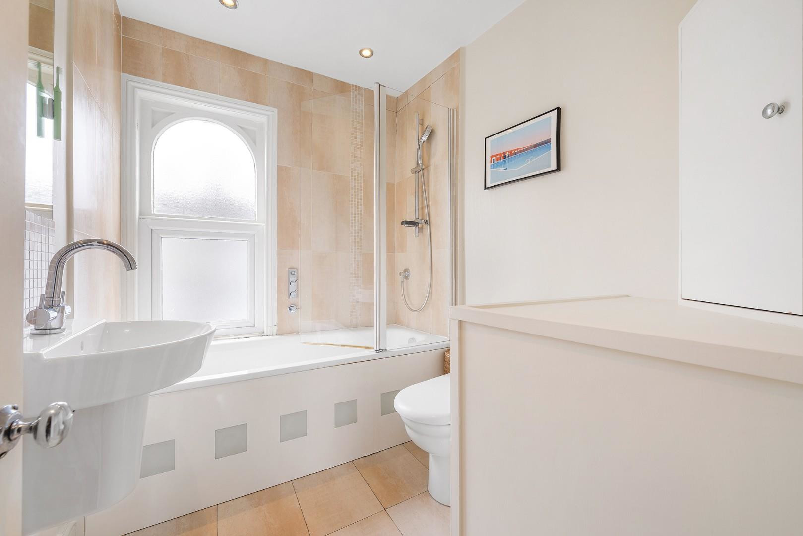 A charming flight of wooden stairs leads to the upper level where three genuine double bedrooms are arranged. Each room is well-proportioned and beautifully presented with cosy carpets and sash windows, while the principal bedroom is further enhanced by a feature fireplace. The bedrooms share a spacious bathroom featuring a characterful arched window, a bathtub with overhead shower and ambient mood lighting within the bath panel, creating a calm and relaxing environment.