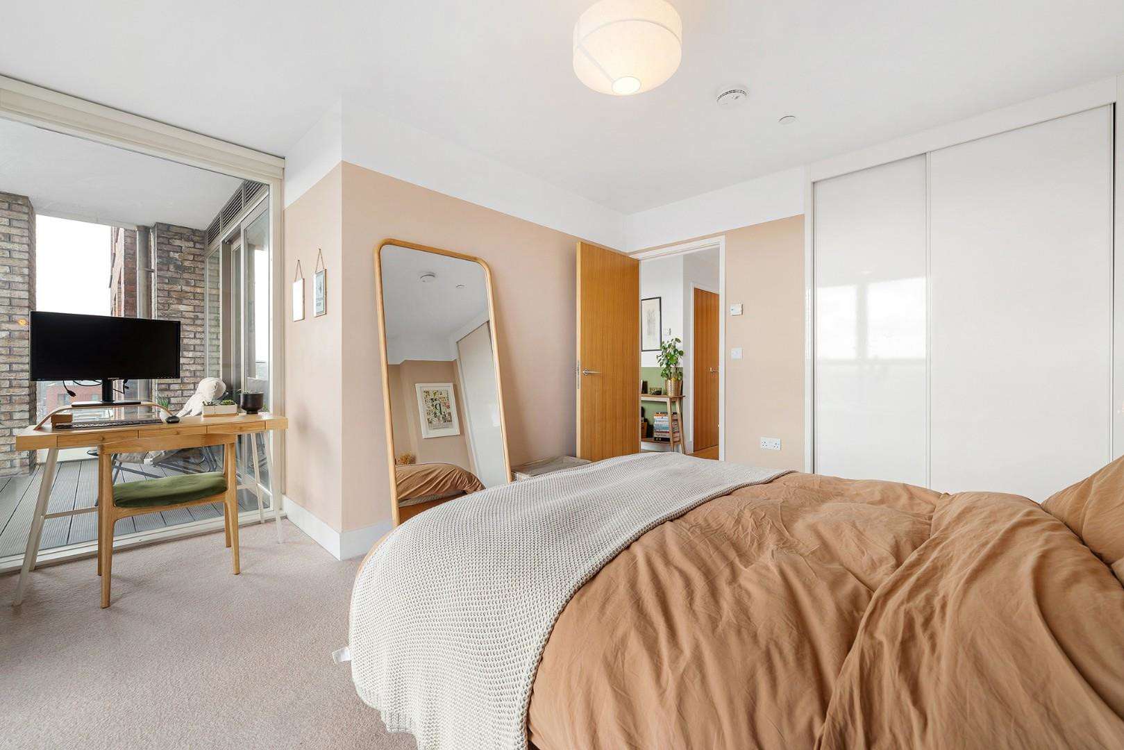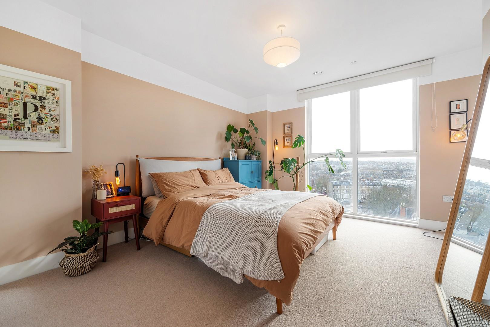 The bedroom is a particularly bright and airy double room with large windows on two aspects, enjoying lovely natural light and similar elevated outlooks to the reception and balcony. Recently decorated, this inviting space offers excellent proportions for a large bed along with fitted wardrobes and space for additional furniture such as a desk or dressing table. The bathroom is finished in neutral contemporary tones and features a bathtub with overhead shower, creating a calm and practical space for daily routines.