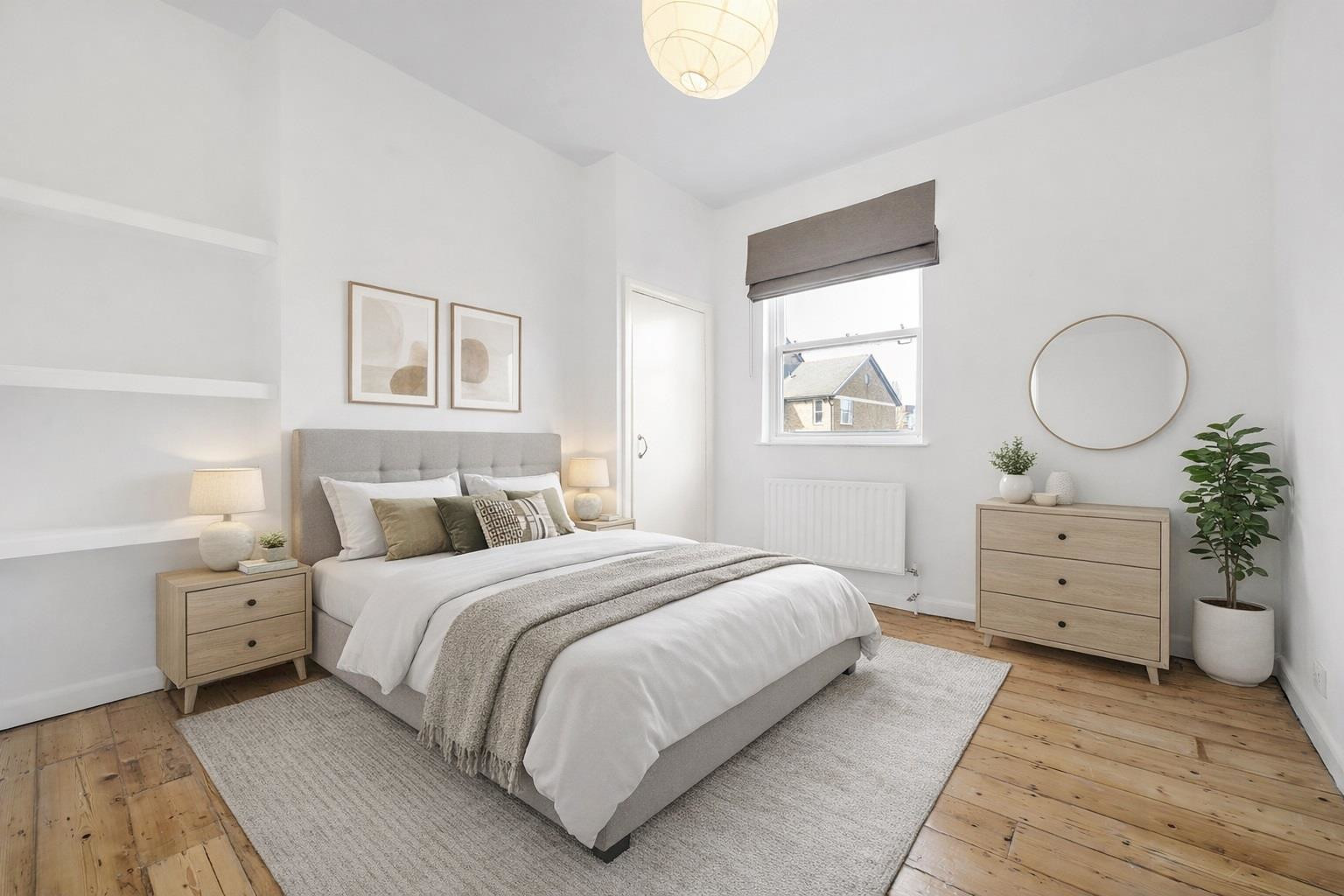 Both bedrooms are well-proportioned doubles. The principal bedroom benefits from built-in shelving and a storage cupboard, enhancing practical storage while maintaining a clean and airy feel. The second bedroom is also a genuine double, with dual-aspect windows allowing plenty of daylight to fill the room.