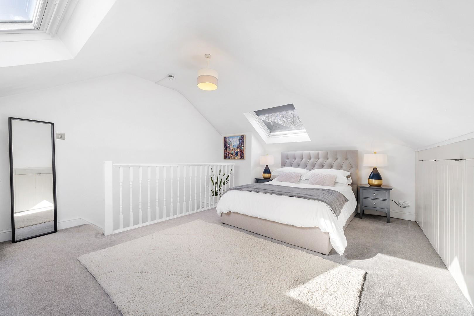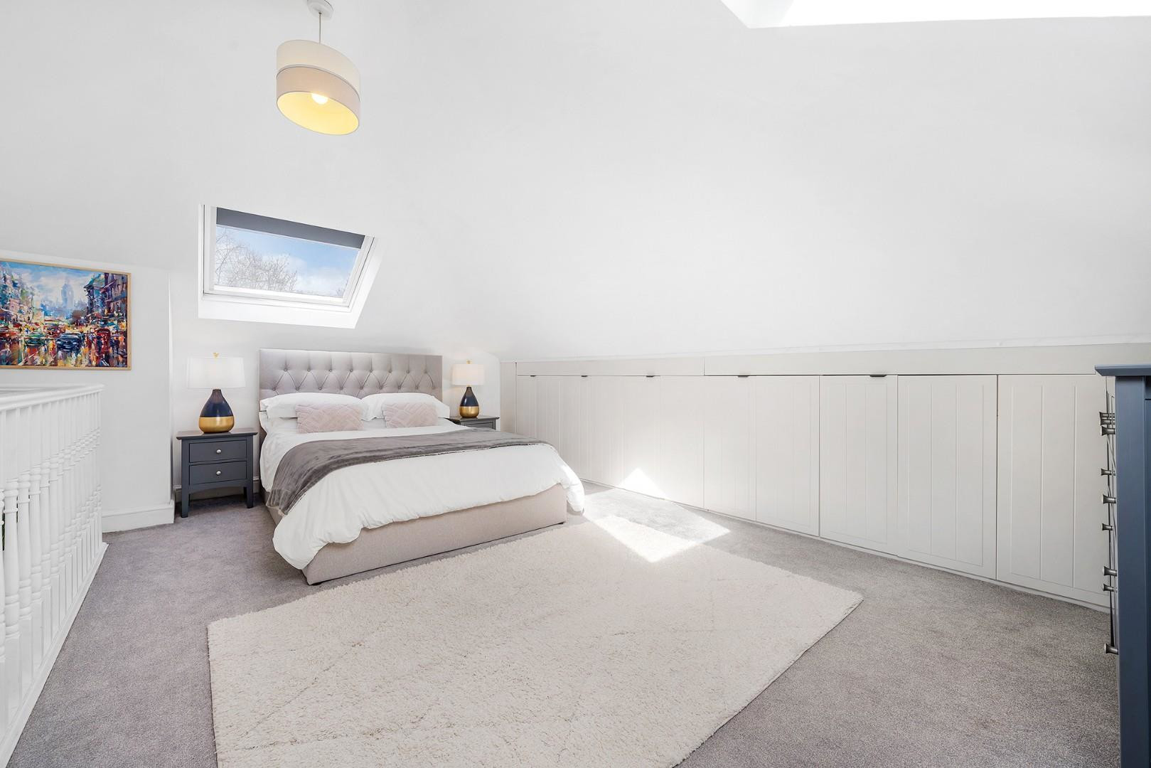 The top floor hosts the third bedroom, an impressive principal bedroom where skylights draw in excellent natural light and enhance the sense of tranquillity. This airy room is further enhanced by a wall of neatly fitted storage. The family bathroom, renovated in summer 2022, is finished in contemporary tones and features a bathtub with overhead shower, fitted storage and a stylish Crittall-style shower screen.