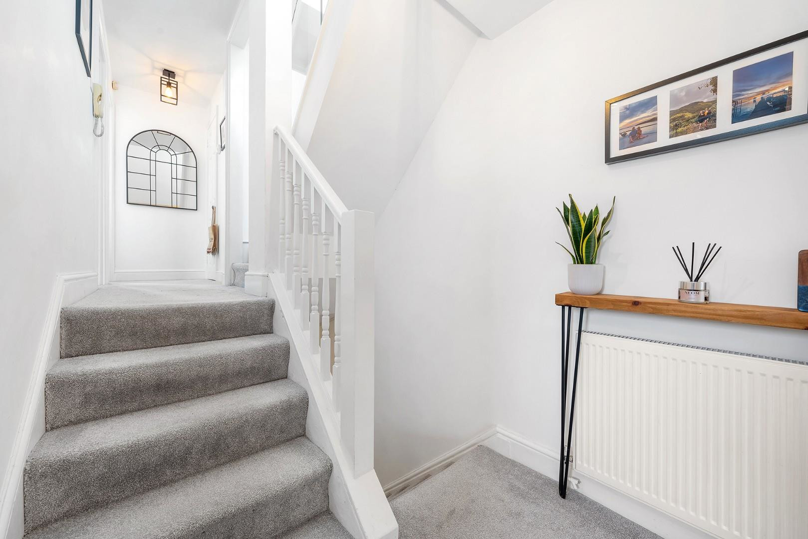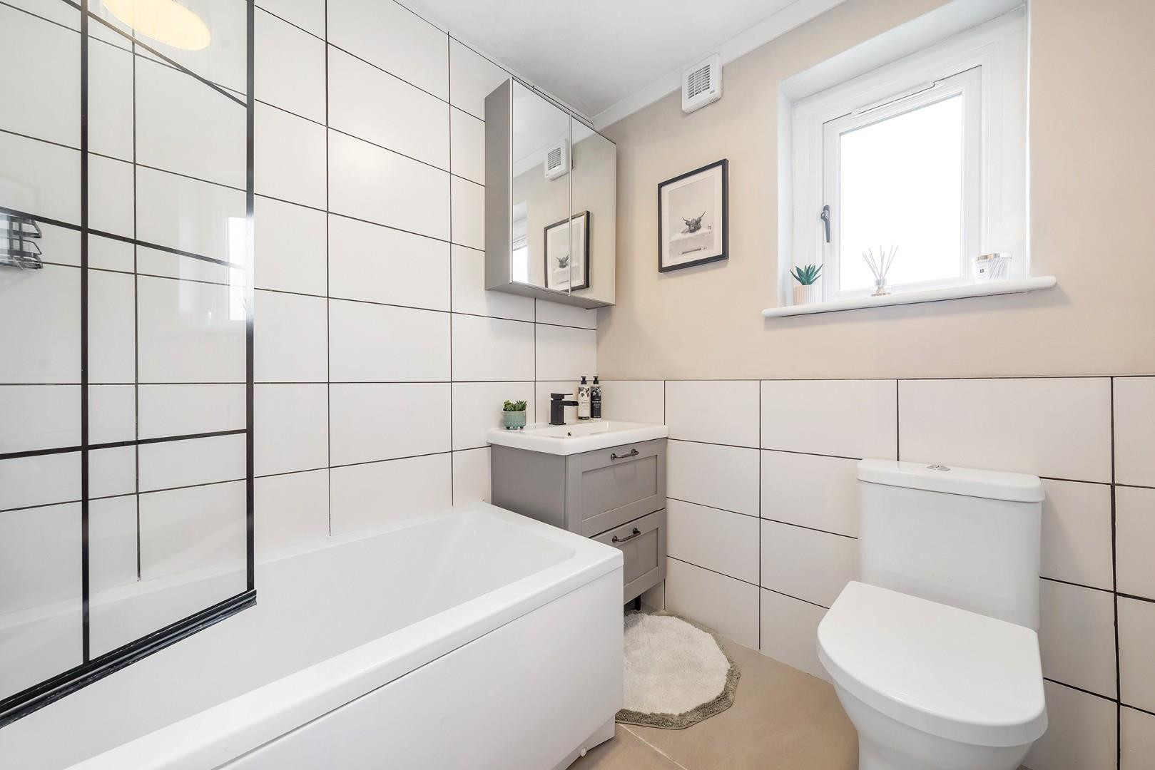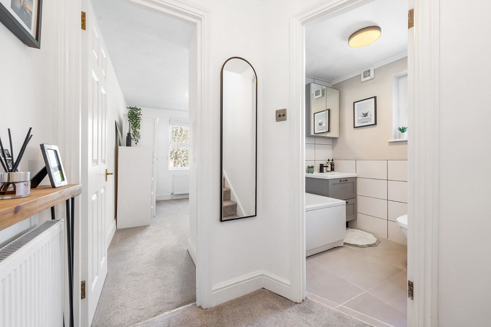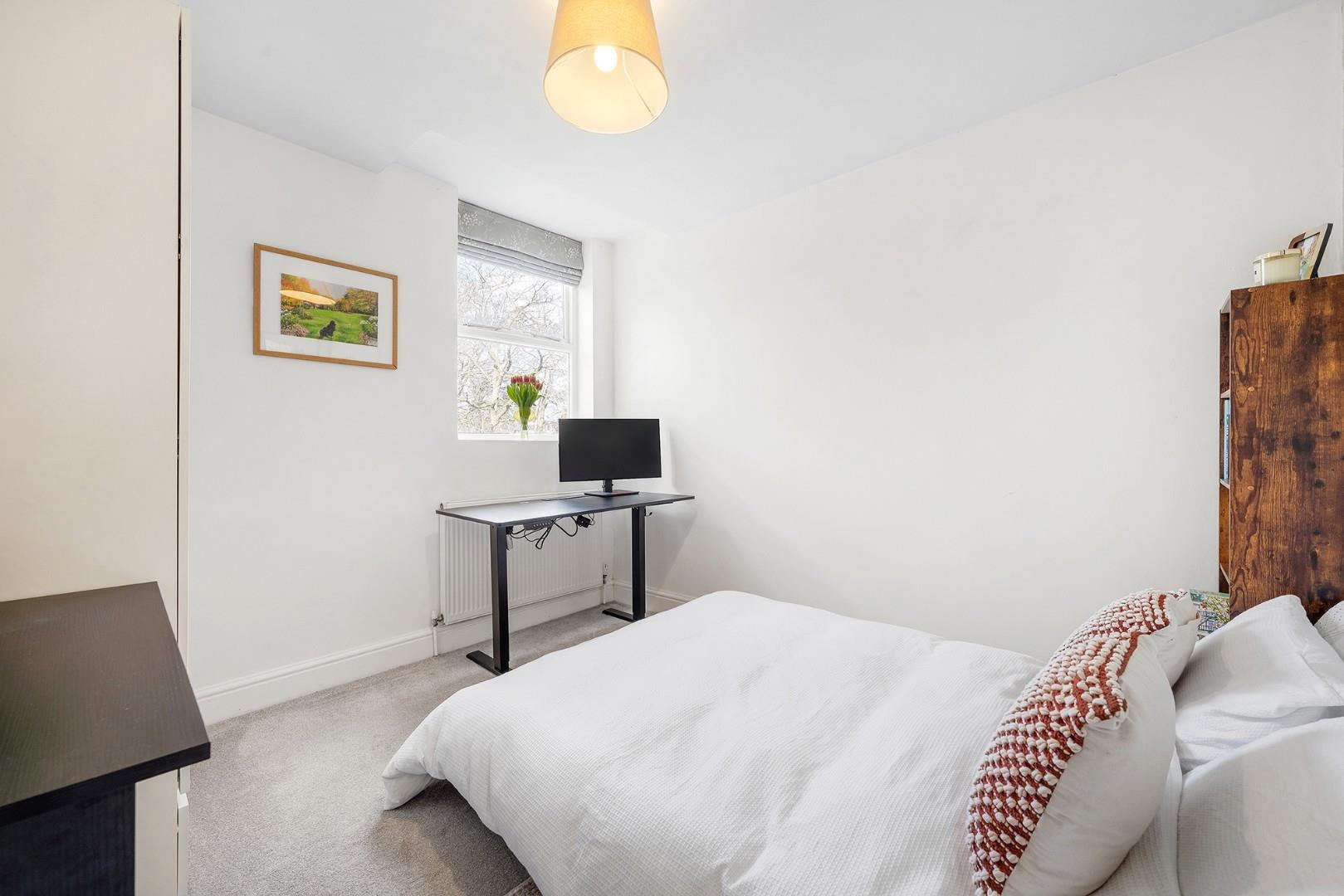 All three bedrooms are separated from one other, creating a versatile layout with a desirable level of privacy for each room. Two of the bedrooms are peacefully positioned to the rear of the property, enjoying leafy views across neighbouring gardens and creating calm spaces ideal for rest, work or study. One of these rooms is currently arranged as a home office with a futon, offering flexibility as an occasional guest bedroom. Whilst the other is a spacious double, finished with cosy carpets and room for plenty of wardrobe space.