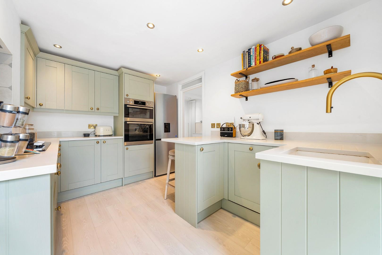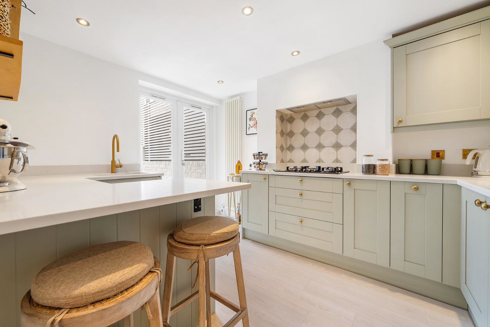 Downstairs, the kitchen has been finished to an excellent standard. Contemporary shaker-style cabinetry in a soft sage tone is paired with sleek white worktops and brass accents, creating a modern yet timeless aesthetic. Integrated appliances and a breakfast bar provide both practicality and additional workspace, while large glazed doors lead directly out to the garden, allowing light to flood the room and creating a natural flow between indoor and outdoor living.
