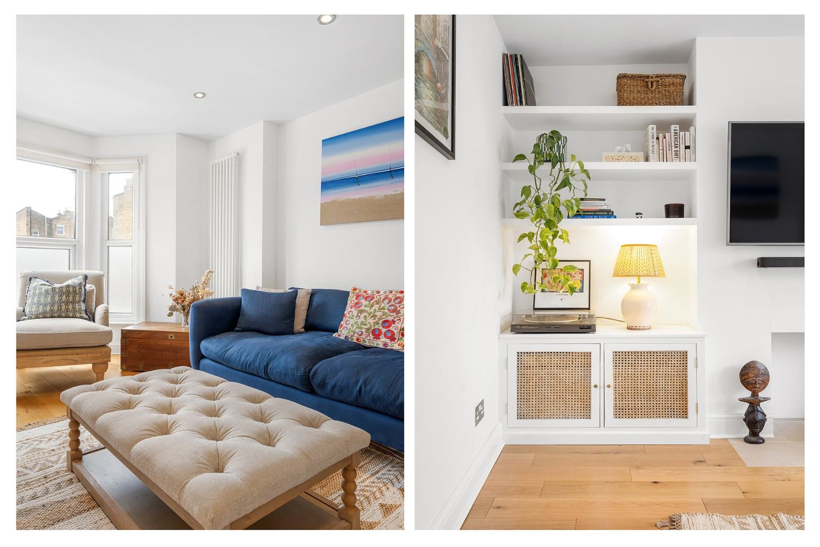 At the front of the home, a bright and inviting reception room provides an ideal setting for both relaxing and entertaining. A large bay window draws in natural light, highlighting the warm flooring and crisp neutral décor. Bespoke shelving and cabinetry sit within the alcoves, offering practical storage and creating a stylish focal point to the room.