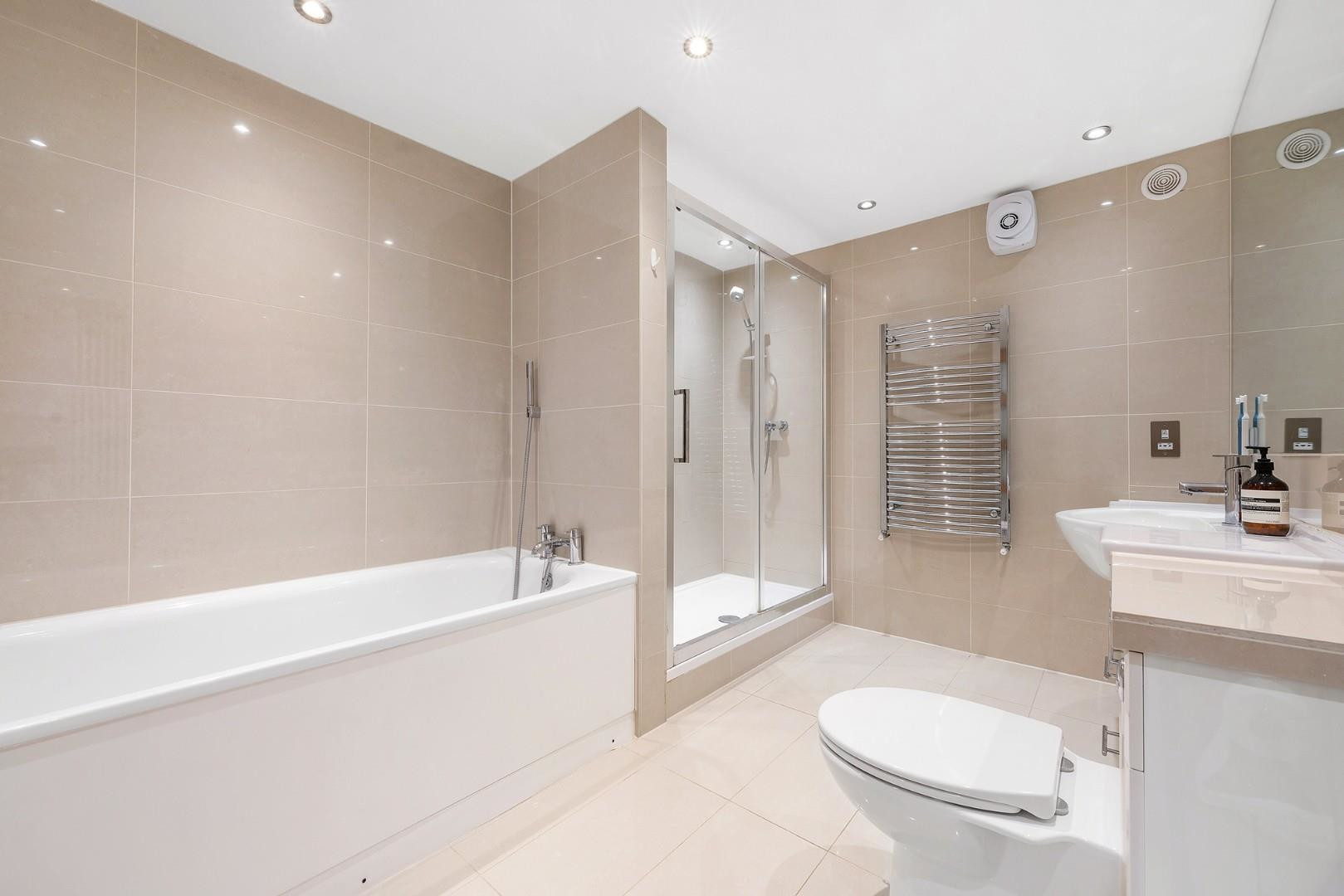 Completing the interior is a stylish family bathroom finished with modern tiling and high-quality fittings. The suite includes both a full-sized bathtub and a separate walk-in shower, providing practicality and comfort. Clean lines and neutral tones enhance the sense of space, creating a relaxing and well-appointed bathroom environment.
