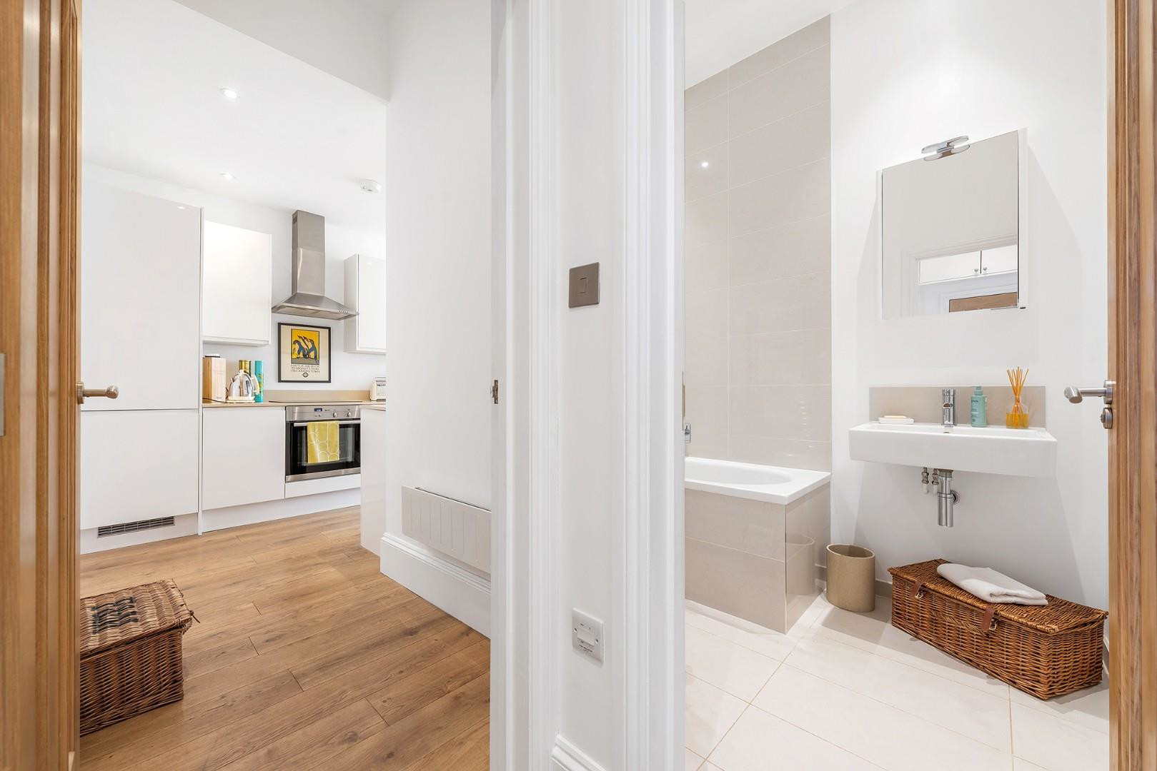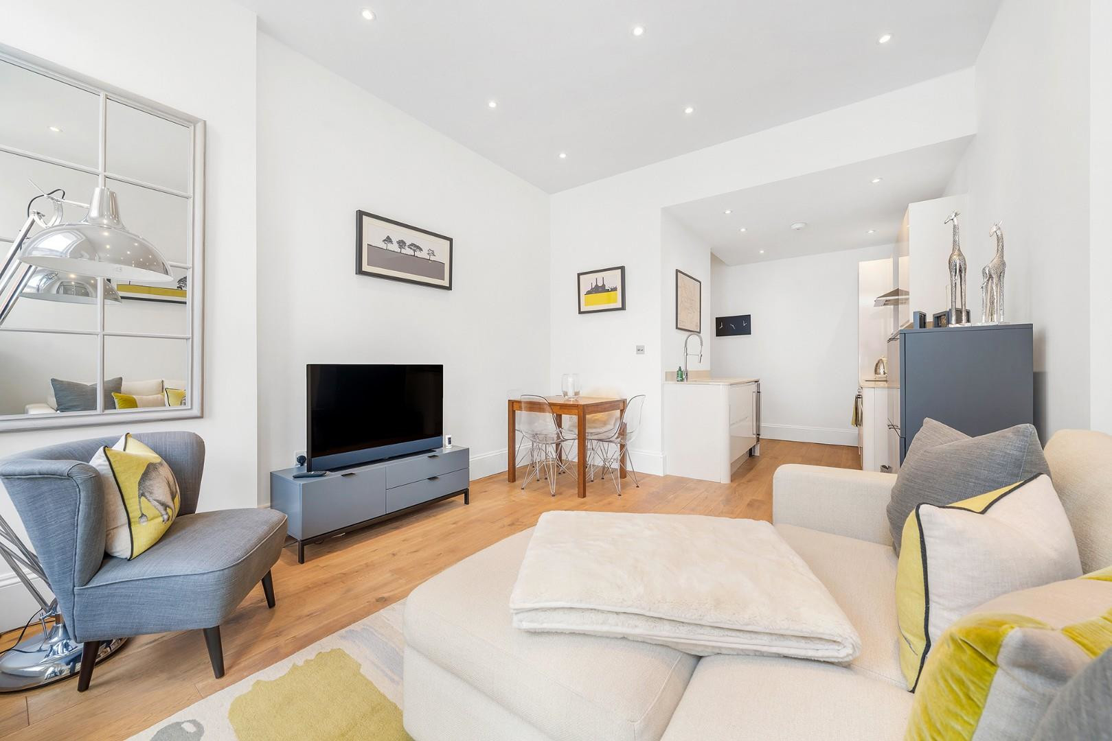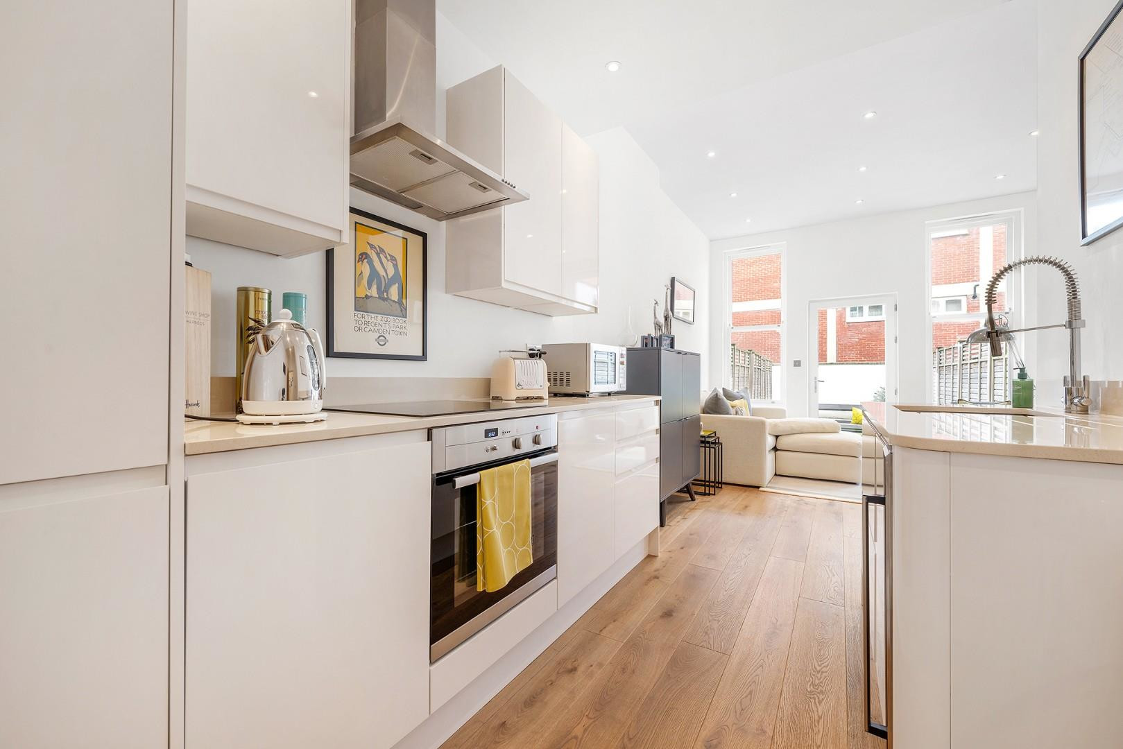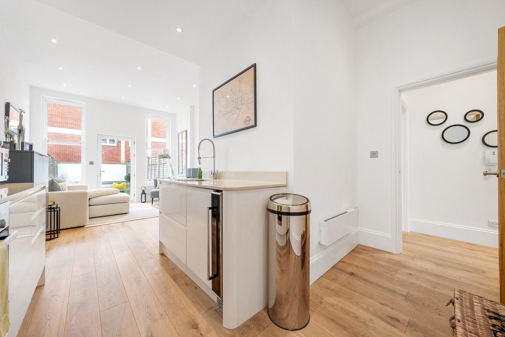 Internally, the apartment is bright, airy, and generously proportioned, with high ceilings enhancing the sense of space throughout. To the rear, the open-plan reception room overlooks the garden and is flooded with light through large, modern windows, drawing the outside in. This impressive space offers both comfort and versatility, with engineered wooden flooring creating a seamless flow. There is ample room for both dining and lounging, while the sleek kitchen is set neatly to the rear, complete with gloss cabinetry, integrated appliances, and storage across two sides for a practical, streamlined layout.