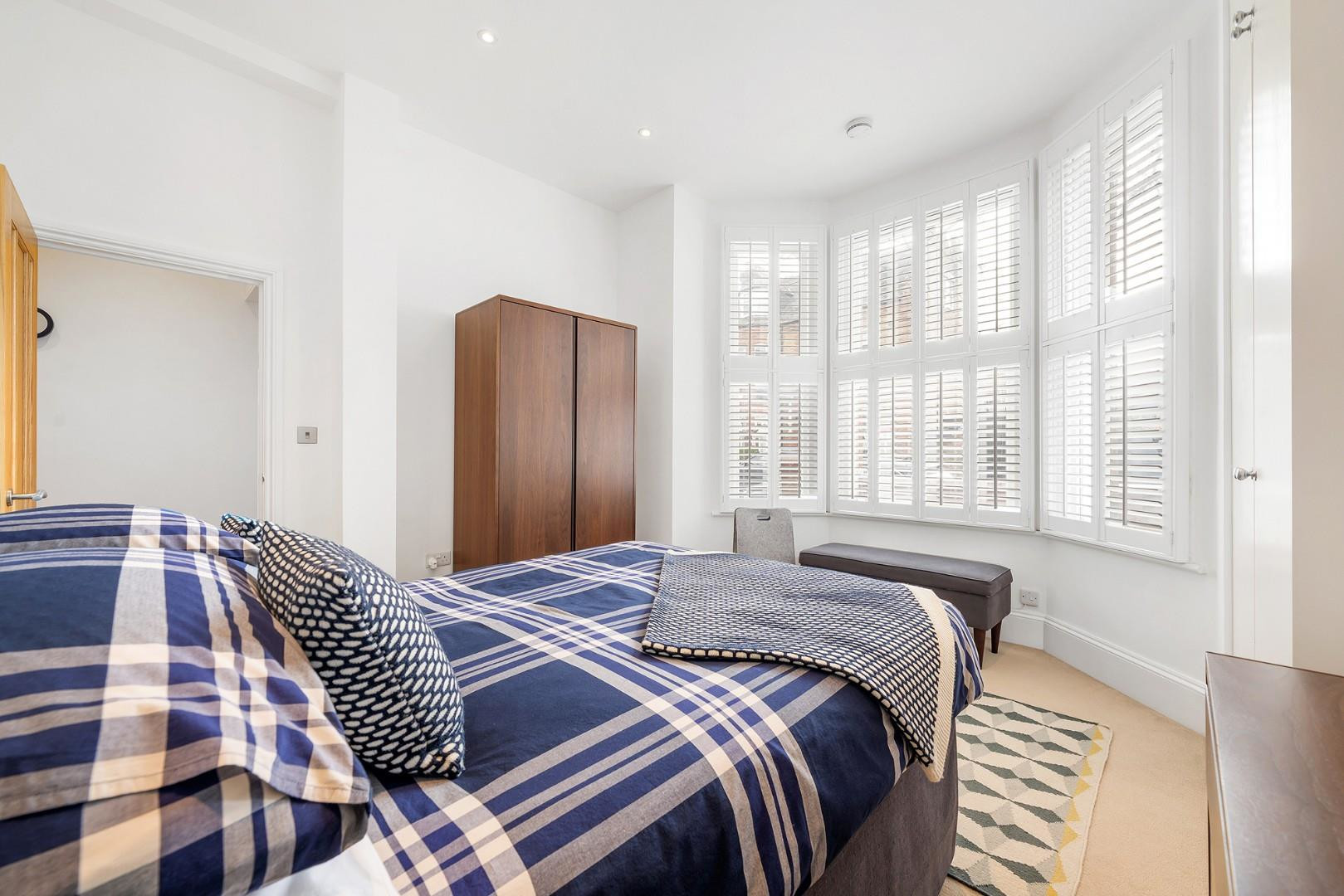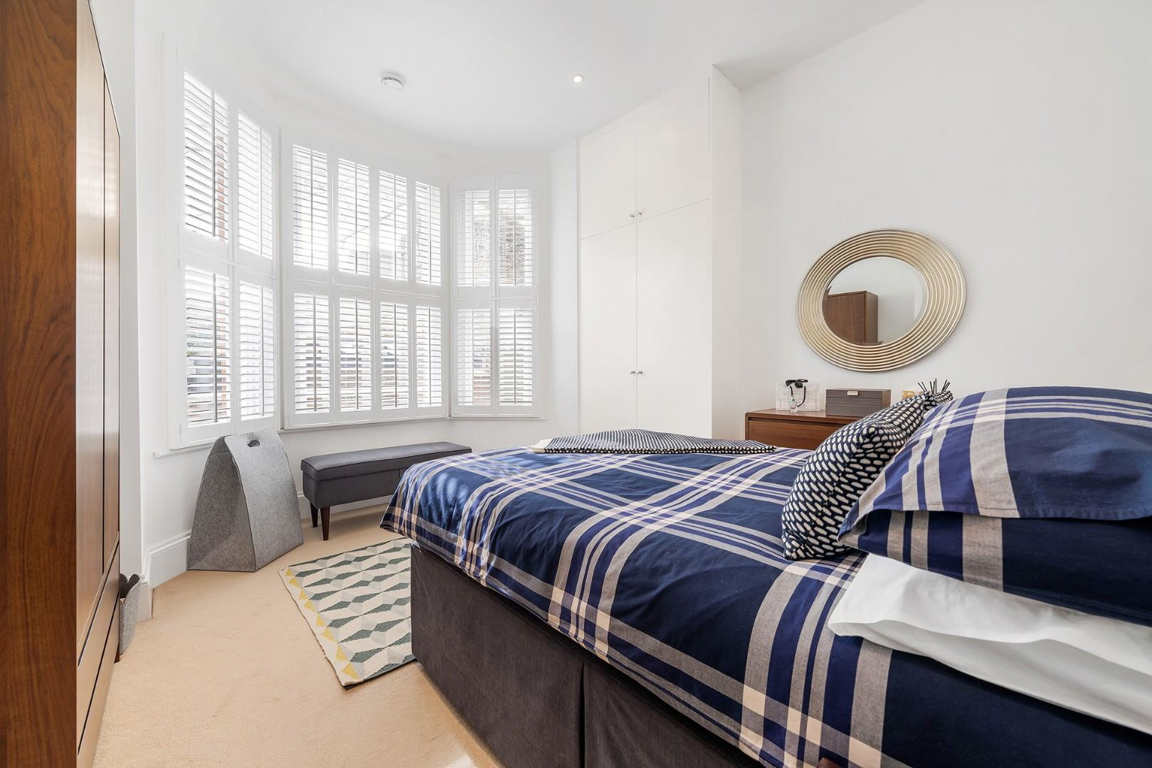 The spacious double bedroom is set behind a large bay window fitted with elegant plantation shutters, allowing for excellent natural light while maintaining complete privacy. The room is finished in neutral tones with soft carpeting and benefits from generous fitted wardrobes. The stylish bathroom continues the calming aesthetic, featuring large neutral tiles and a rain shower over the bathtub for a contemporary yet relaxing feel.