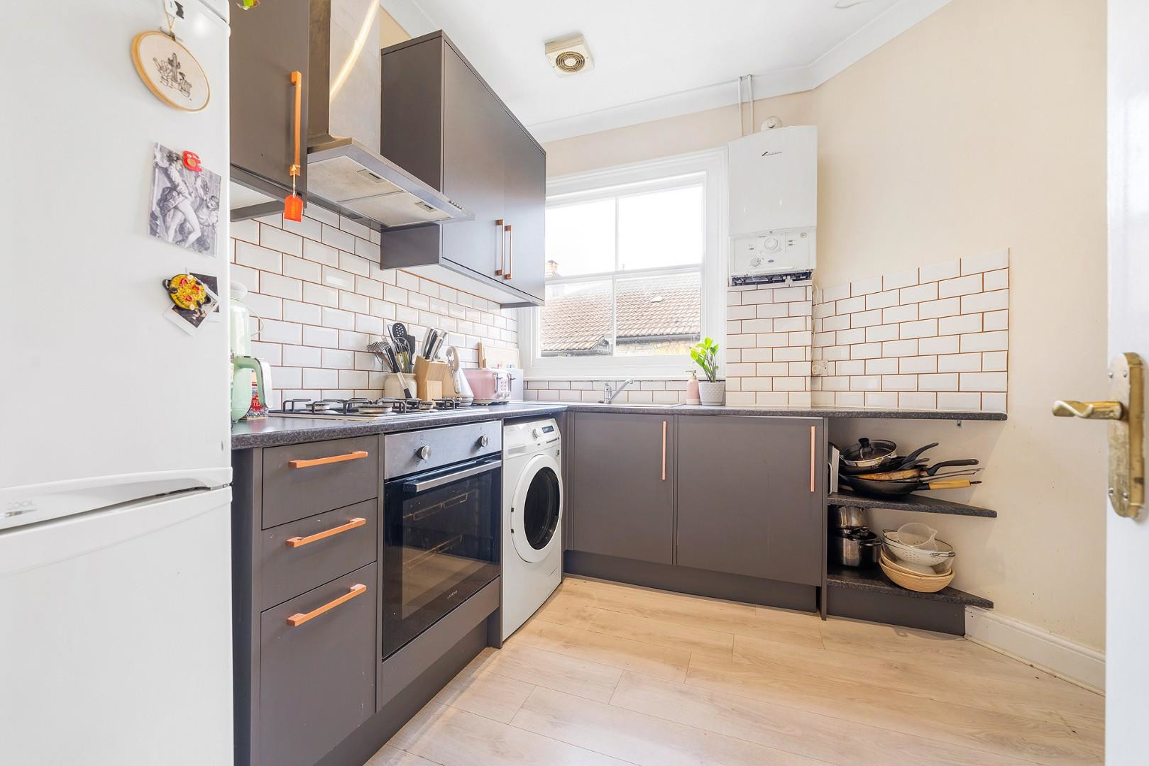 The separate kitchen is modern and well-appointed, fitted with sleek dark cabinetry complemented by contrasting worktops and stylish subway tiled splashbacks. Integrated appliances, generous storage and ample preparation space ensure this is both a practical and attractive setting for everyday cooking.