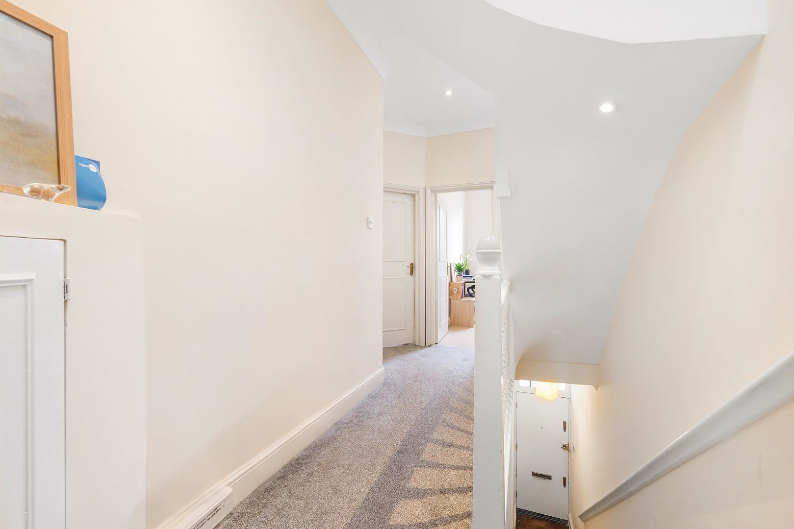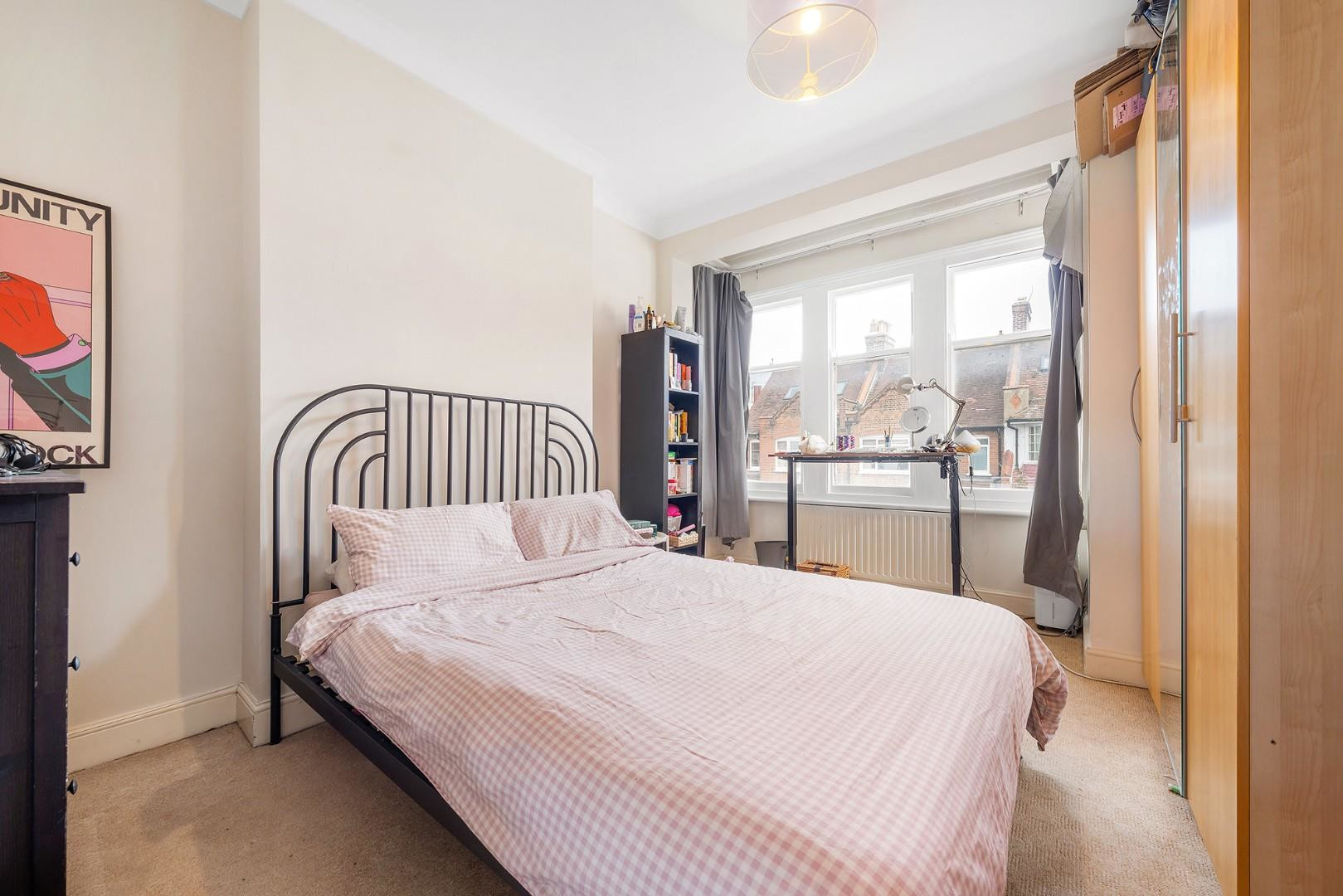 The property offers three bedrooms arranged on the first floor, providing flexibility for families, professional sharers or those seeking work-from-home space. The principal bedroom is particularly spacious, featuring a large bay window that fills the room with natural light and provides a pleasant outlook, with plenty of room for wardrobes and additional furnishings. A second well-proportioned double bedroom sits nearby, while the third bedroom is a comfortable single, perfectly suited as a child’s bedroom, nursery or dedicated home office.