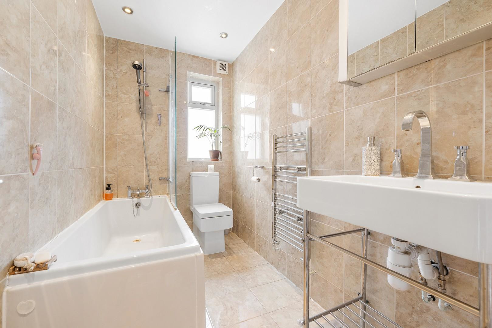 A contemporary family bathroom completes the internal accommodation, finished in neutral tiling and fitted with a full-sized bath and overhead shower, modern sanitaryware and a heated towel rail.
