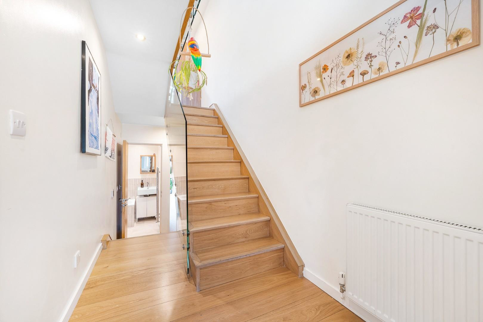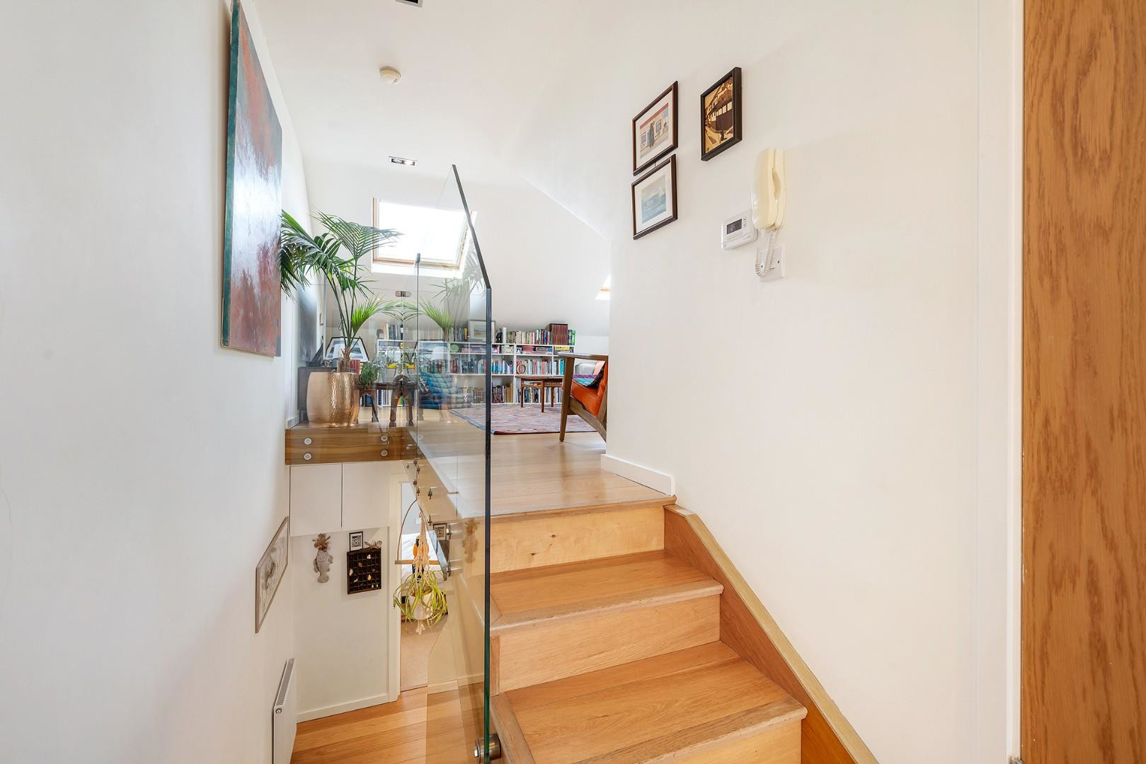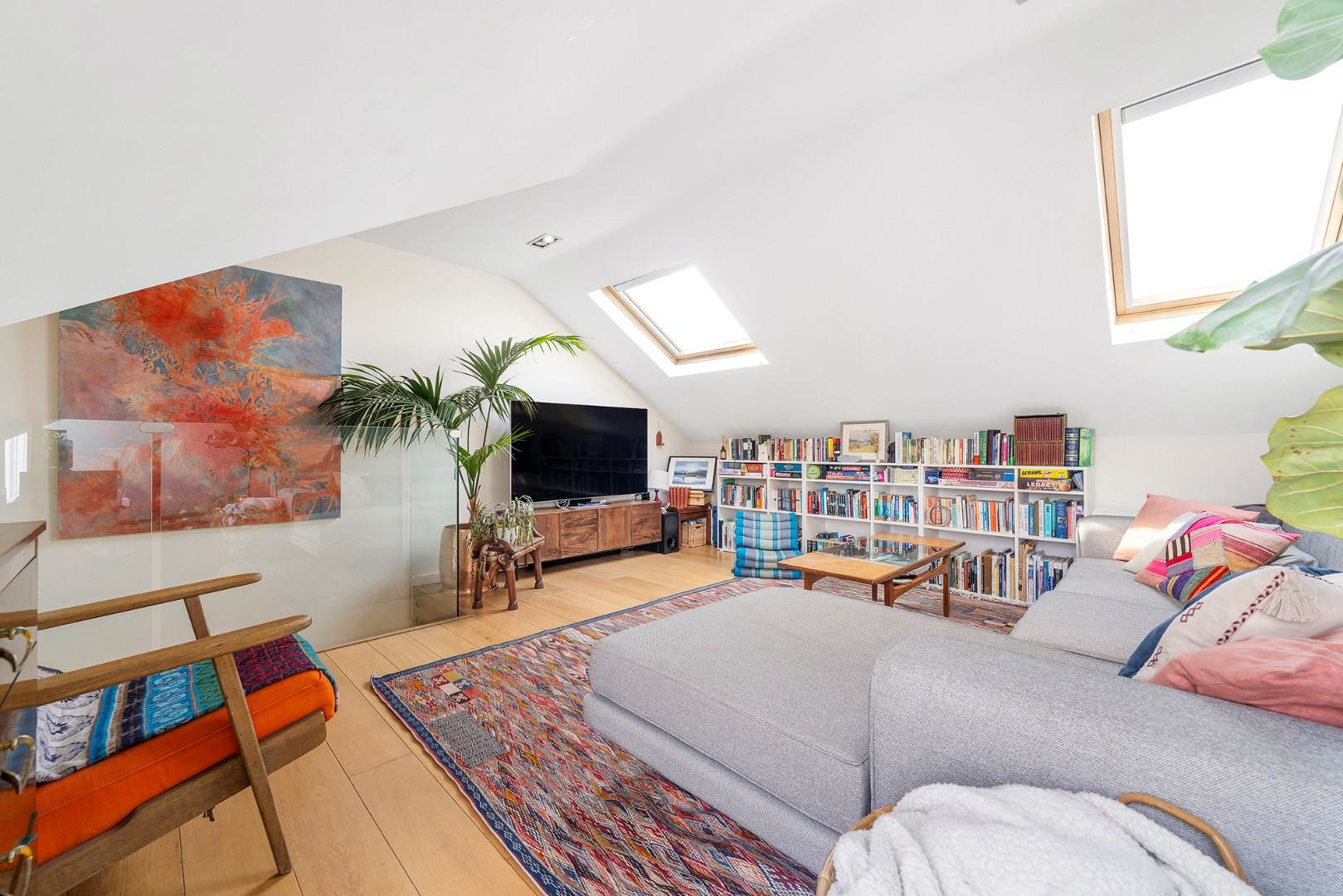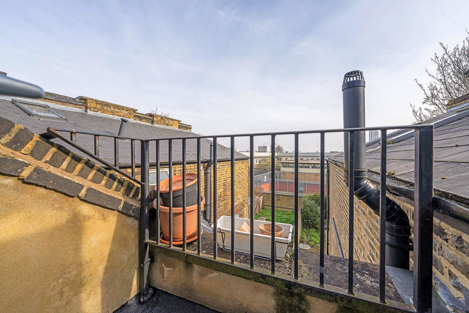 The reception room is set on the uppermost level, providing a fantastic sense of separation from the rest of the property. This generous living area is flooded with light via further skylights and enjoys a peaceful ambience, with a door opening onto an additional balcony. From here, far-reaching rooftop views stretch across the surrounding Victorian terraces and beyond, offering a lovely spot to unwind at the end of the day.