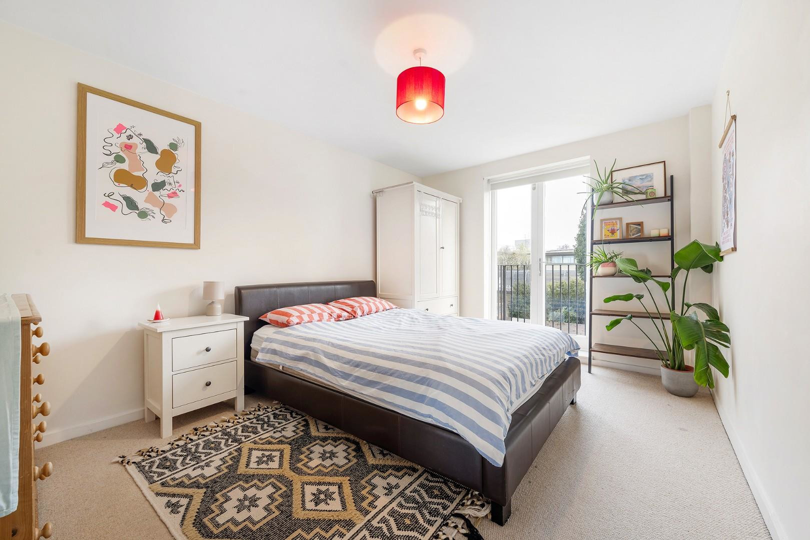 The second bedroom is quietly positioned at the rear of the property and enjoys French doors opening onto a balcony, offering pleasant leafy views and allowing a bright and airy feel to the room. A contemporary family bathroom sits centrally on this floor, finished in neutral tones and thoughtfully designed with both a bathtub and separate walk-in shower, catering perfectly to modern living.