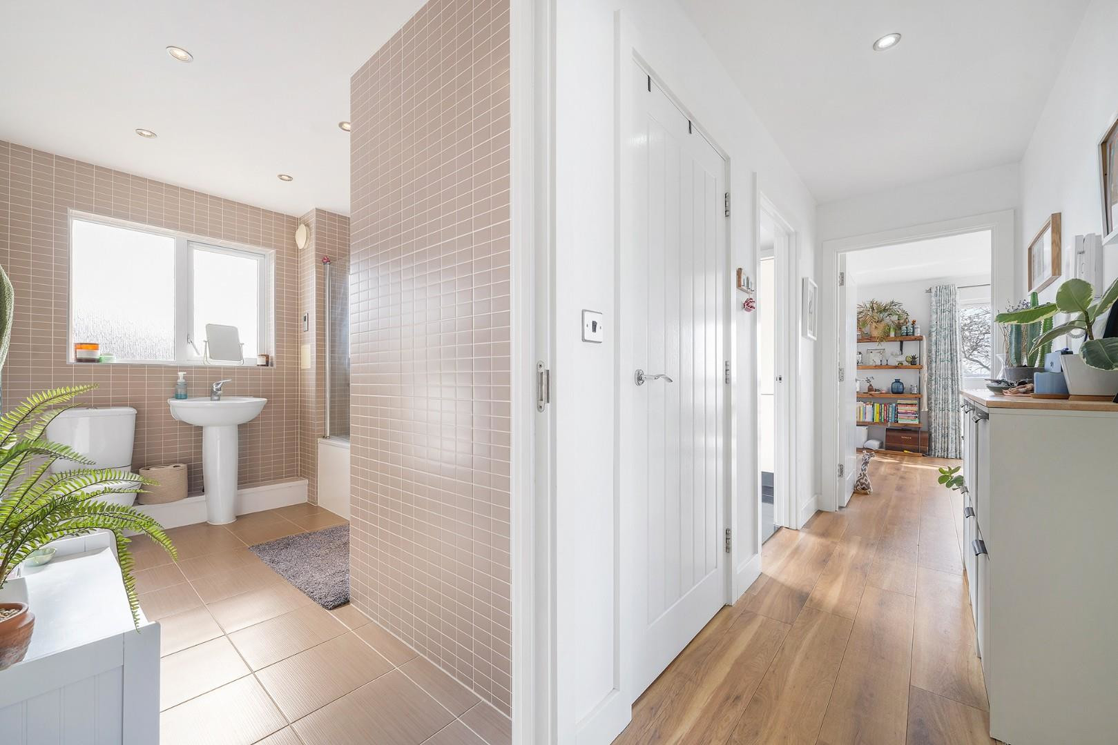 A modern family bathroom completes the interior, fitted with a bath and overhead shower, alongside neutral tiling and a clean, fresh finish. Additional storage can be found in the hallway, enhancing the functionality of the home.