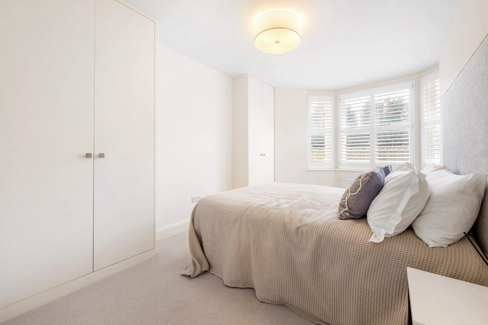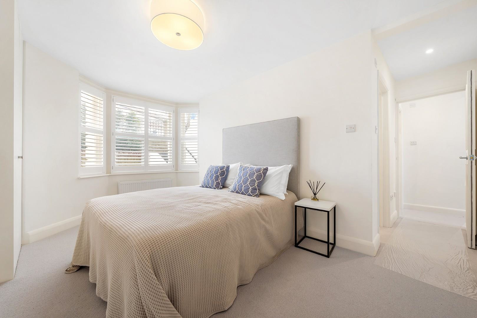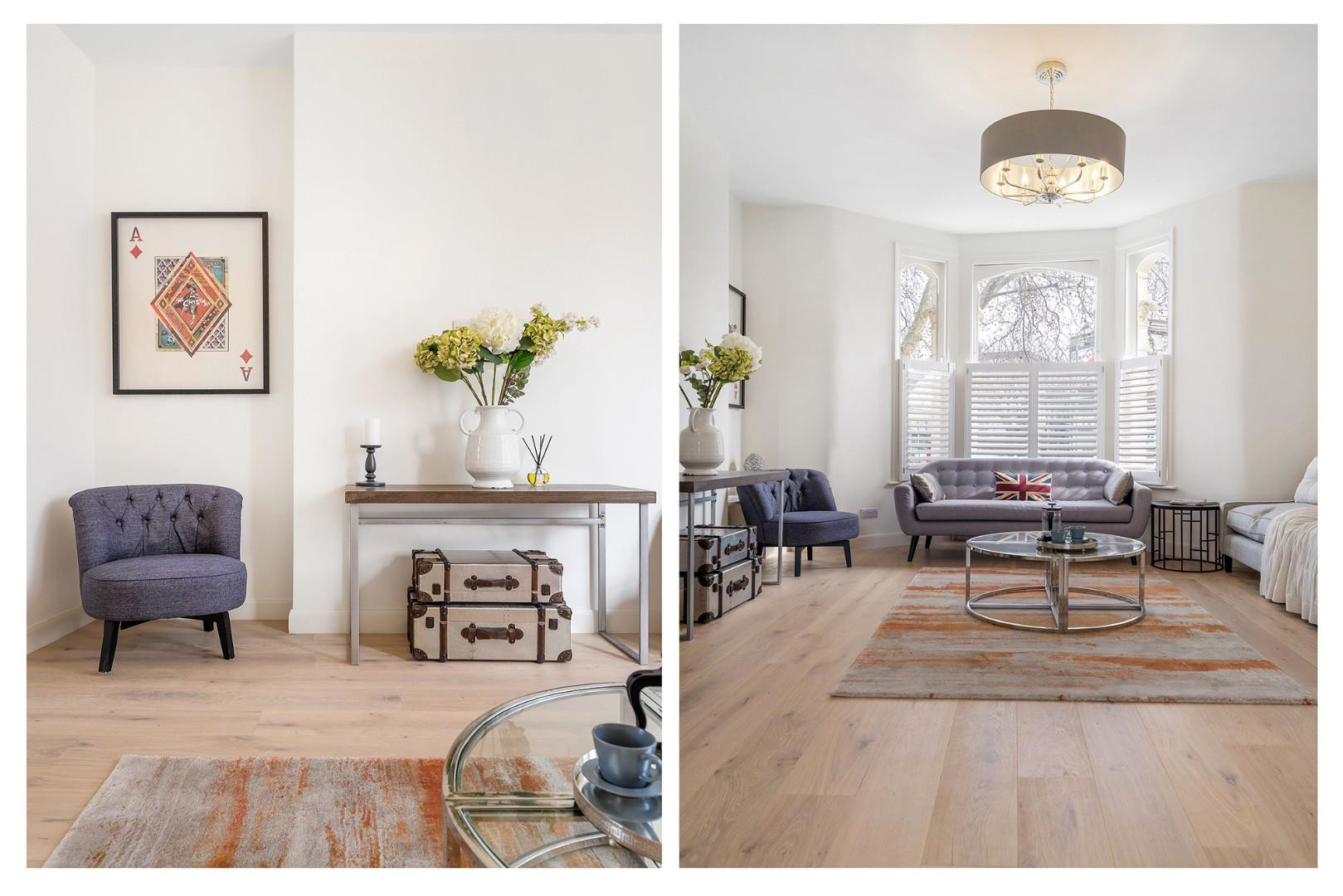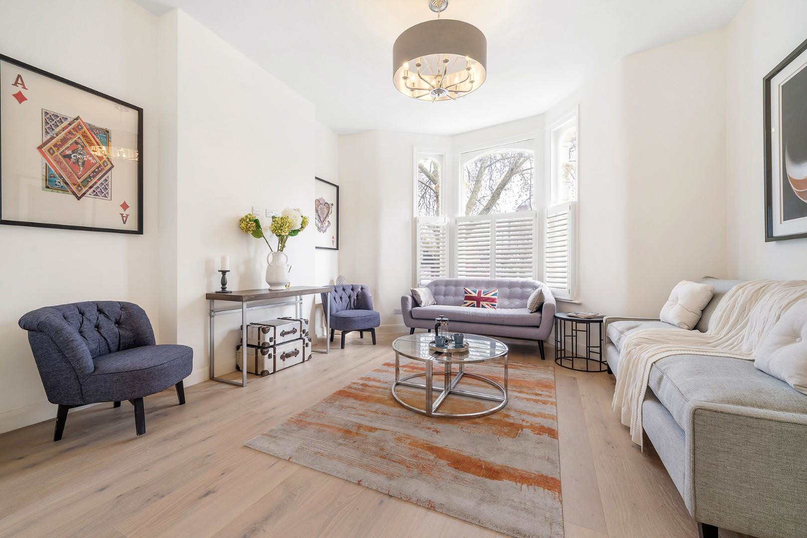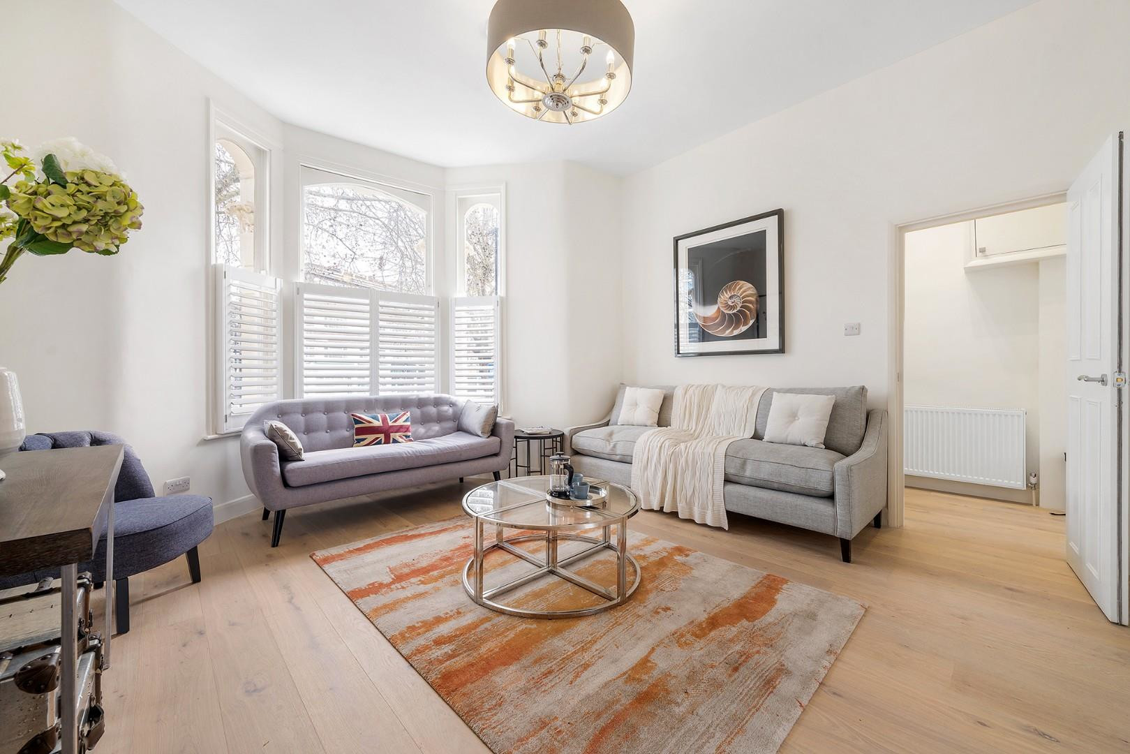 Occupying the entire raised ground floor, the reception and kitchen are seamlessly connected via contemporary whitewashed flooring, which flows throughout in a chic and cohesive palette. The reception room is elegantly positioned to the front of the property, nestled behind a charming arched sash bay window fitted with bespoke plantation shutters on the lower half. This clever detail ensures privacy without compromising the influx of natural light, highlighting the reception room’s generous proportions at nearly five metres in length.