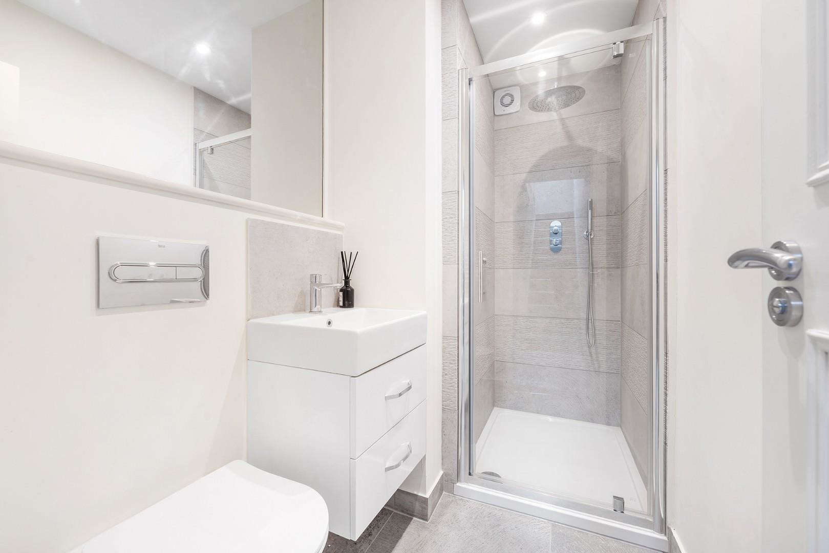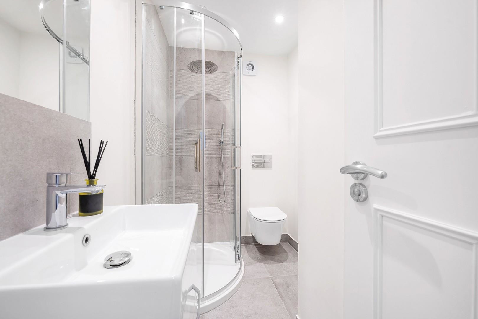 Downstairs, both bedrooms are generous doubles, tucked away from the neighbours, promoting an enviable sense of tranquillity. Each bedroom is stylishly presented with freshly laid carpets and fitted wardrobes. The principal bedroom enjoys the added luxury of a sleek en-suite shower room, while the second bedroom offers peaceful views over the decked terrace. A further bathroom serves the home from the same level, finished in crisp, neutral tones and complete with a walk-in rain shower.