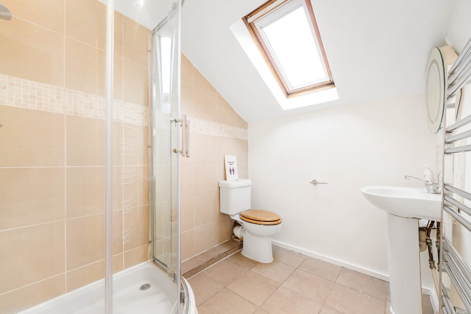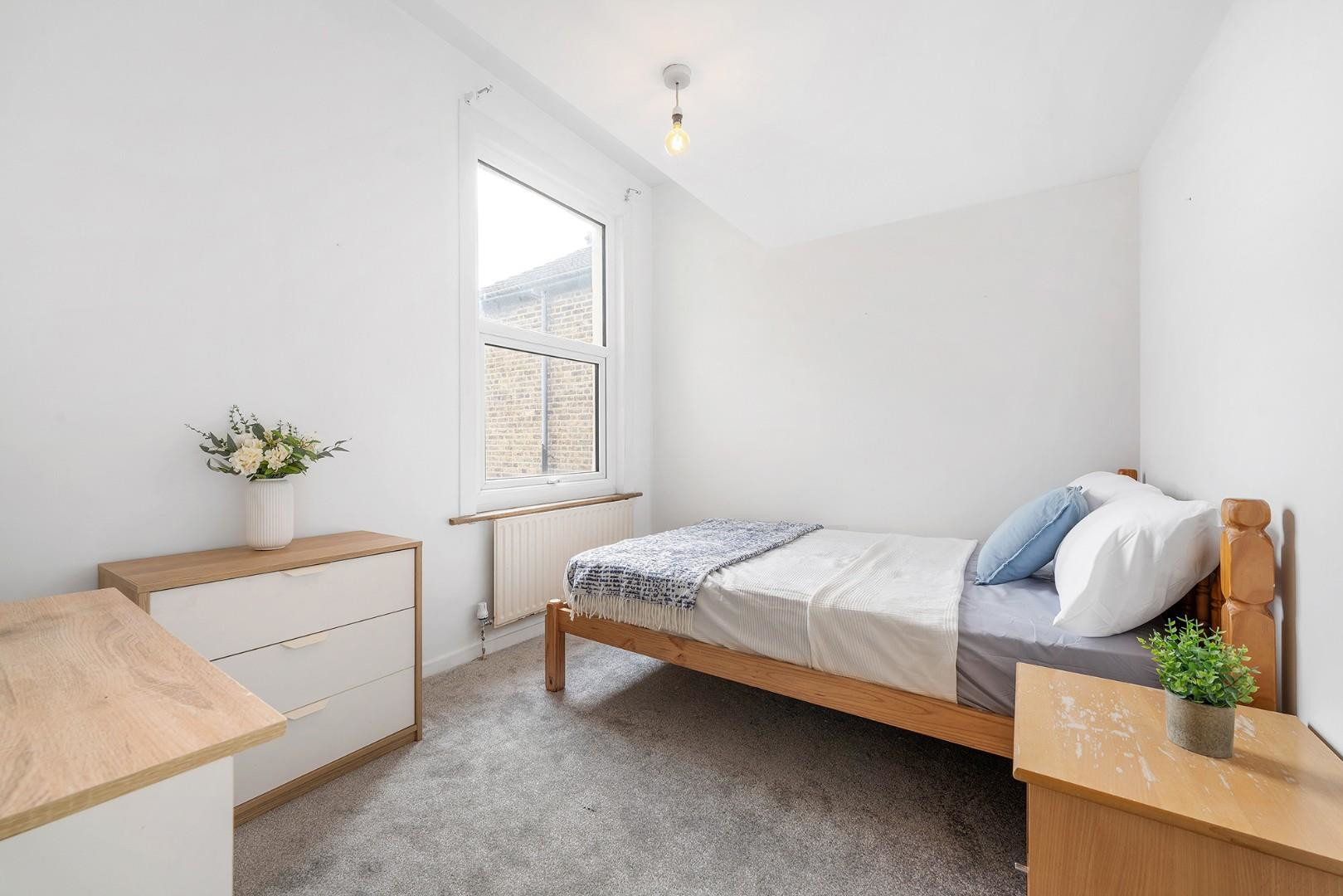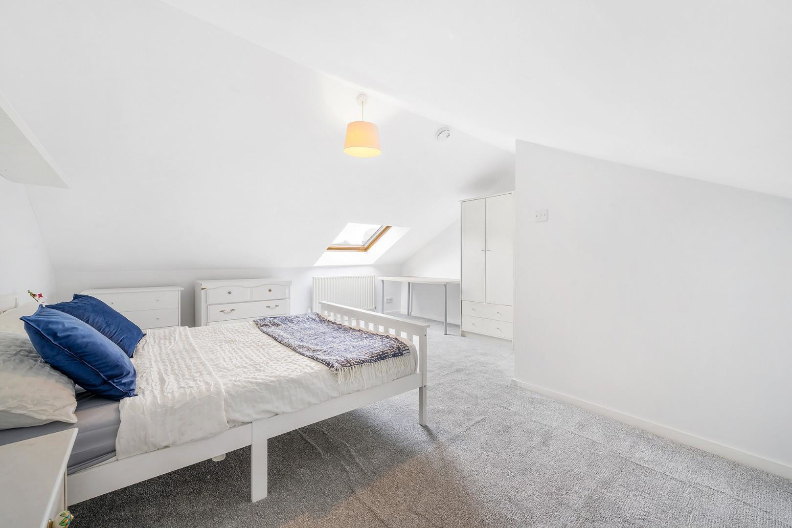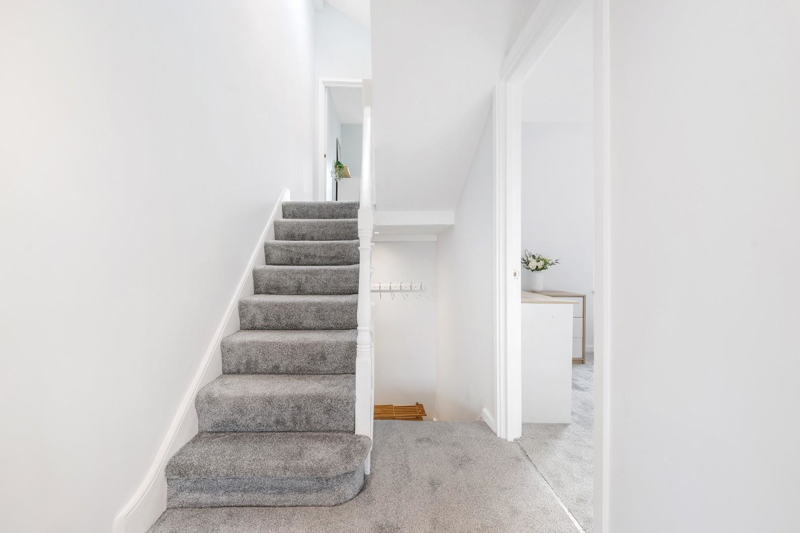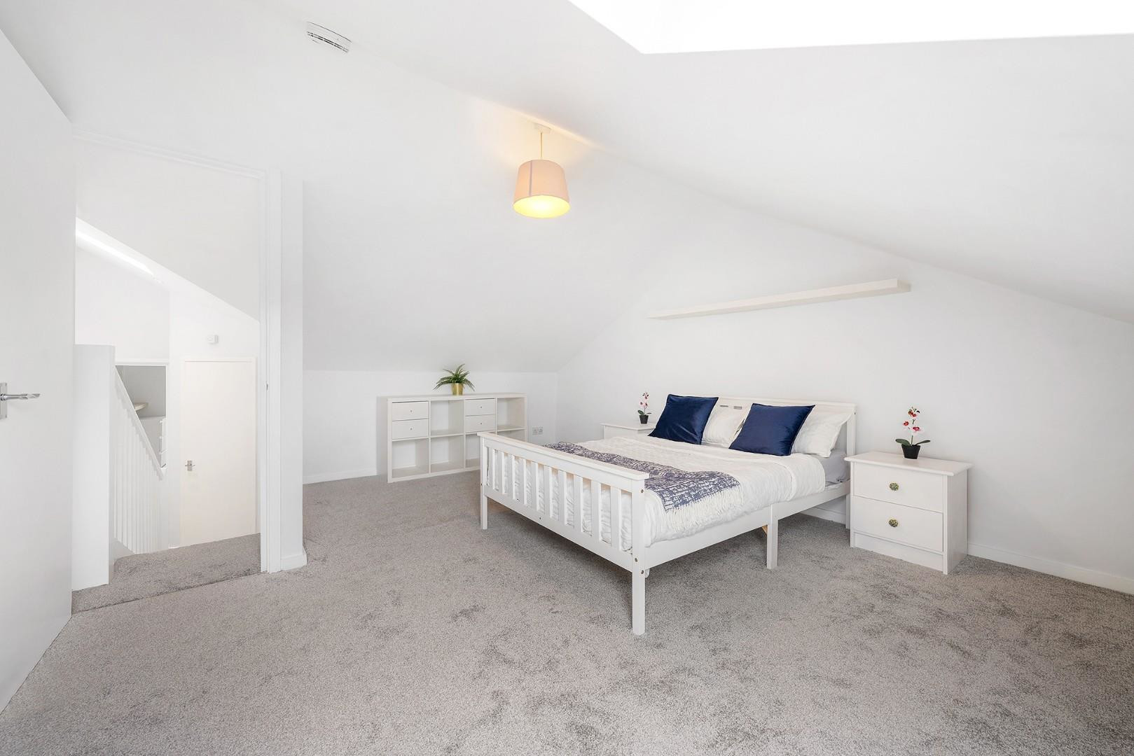 The accommodation comprises three well-proportioned bedrooms, with every bedroom separated from one another for a desirable level of privacy. The principal bedroom is particularly generous, occupying the top floor and offering a bright, airy retreat with plenty of room for furniture or storage. The second double bedroom is also spacious and bright, nestled to the rear of the home with leafy views, while the third bedroom is set below with similar outlook, still with the proportions to accommodate a comfortable bed yet also providing flexibility to be repurposed if all three bedrooms aren’t required. A neutral family bathroom serves the home, conveniently positioned on the upper level between the two largest bedrooms.