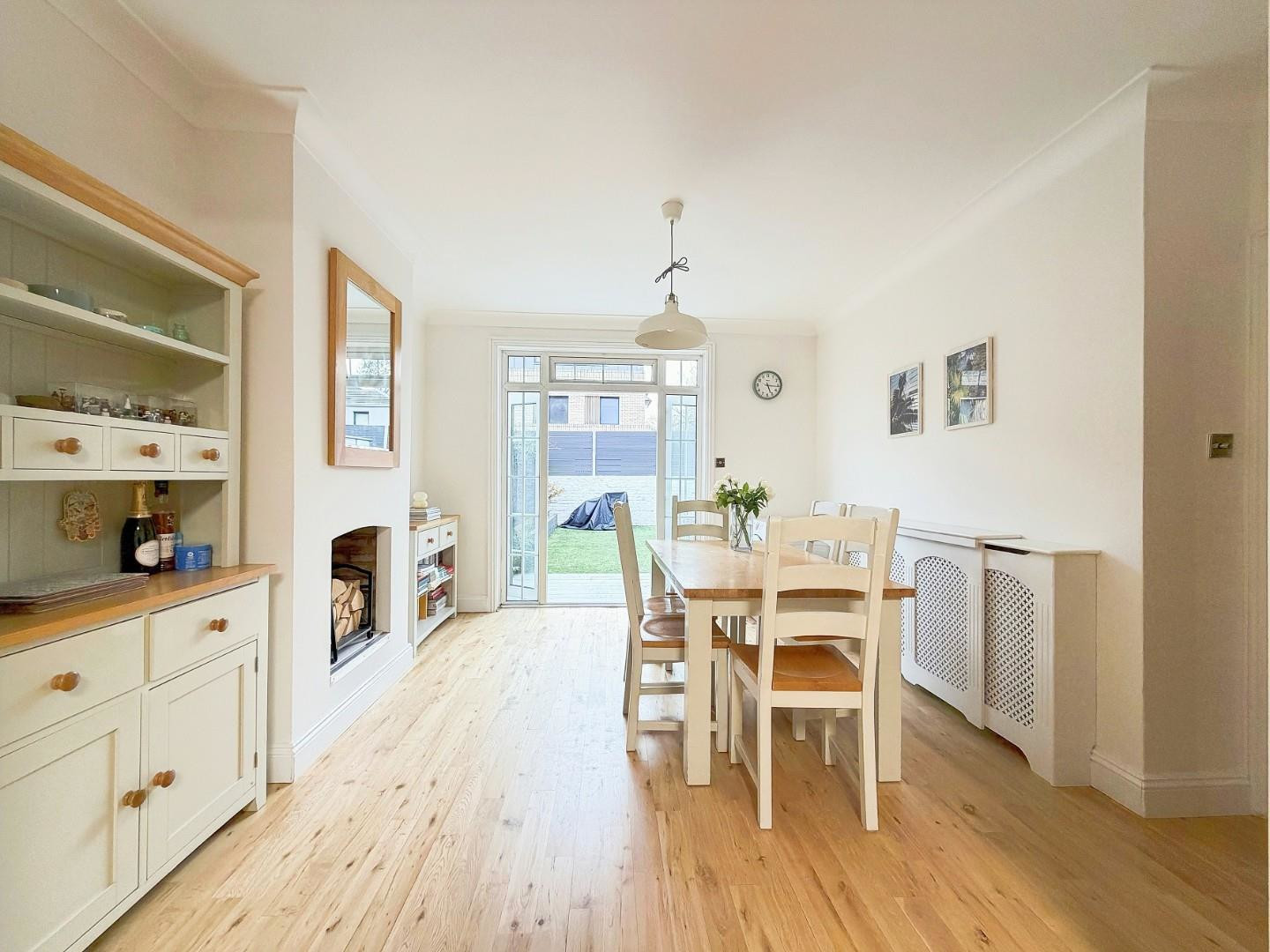 The ground floor opens into a beautifully presented double reception room, featuring a square bay window to the front that floods the space with natural light, while French doors to the rear lead seamlessly out to the garden. This spacious and flexible room offers ample space to relax in a comfortable lounge area or entertain guests around a dining table, all finished in calming, neutral tones.