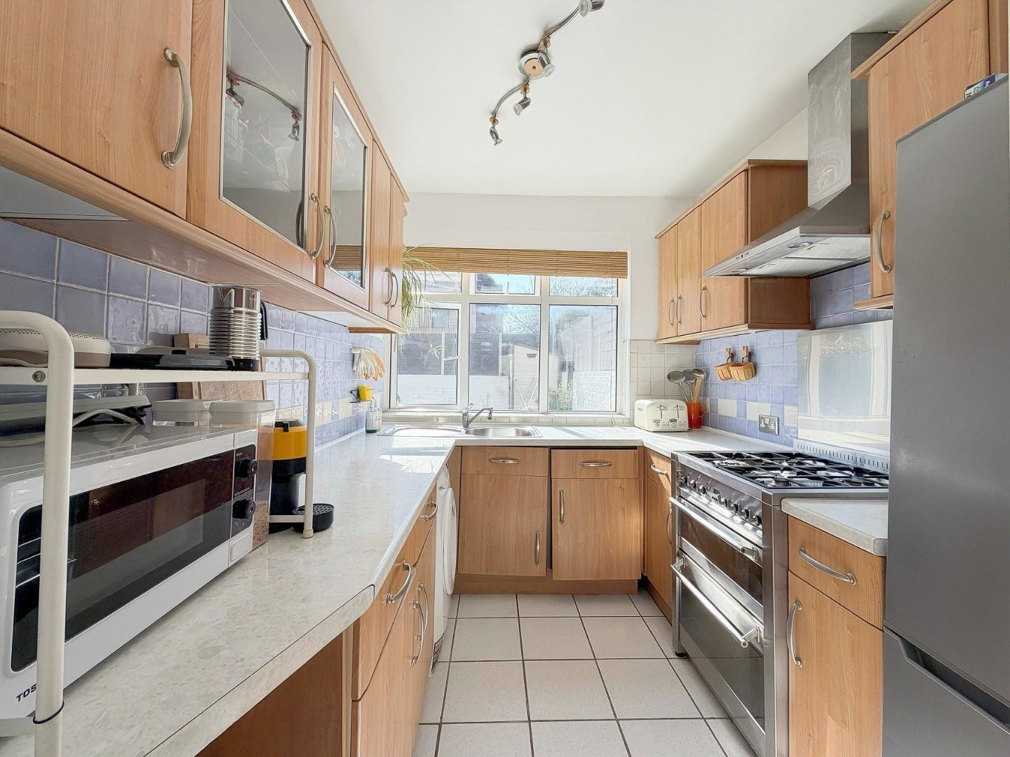 To the rear, a separate kitchen provides a practical and well-appointed space to cook, with wrap-around cabinetry offering generous storage. A large window above the sink frames pretty views of the garden, enhancing the bright and airy feel.