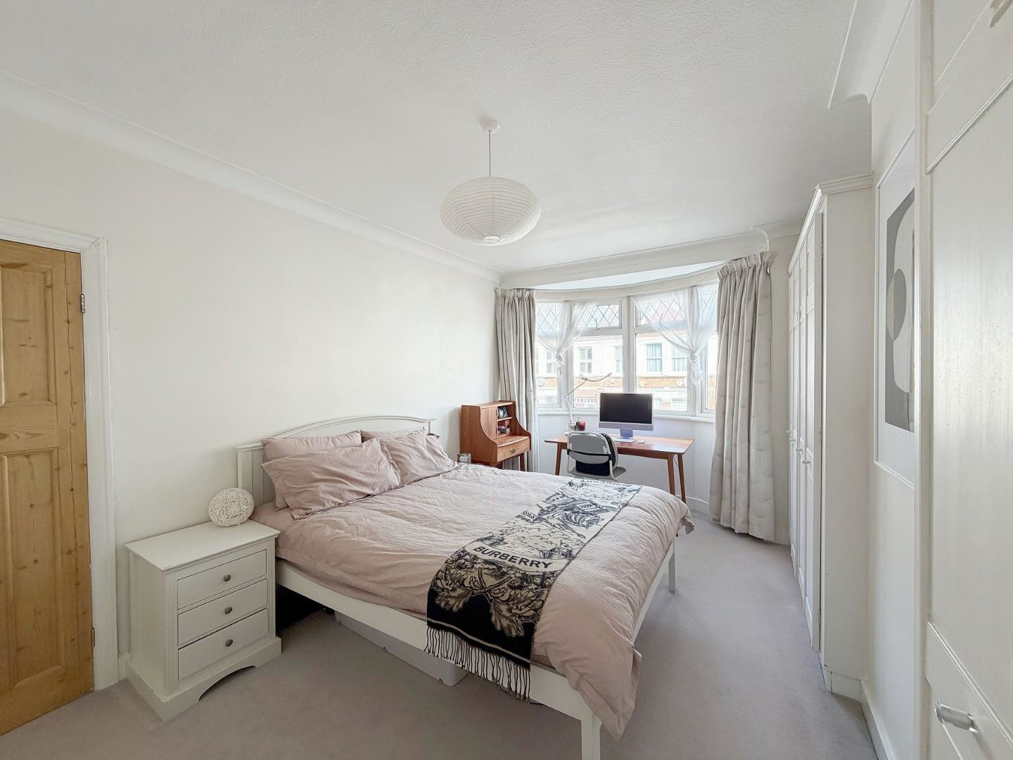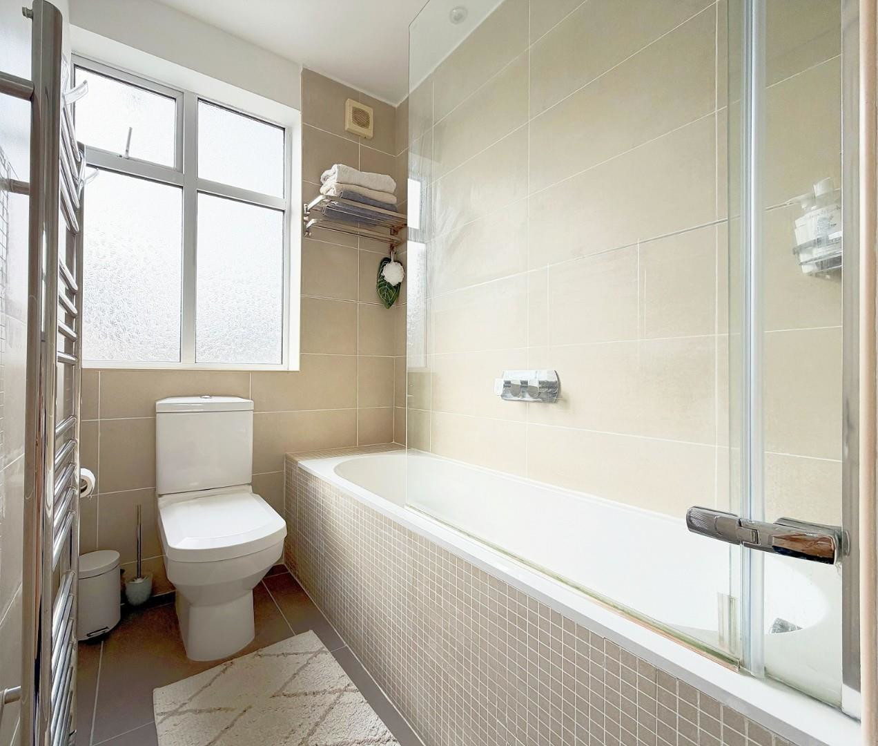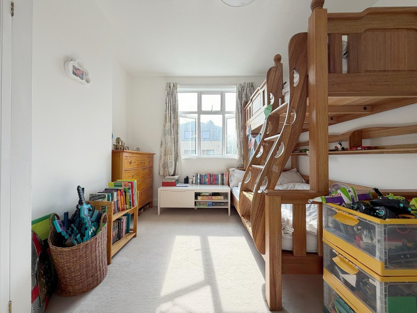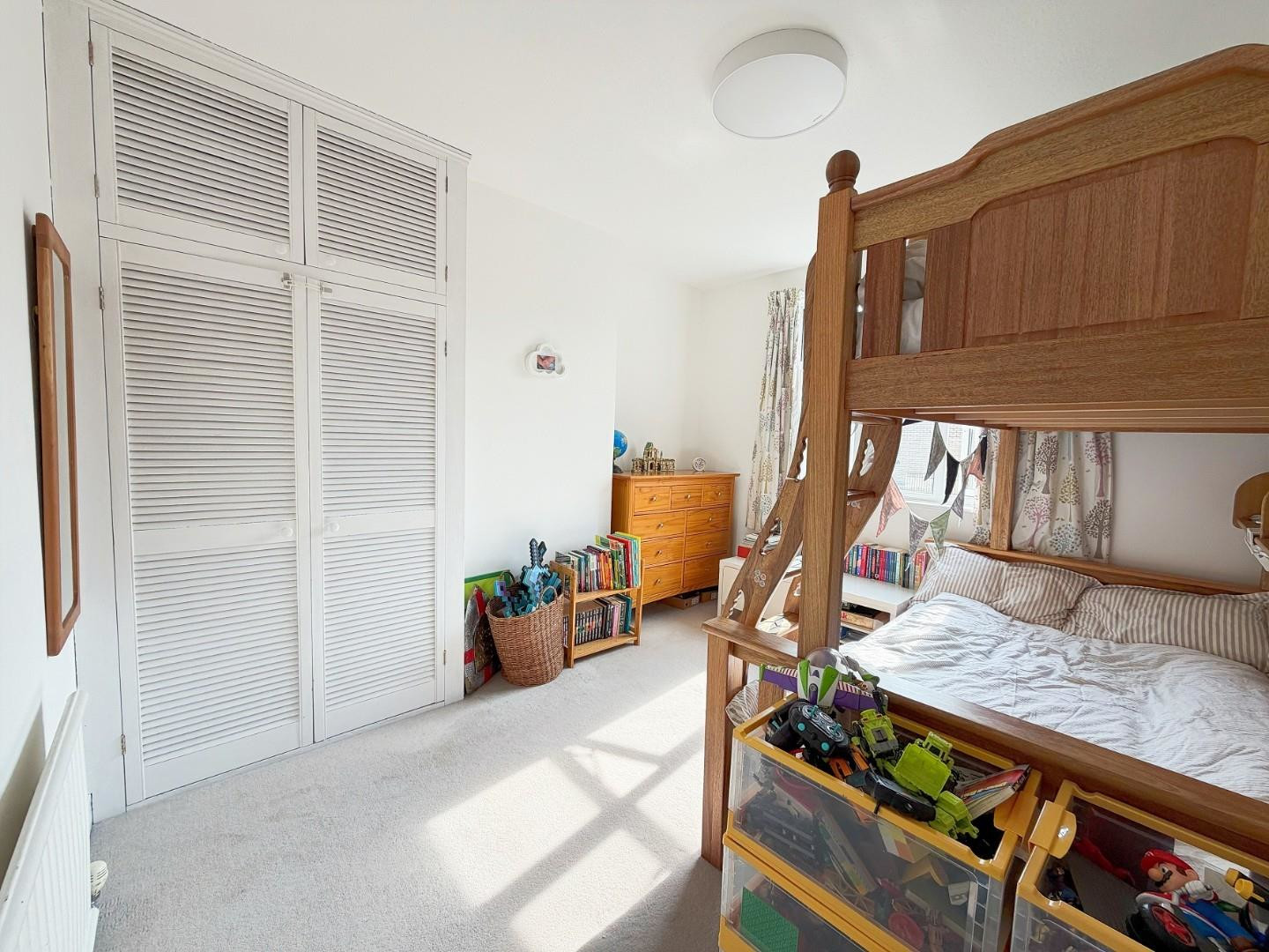 Upstairs, three well-proportioned bedrooms are arranged across the first floor. The principal bedroom is particularly spacious, boasting plenty of fitted wardrobes and a charming curved bay window, ideal for a desk or dressing table. The second bedroom is another generous double, set to the rear with pleasant garden views and fitted wardrobes, currently arranged as a children’s bedroom. The third bedroom offers excellent versatility, currently a guest room and home office. A family bathroom serves all bedrooms, complete with fitted storage and a shower over the bathtub, in additional to a second WC.