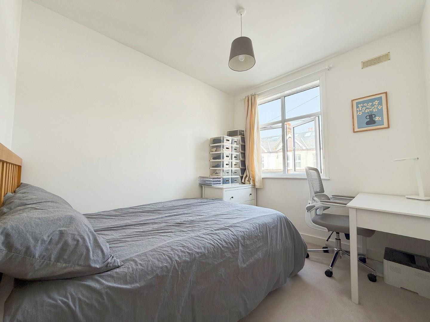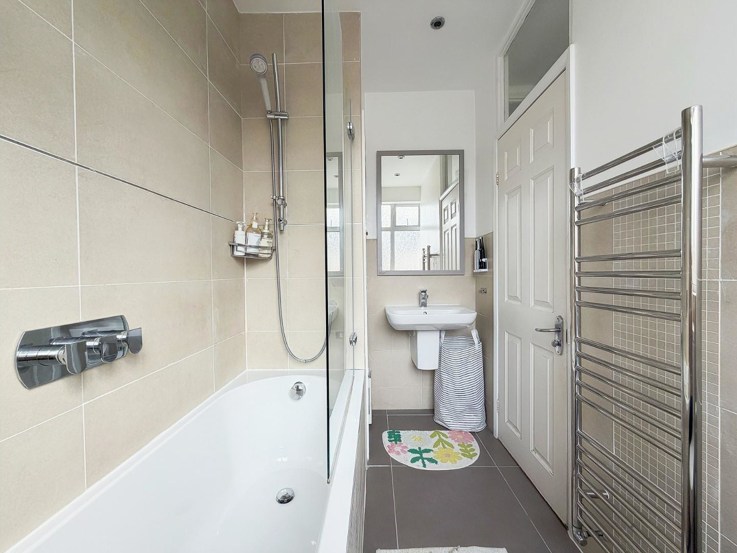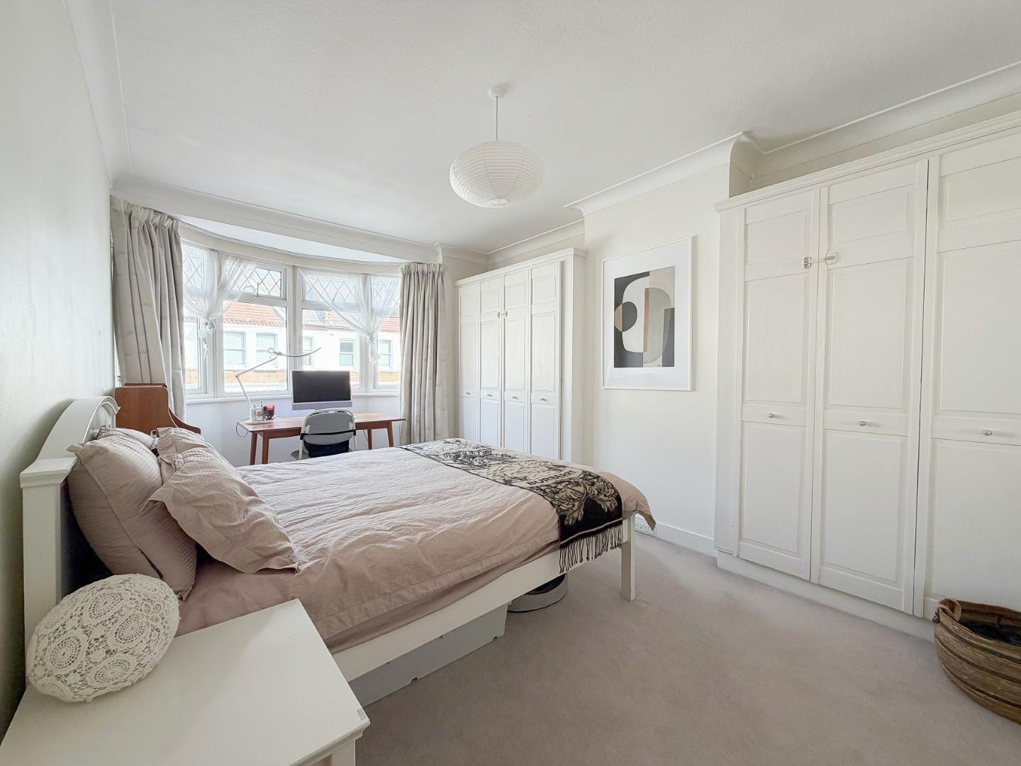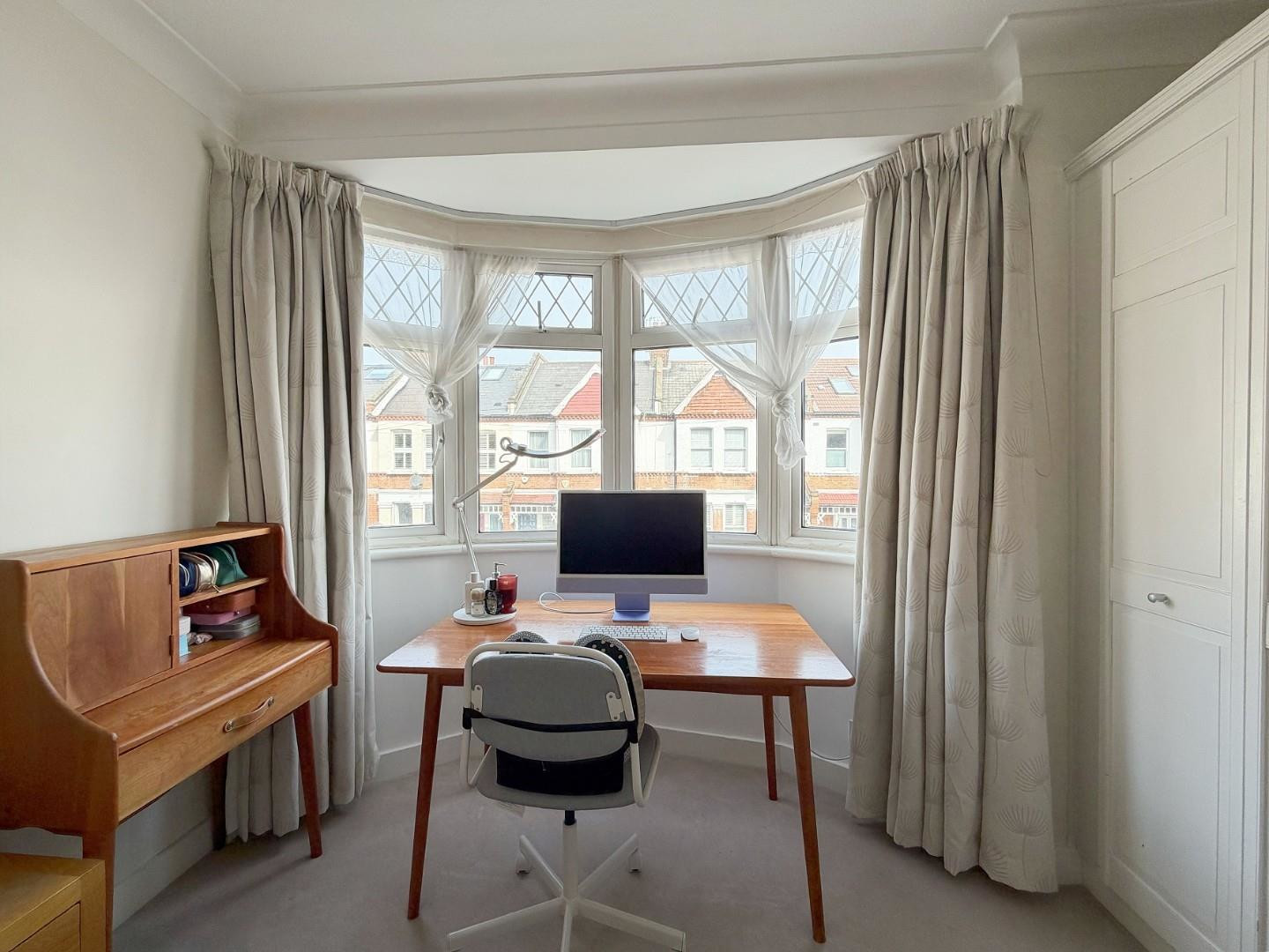 Upstairs, three well-proportioned bedrooms are arranged across the first floor. The principal bedroom is particularly spacious, boasting plenty of fitted wardrobes and a charming curved bay window, ideal for a desk or dressing table. The second bedroom is another generous double, set to the rear with pleasant garden views and fitted wardrobes, currently arranged as a children’s bedroom. The third bedroom offers excellent versatility, currently a guest room and home office. A family bathroom serves all bedrooms, complete with fitted storage and a shower over the bathtub, in additional to a second WC.