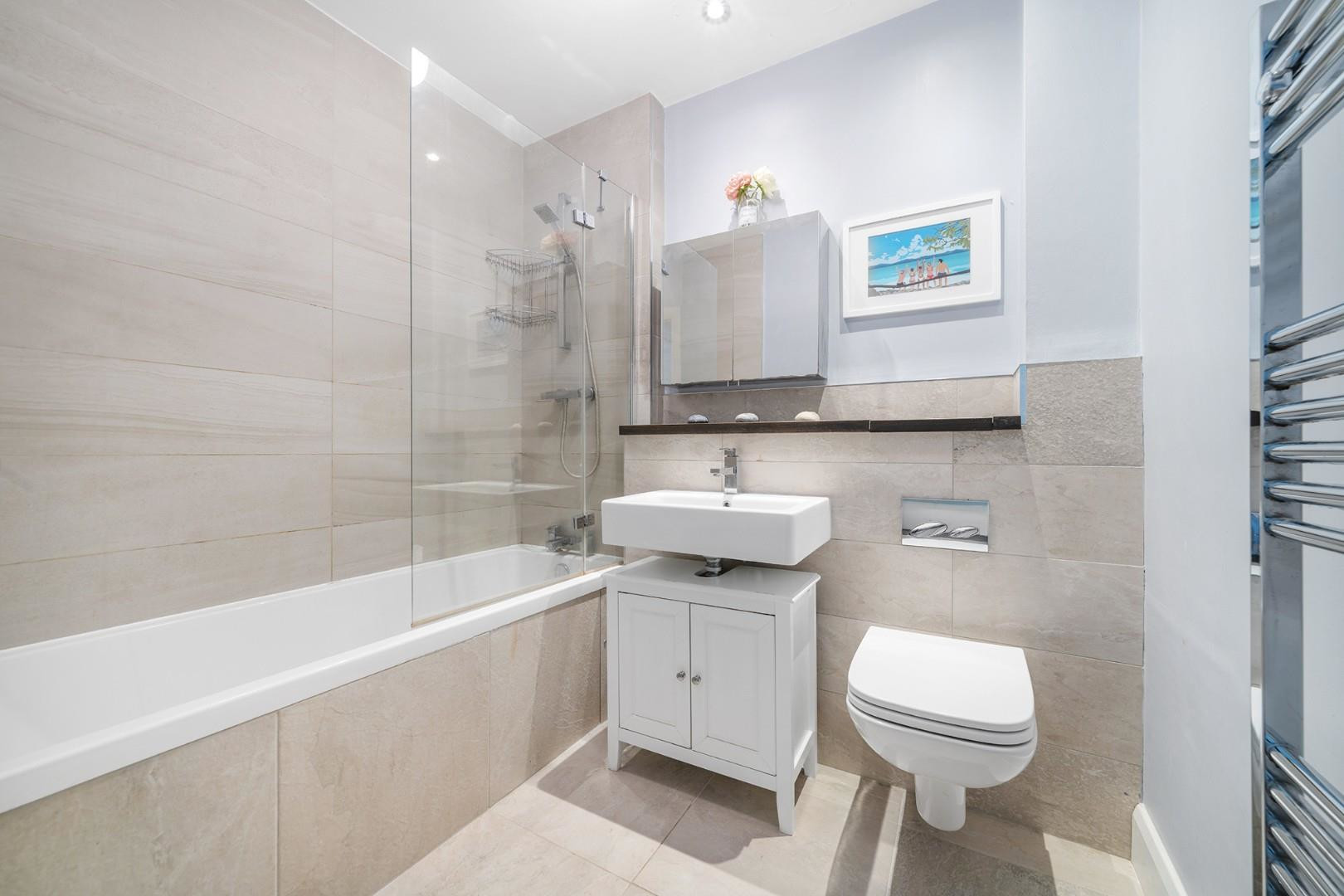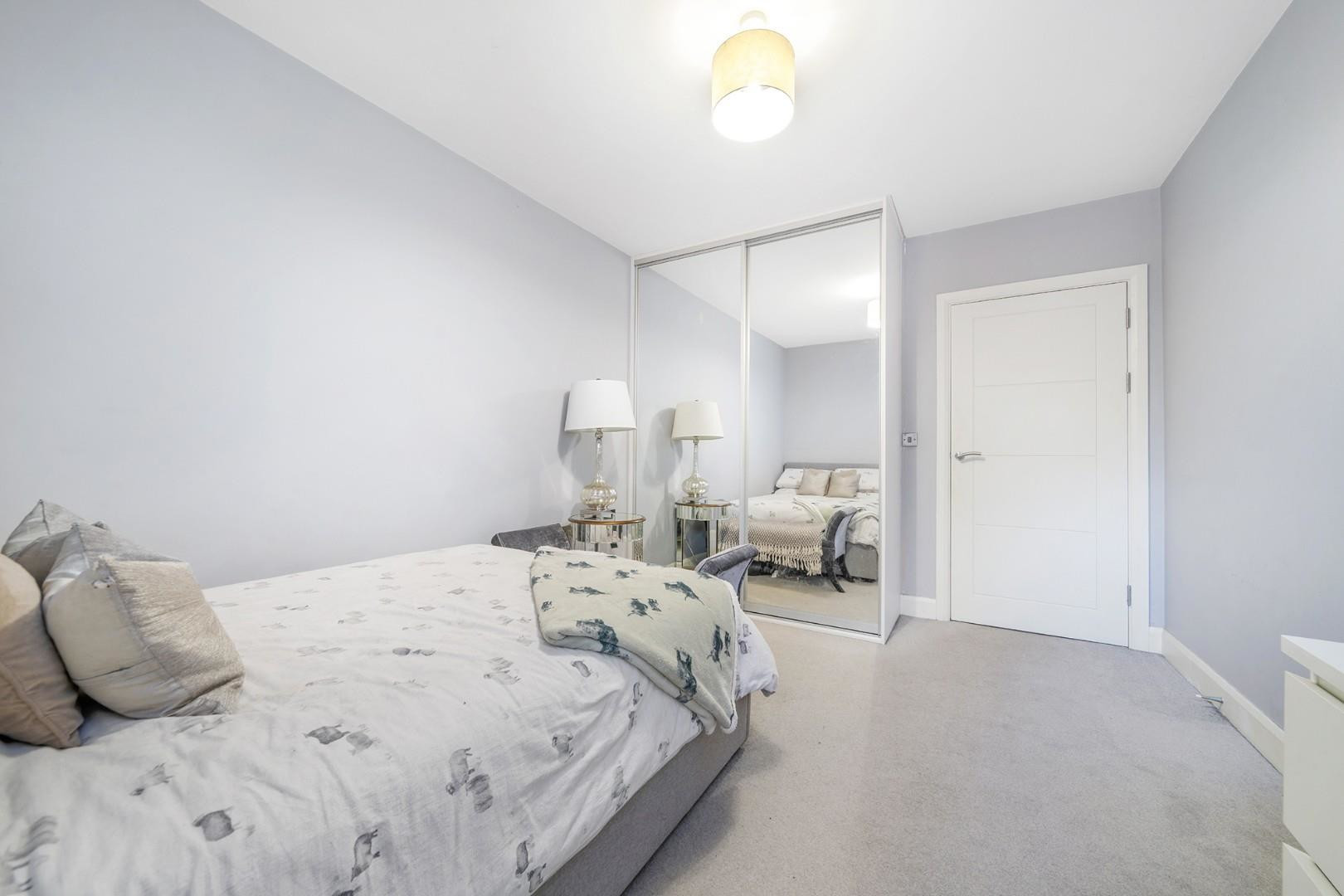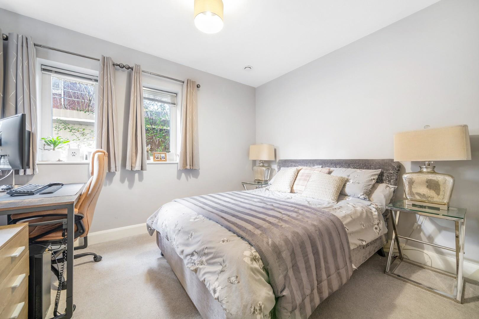 Both bedrooms are well-proportioned doubles, each benefitting from plush carpeting and fitted wardrobes, positioned separately to ensure privacy. The bathroom has been finished to an impeccable standard, featuring sleek contemporary fittings and extensive stone tiling for a luxurious, spa-like feel.