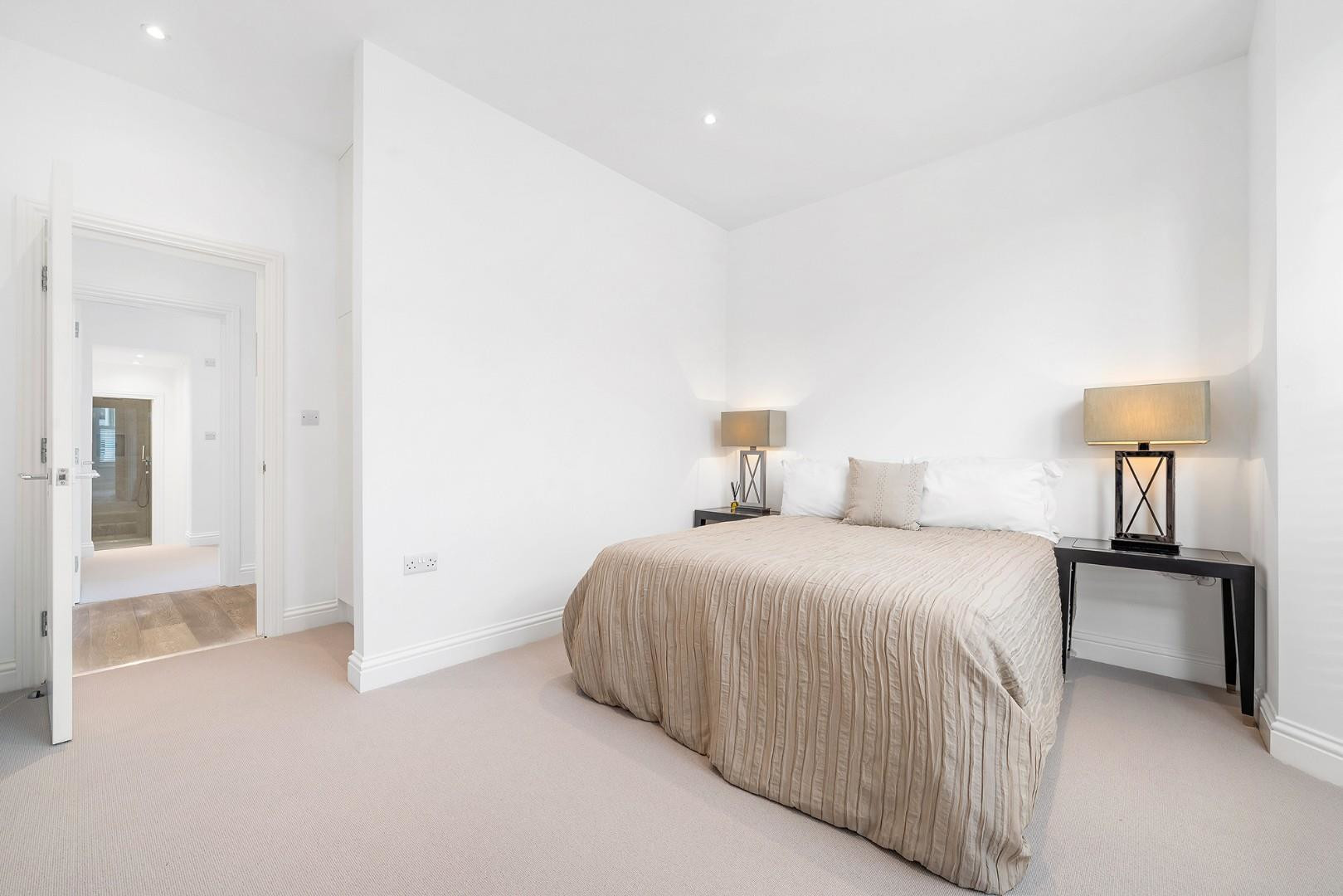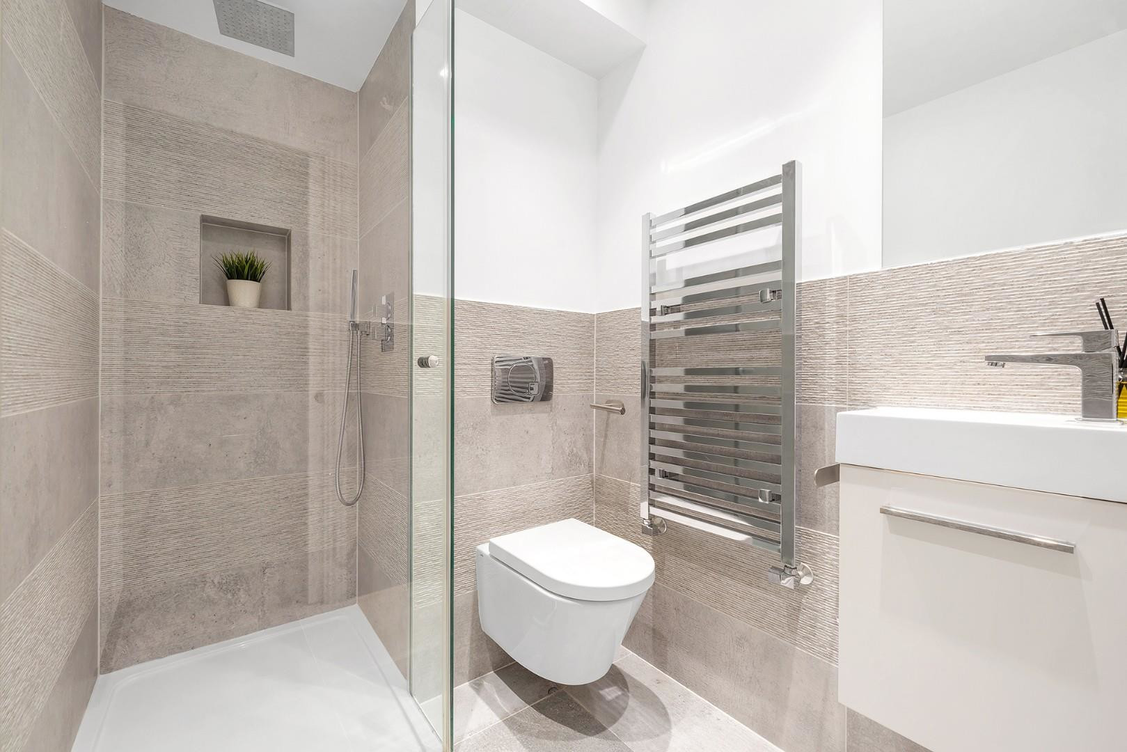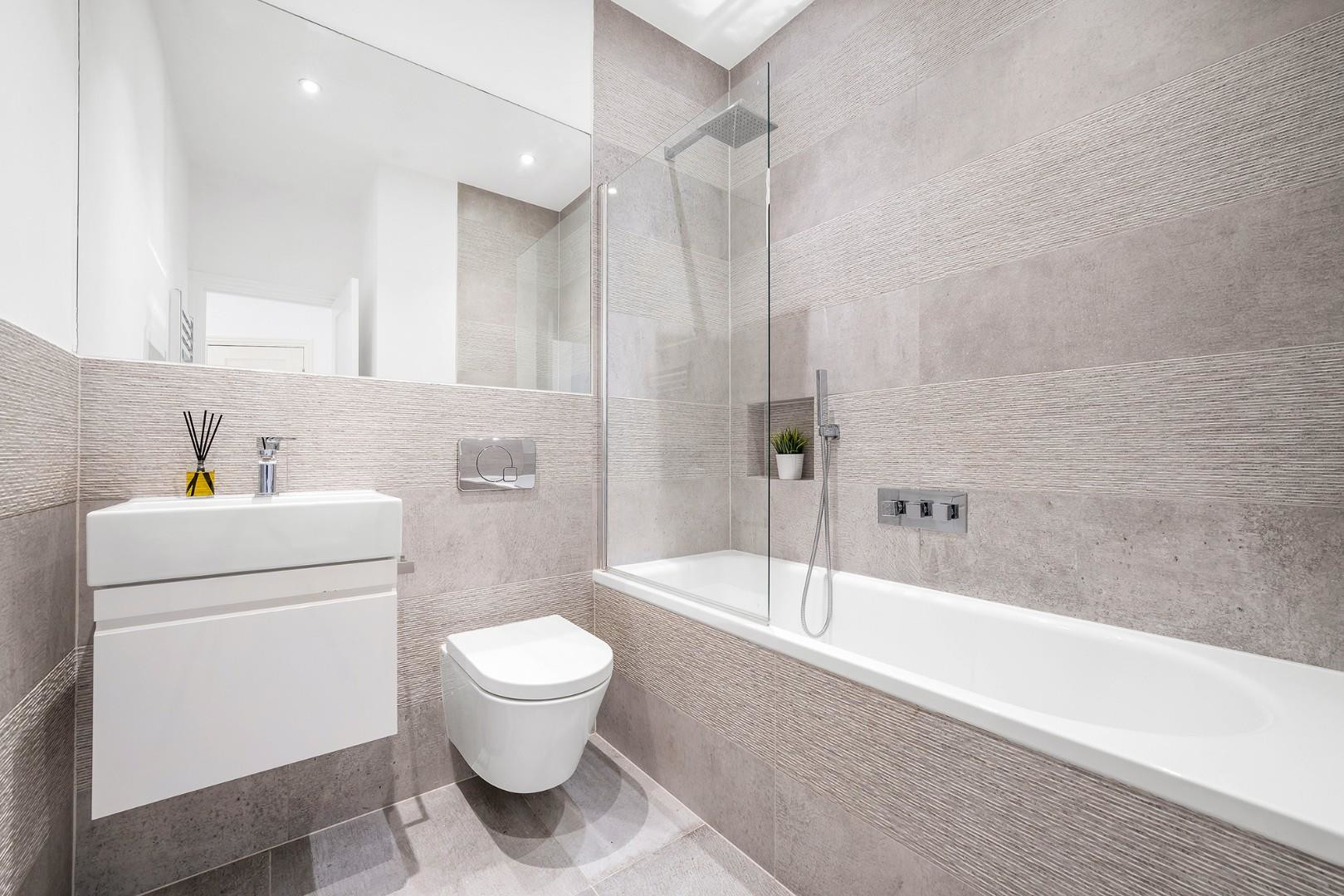 The two double bedrooms are separated from one another, enhancing privacy. The principal suite is quietly positioned in the centre of the home, overlooking the courtyard, and benefits from a walk-through wardrobe leading into a stylish en-suite shower room. The second bedroom is equally well-proportioned, set behind a charming bay window framed by plantation shutters offering privacy without interrupting the flow of light. Presented in soothing neutral tones, this bedroom features fitted wardrobes and is conveniently set next to the main bathroom. This stylish bathroom is contemporary and beautifully finished, featuring large textured tiles, fitted storage, and a shower over the bathtub.