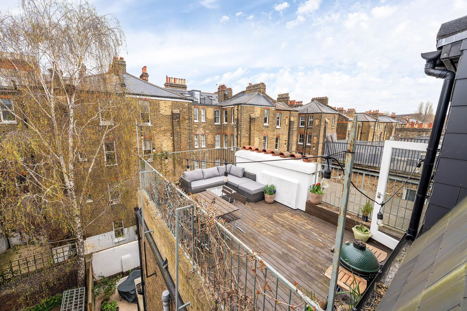 A real highlight of the home is the expansive private roof terrace, a superb outdoor space with ample room for both dining and lounging. Thoughtfully arranged with seating areas, this impressive balcony terrace is perfect for entertaining or unwinding in the summer sun.