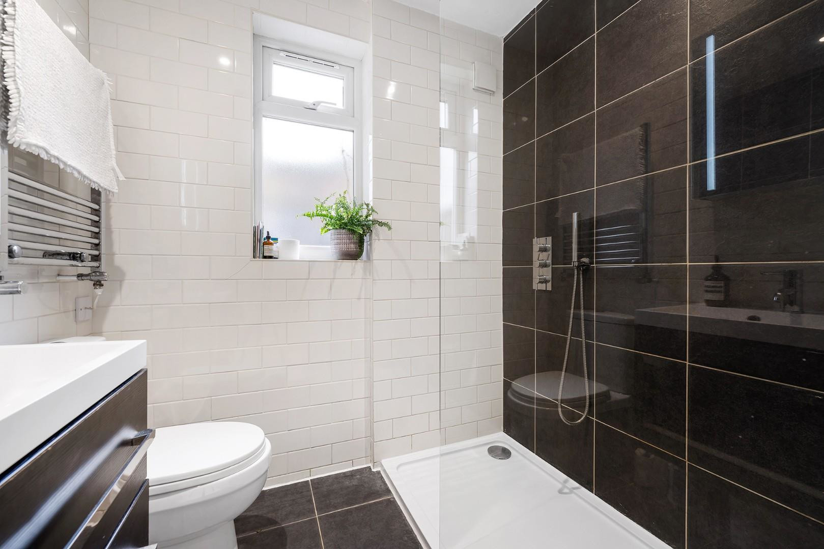 Back downstairs, the further two double bedrooms are both nestled peacefully to the rear of the home with leafy views. The second bedroom features a charming fireplace, with fitted storage and wardrobes on either side, whilst the third bedroom also boasts generous fitted wardrobe space and a striking feature wall. A second bathroom sits conveniently between these bedrooms, with tasteful monochrome tiling and a walk-in rain shower.