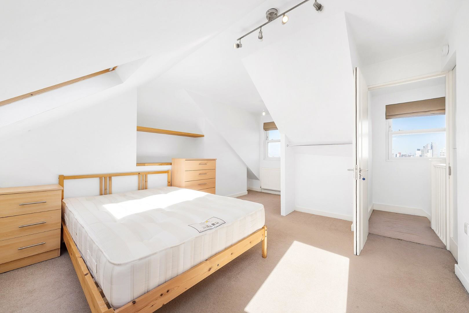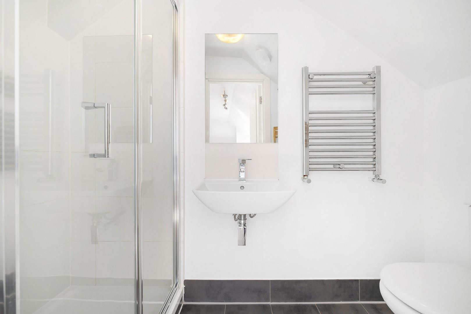 The accommodation comprises two bedrooms, thoughtfully separated on separate floors. The principal bedroom occupies the top floor, a characterful and inviting space with lofted ceilings creating a cosy feel and skylights that bathe the room in natural light. Elevated above the surrounding buildings, this room enjoys pleasant rooftop views, enhancing the sense of privacy and retreat. Further benefits include an en-suite shower room, adding convenience to this top-floor suite.