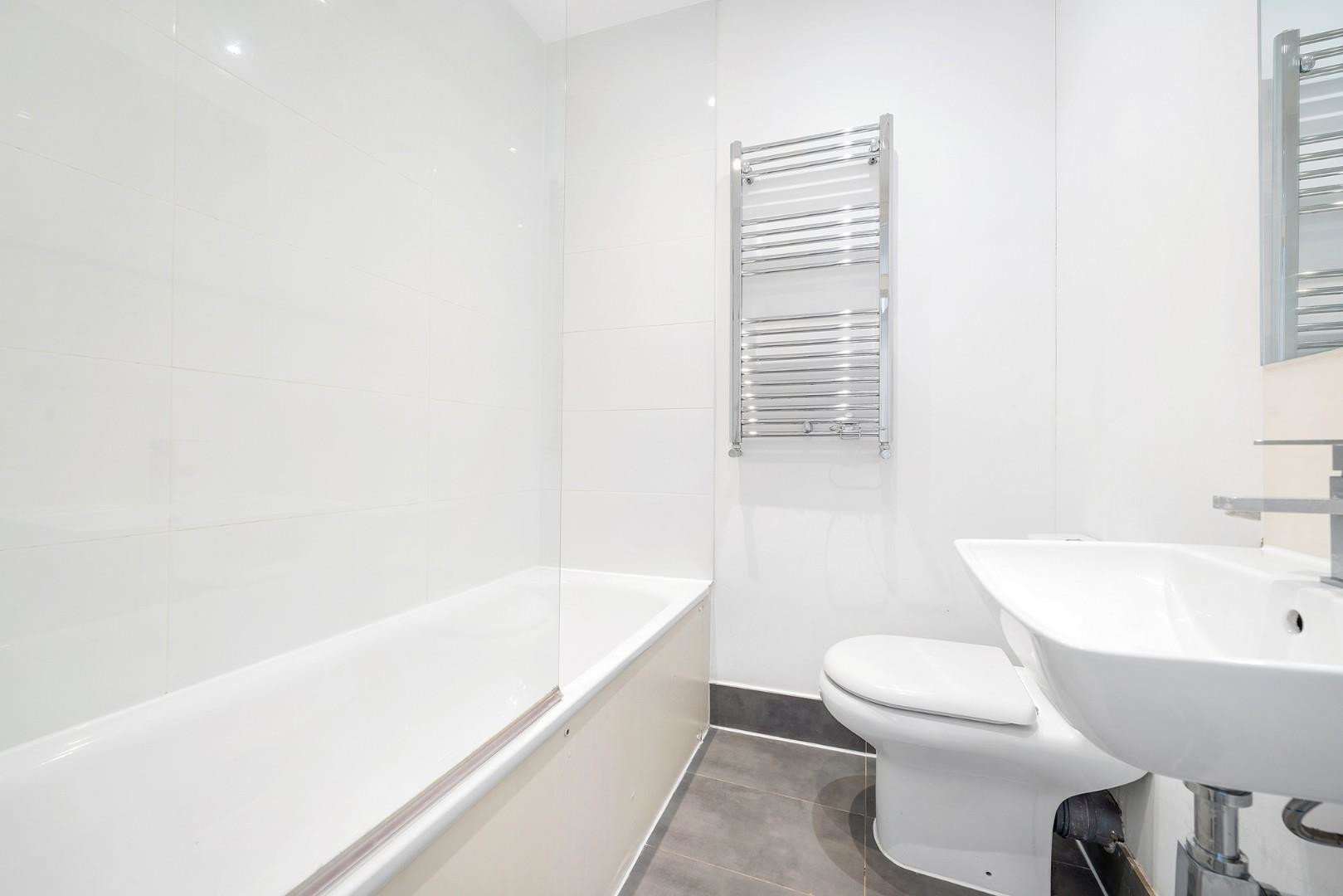 The second bedroom is positioned to the rear of the property, tucked away from the street to promote a sheltered and restful environment, ideal as a guest room and home office or indeed a second bedroom. This room is served by the main bathroom, which is fitted with a bathtub and overhead shower.