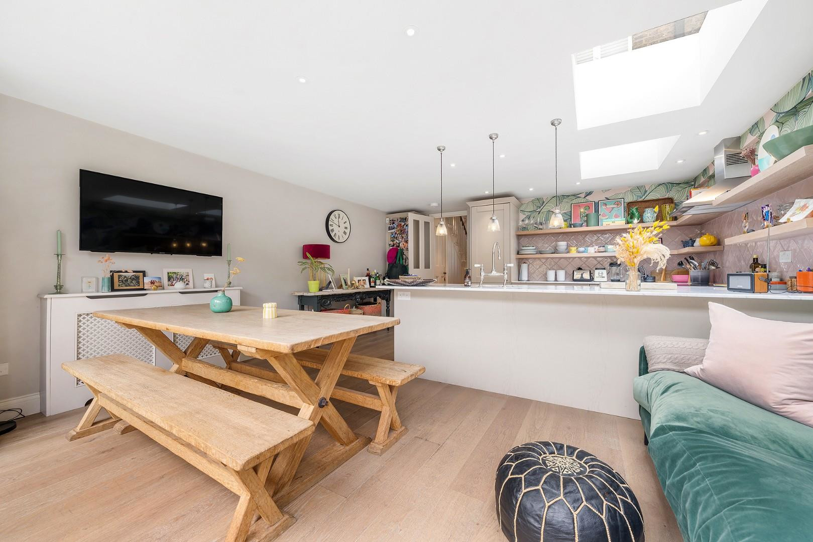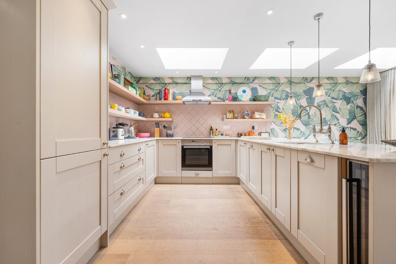 To the rear, the property has been thoughtfully extended to create a stunning kitchen and dining space, forming the true heart of the home. The kitchen is both practical and visually striking, with shaker-style cabinetry, stone worktops and open shelving, all complemented by colourful tiling and statement wallpaper. Large skylights and full-width bi-fold doors flood the space with light and seamlessly connect the indoors with the garden, perfect for both everyday living and entertaining. A separate utility area and a downstairs WC add further practicality.