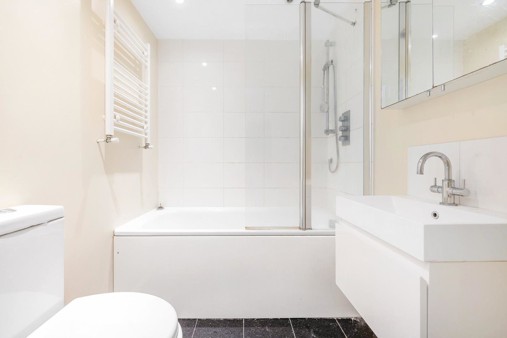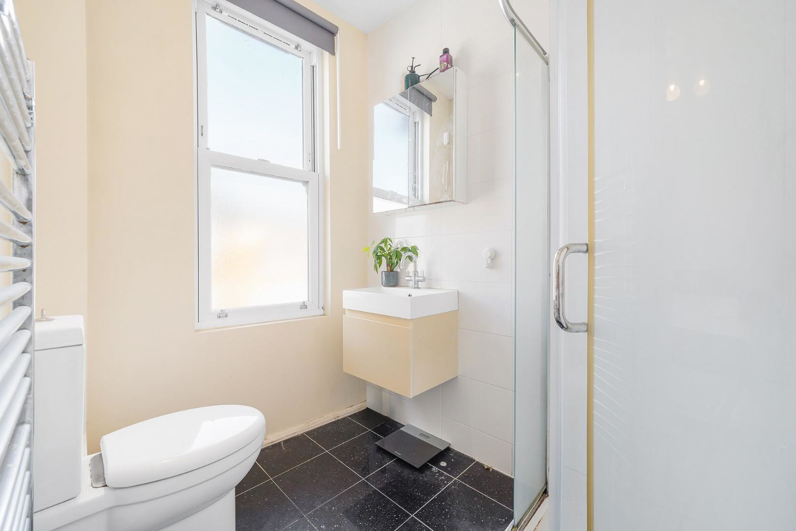 The apartment boasts two generously sized double bedrooms, both neutrally presented with high ceilings and cosy carpets, enhancing the sense of comfort and space. Thoughtfully arranged on opposite sides of the home, the bedrooms offer excellent privacy. The principal bedroom is set behind an attractive bay window, providing a charming nook ideal for a desk, dressing table or window seat, and further benefits from a modern en-suite shower room. The second bedroom is peacefully positioned to the rear, enjoying leafy views, and is serviced by a well-appointed main bathroom complete with a bathtub and overhead shower.