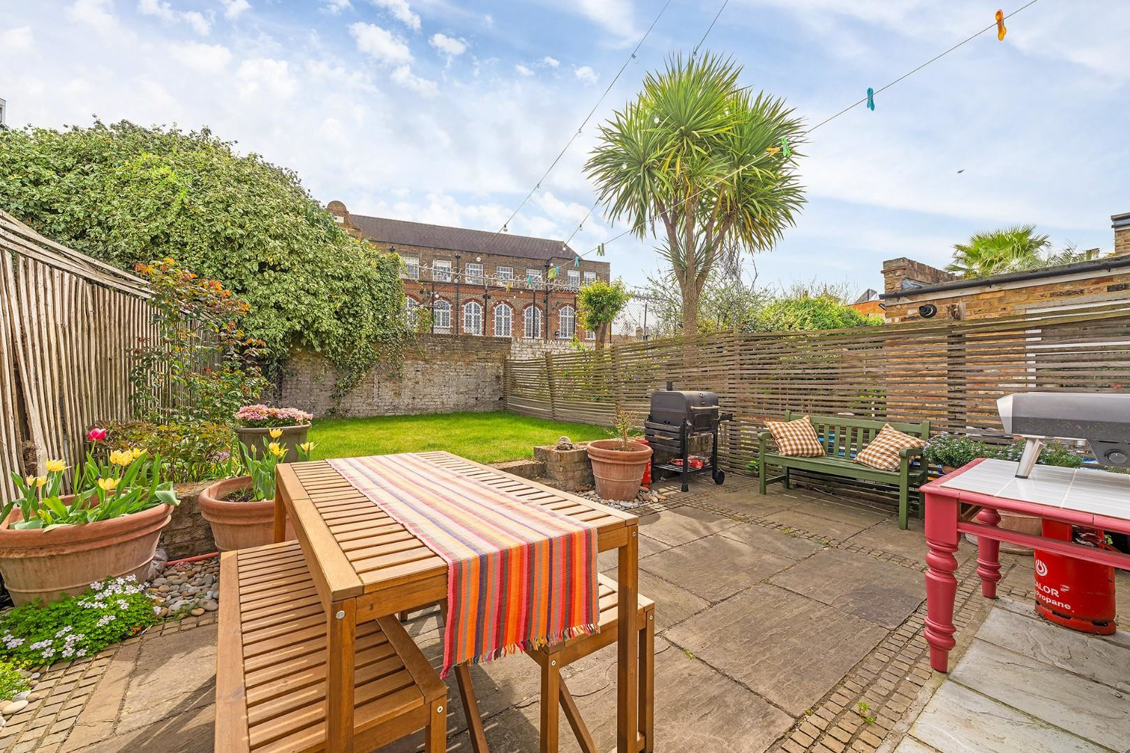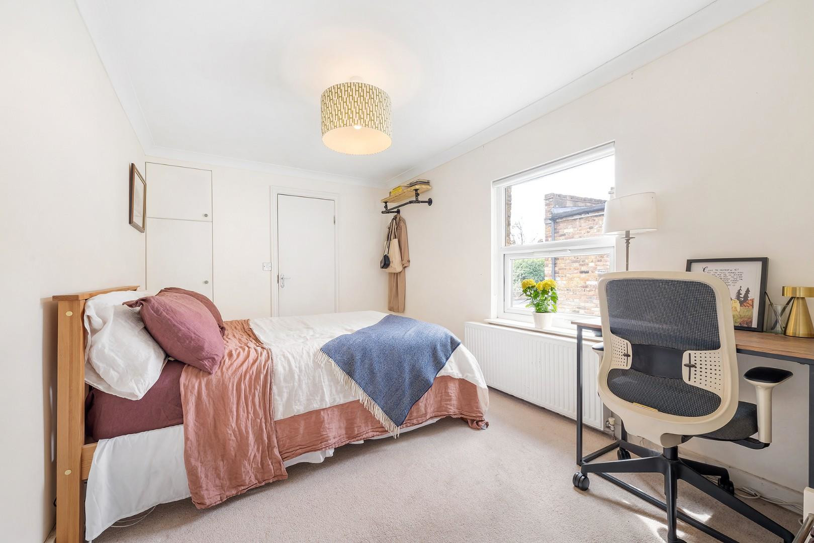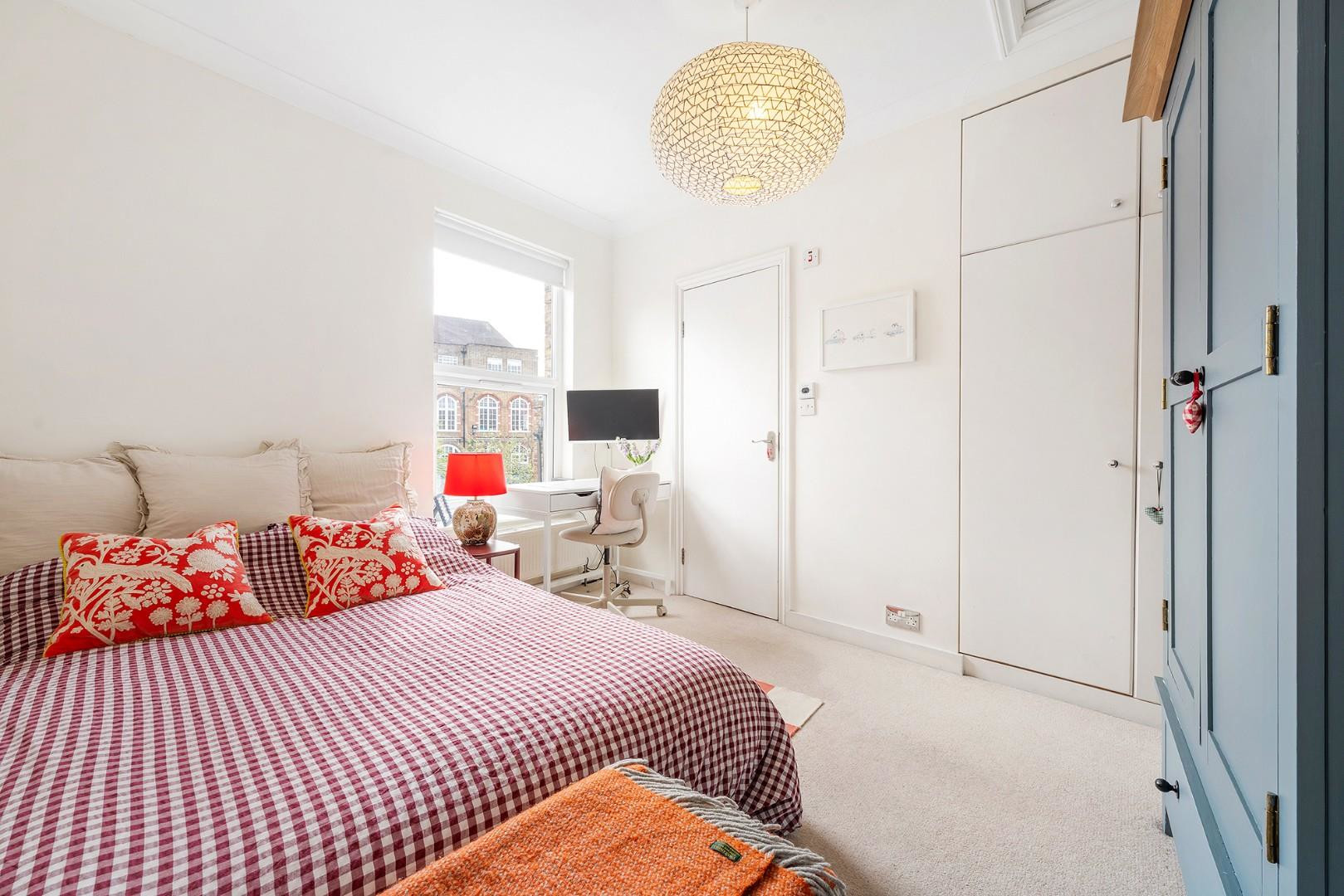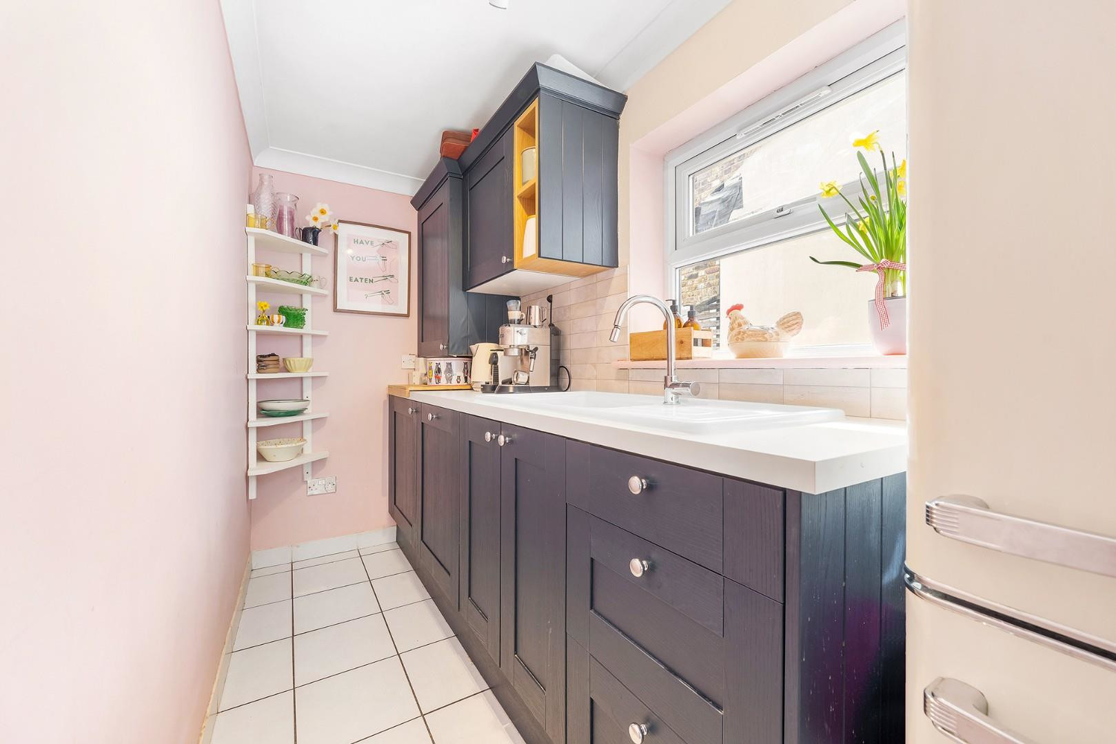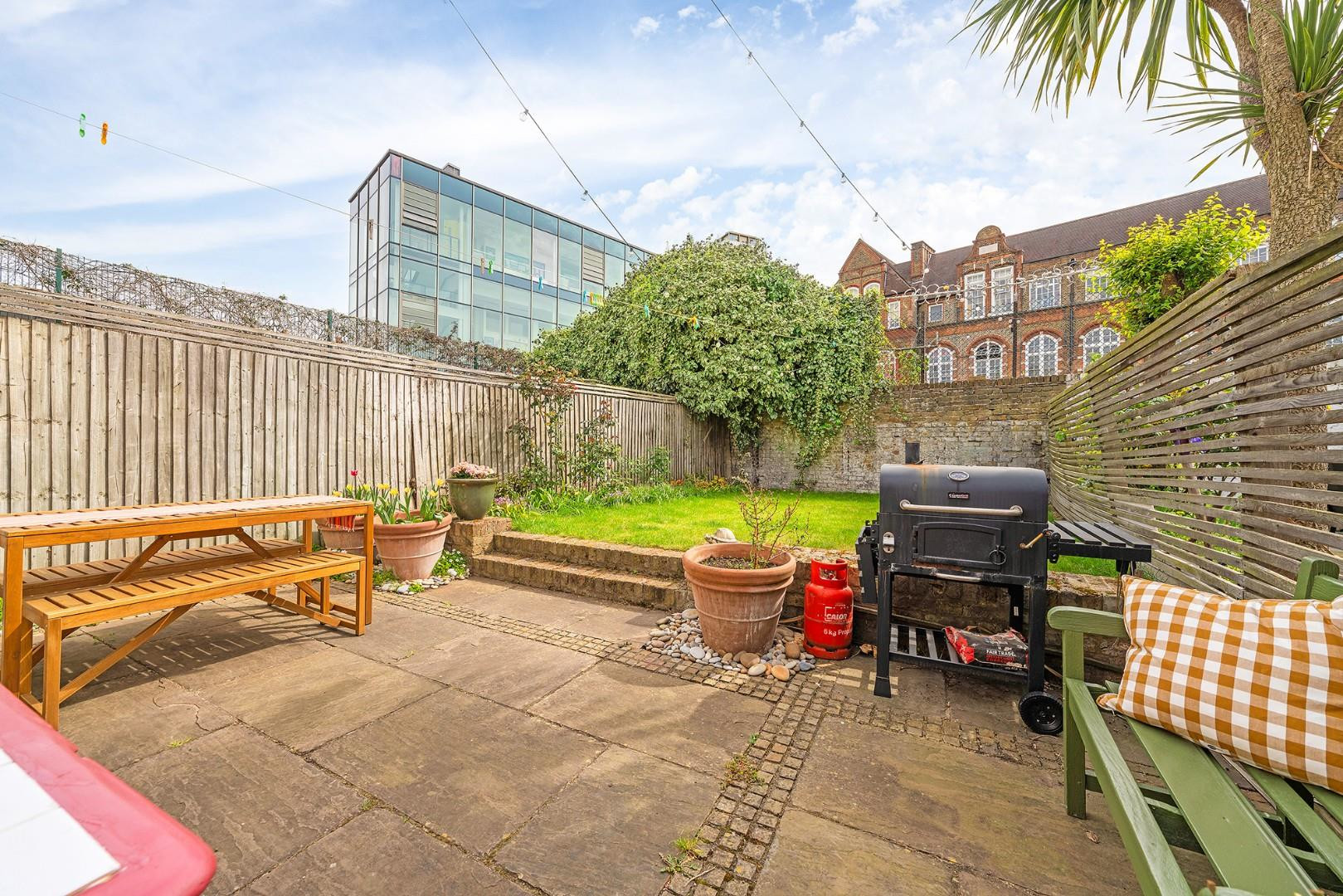 From the kitchen, doors lead directly out to the garden, providing a seamless indoor-outdoor flow. The garden has been thoughtfully maintained, with a recently laid lawn and established planting including peonies, roses and lavender, offering colour throughout the seasons. With a South-East facing aspect, the garden enjoys lots of sunlight throughout the day, and the presence of a school behind ensures a peaceful and private setting during evenings, weekends and holidays, ideal for both entertaining and unwinding.
